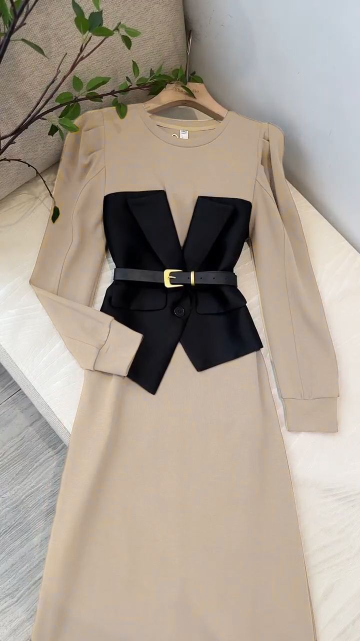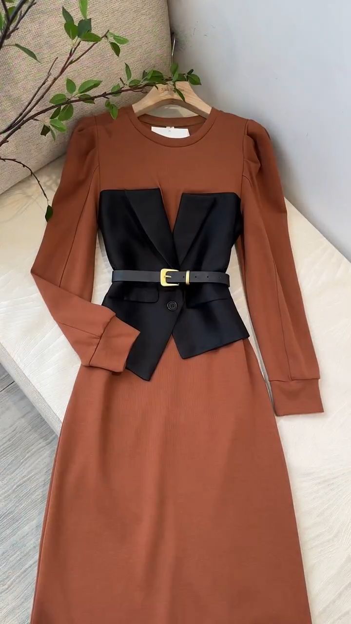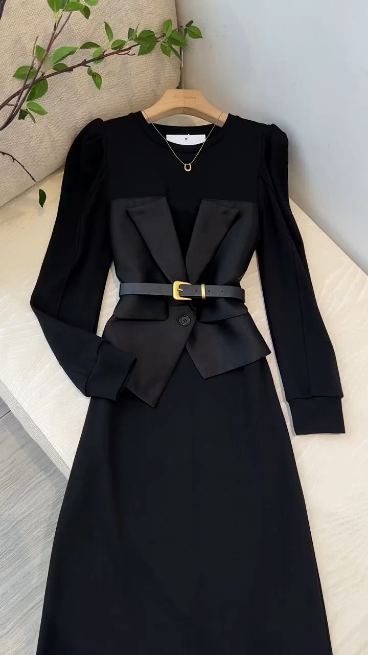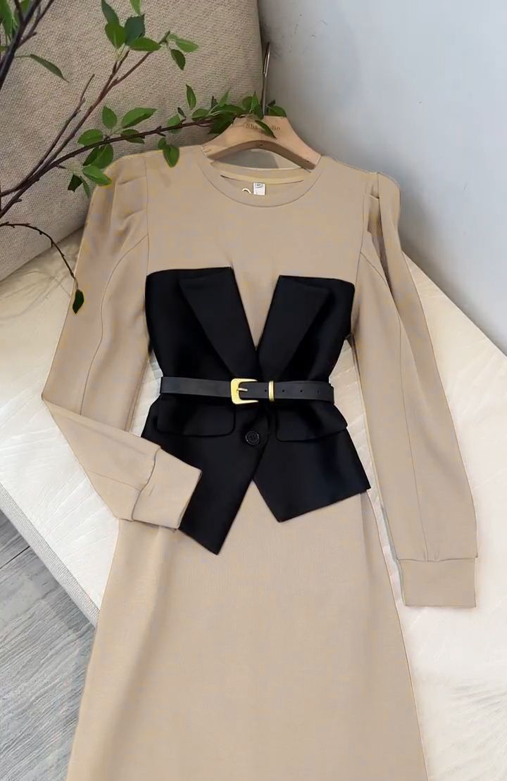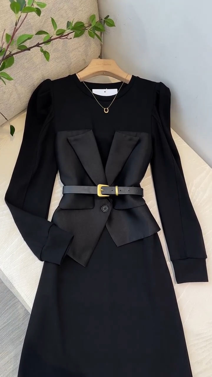 프랑스 왕실 자매 팬 OL 허리 디자인 센스 A 라인 스커트 여성 라운드 넥 패션 세련된 가짜 투피스 중간 길이 원피스스토어 가기