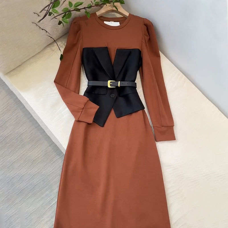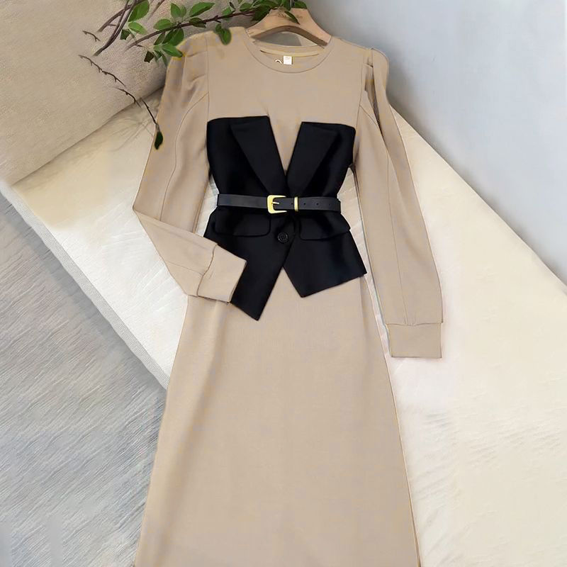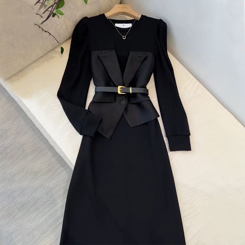 프랑스 왕실 자매 팬 OL 허리 디자인 센스 A 라인 스커트 여성 라운드 넥 패션 세련된 가짜 투피스 중간 길이 원피스