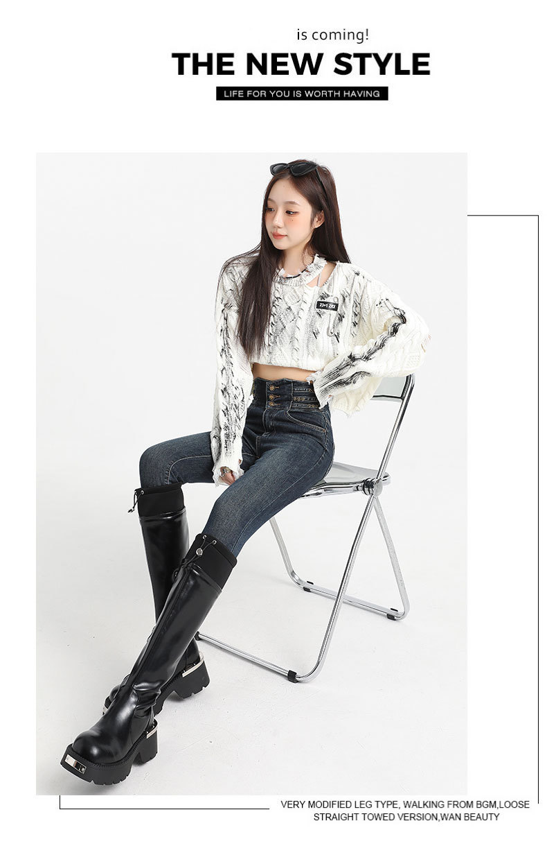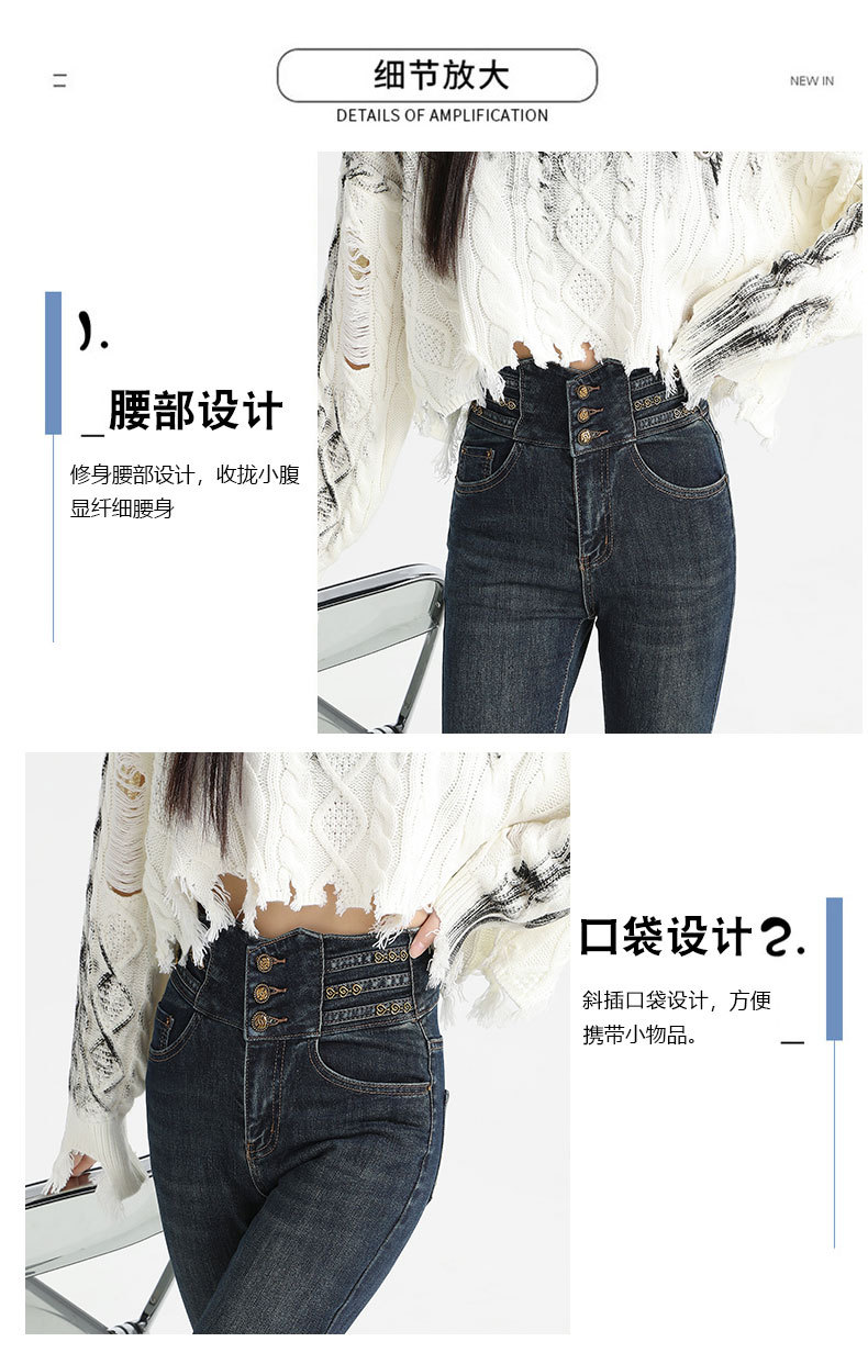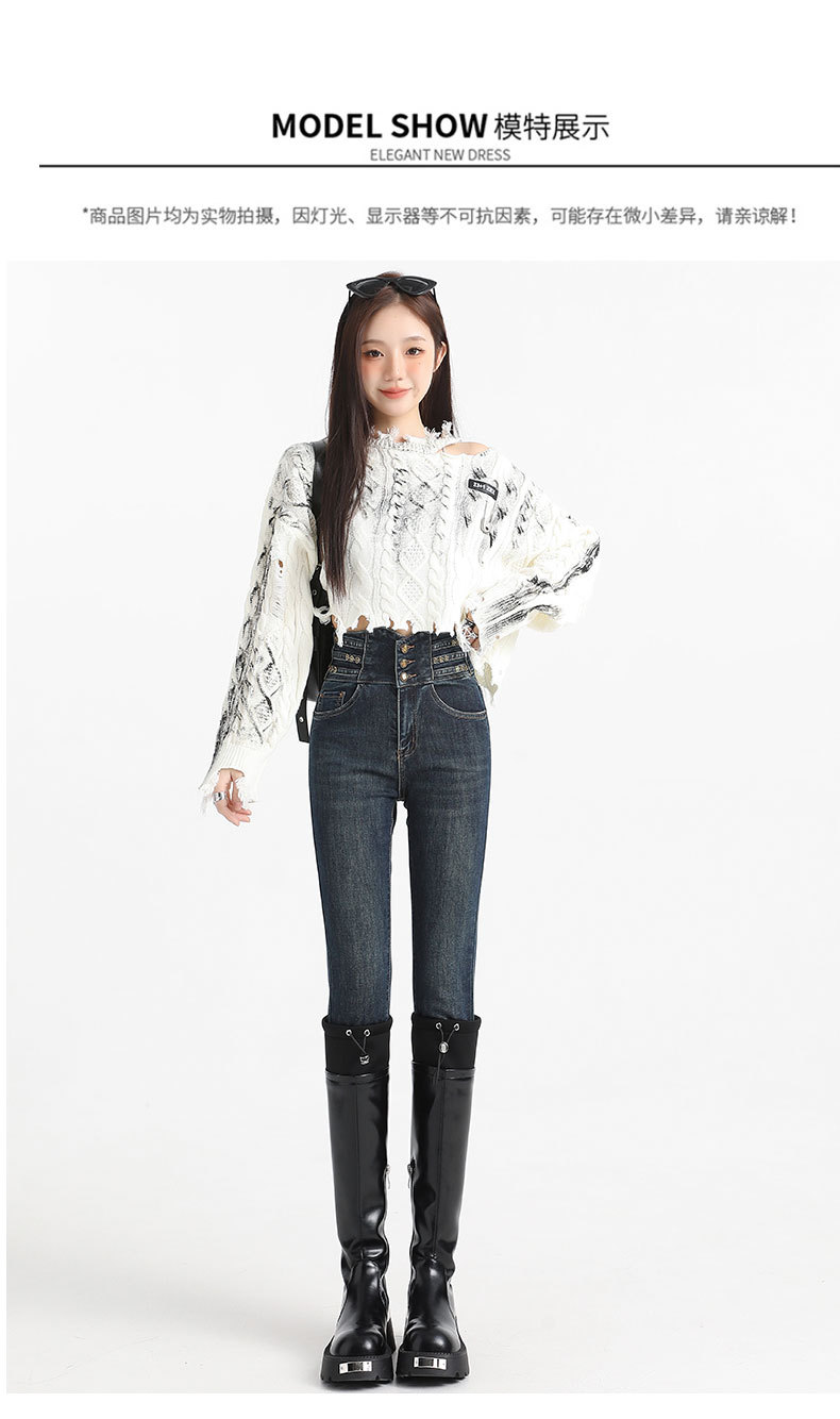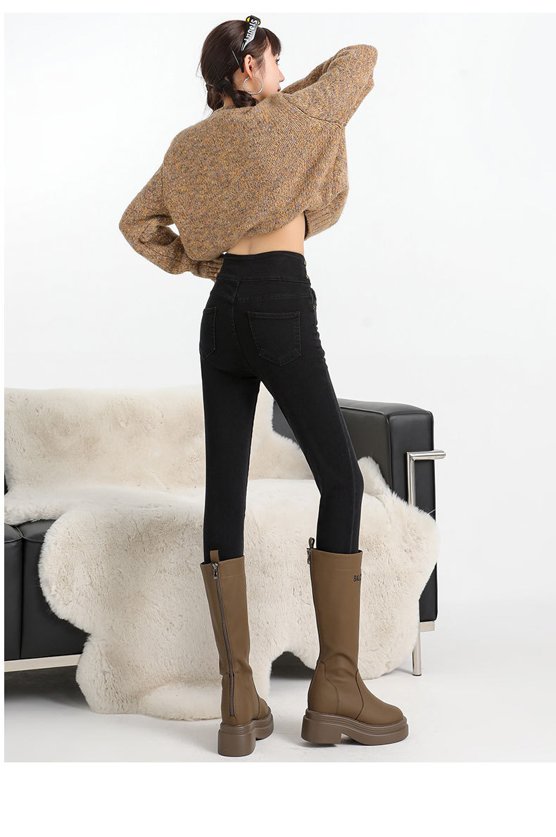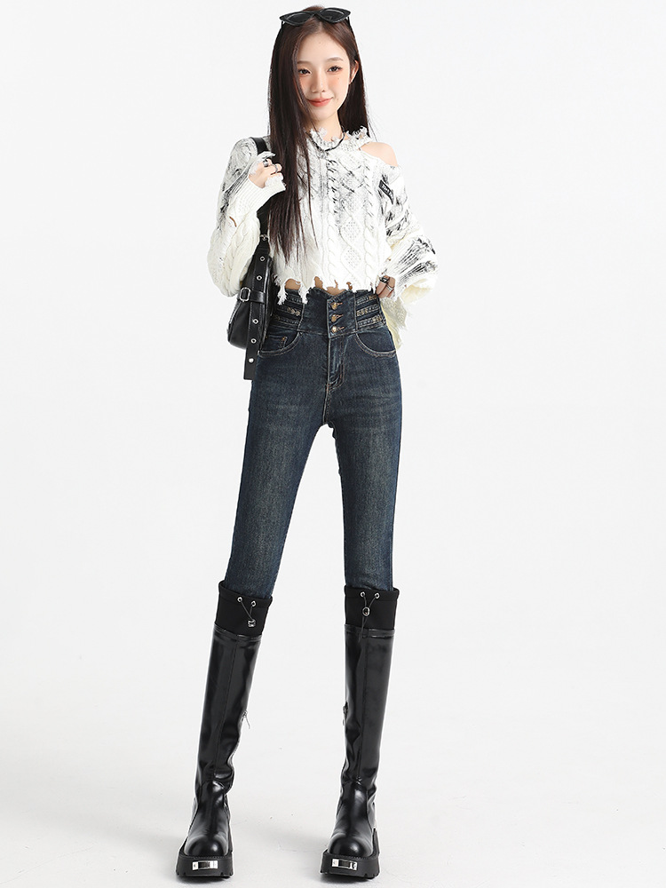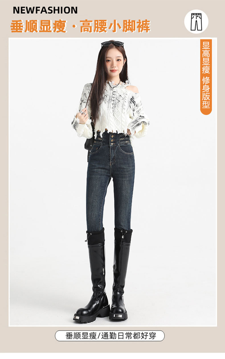 검은 데님 레깅스 여성의 2024 가을/겨울 새로운 디자인 높은 허리 버클 스트레치 슬리밍 연필 바지스토어 가기
