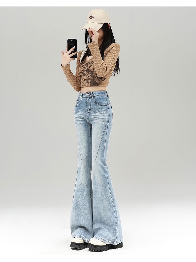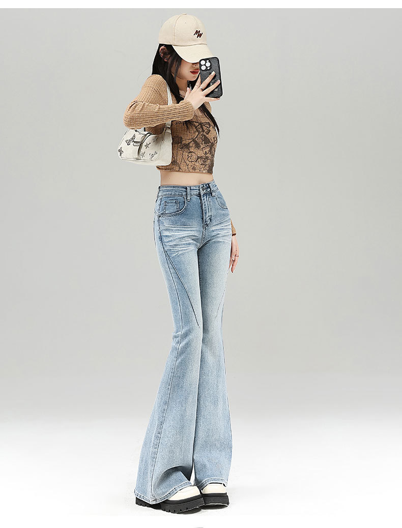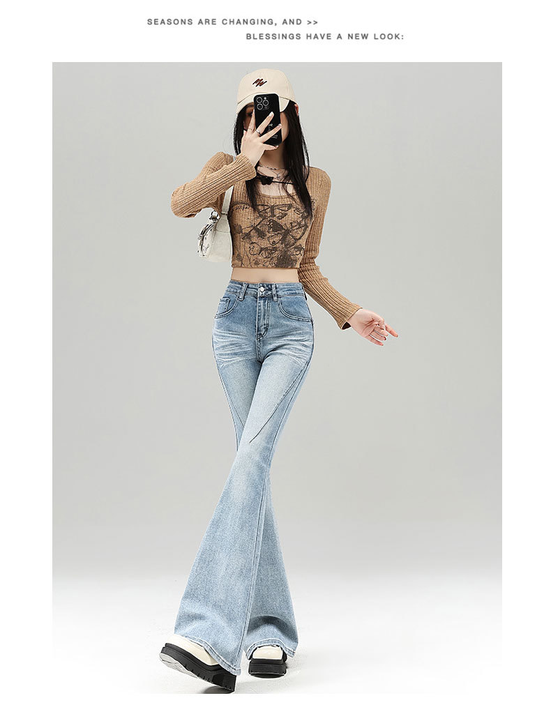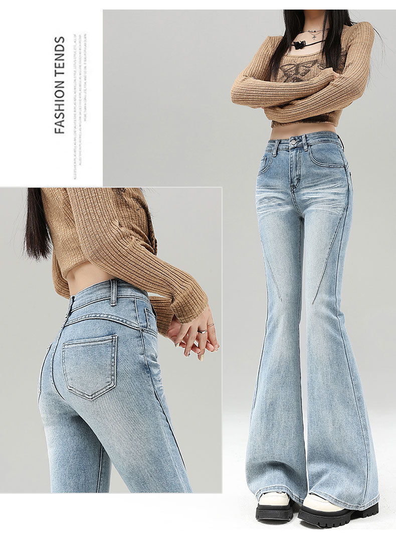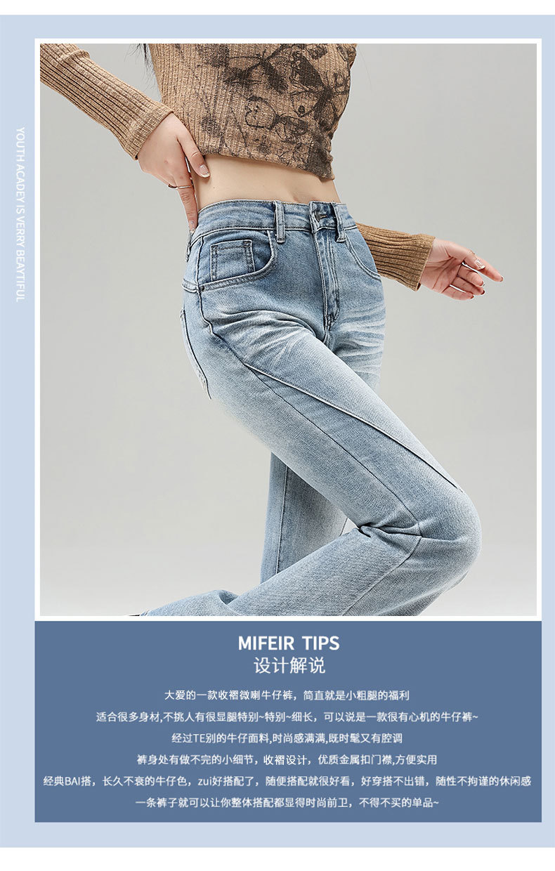 라이트 블루 마이크로 라 청바지 여성의 이른 봄 2025 새로운 높은 허리 슬림 주름 디자인 경적 바지스토어 가기