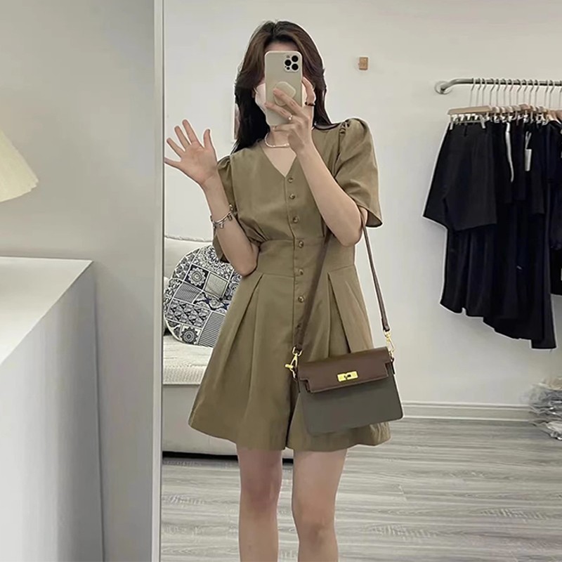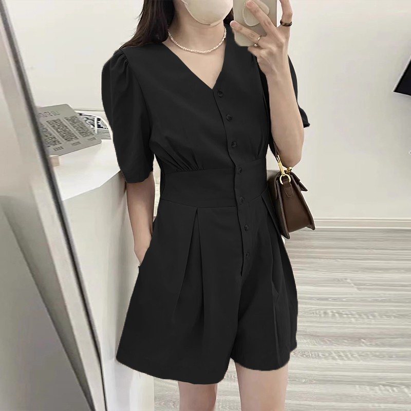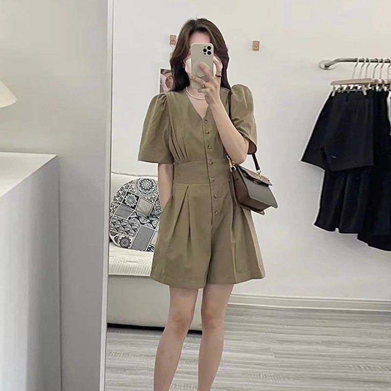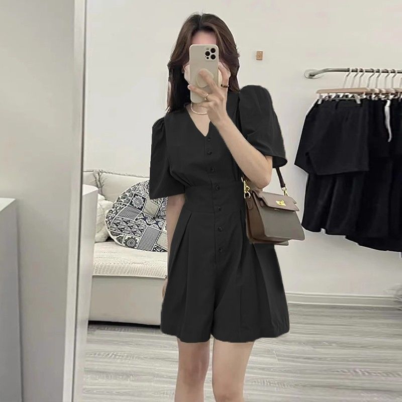 한국 스타일 간단한 서양식 점프 수트 2025 여름 하이 엔드 샤넬 스타일 V 넥 퍼프 슬리브 와이드 레그 반바지스토어 가기