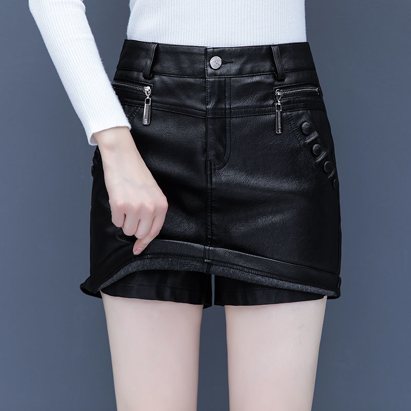 가죽 바지 여성 2024 새로운 가을과 겨울 한국 스타일 높은 허리 슬리밍 고관절 검은 반바지 여성 캐릭터 슬림핏 짧은 문화