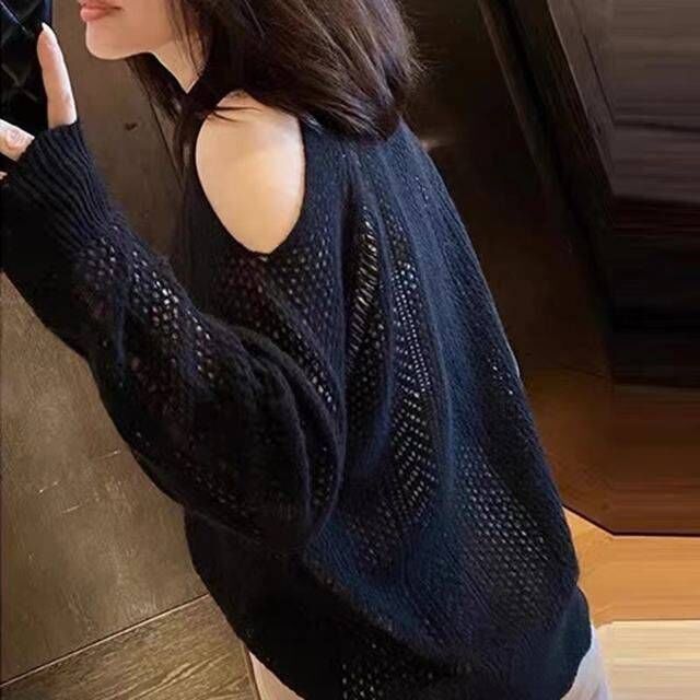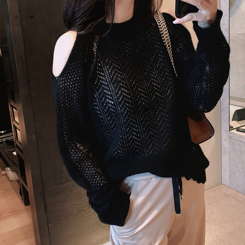 할로우 아웃 오브 숄더 탑 젠틀 라지 스타일 아이스 실크 얇은 베이스 니트 스웨터 느슨한 외부 착용 선스크린 블라우스 여름 여성