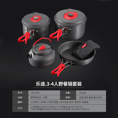 配置齐全的经典款式。产品除了套锅还包含煎盘和水壶;水壶采用硅胶套手柄;煎盘可以当盖子使用,煎盘底部螺纹设计;折叠手柄,方便携带;采用超轻铝材,表面优质阳极氧化处理,抗刮擦,耐腐蚀,创新性锅盖顶部硅胶防烫设计,材质达到欧美食品安全标准,健康安全。