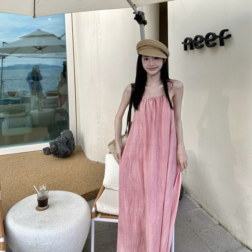 긴 원피스 멈추는 핑크 홀터 여름 해변 휴가 느슨한 민소매 원피스 슬리밍 중간 길이 디자인 스커트스토어 가기