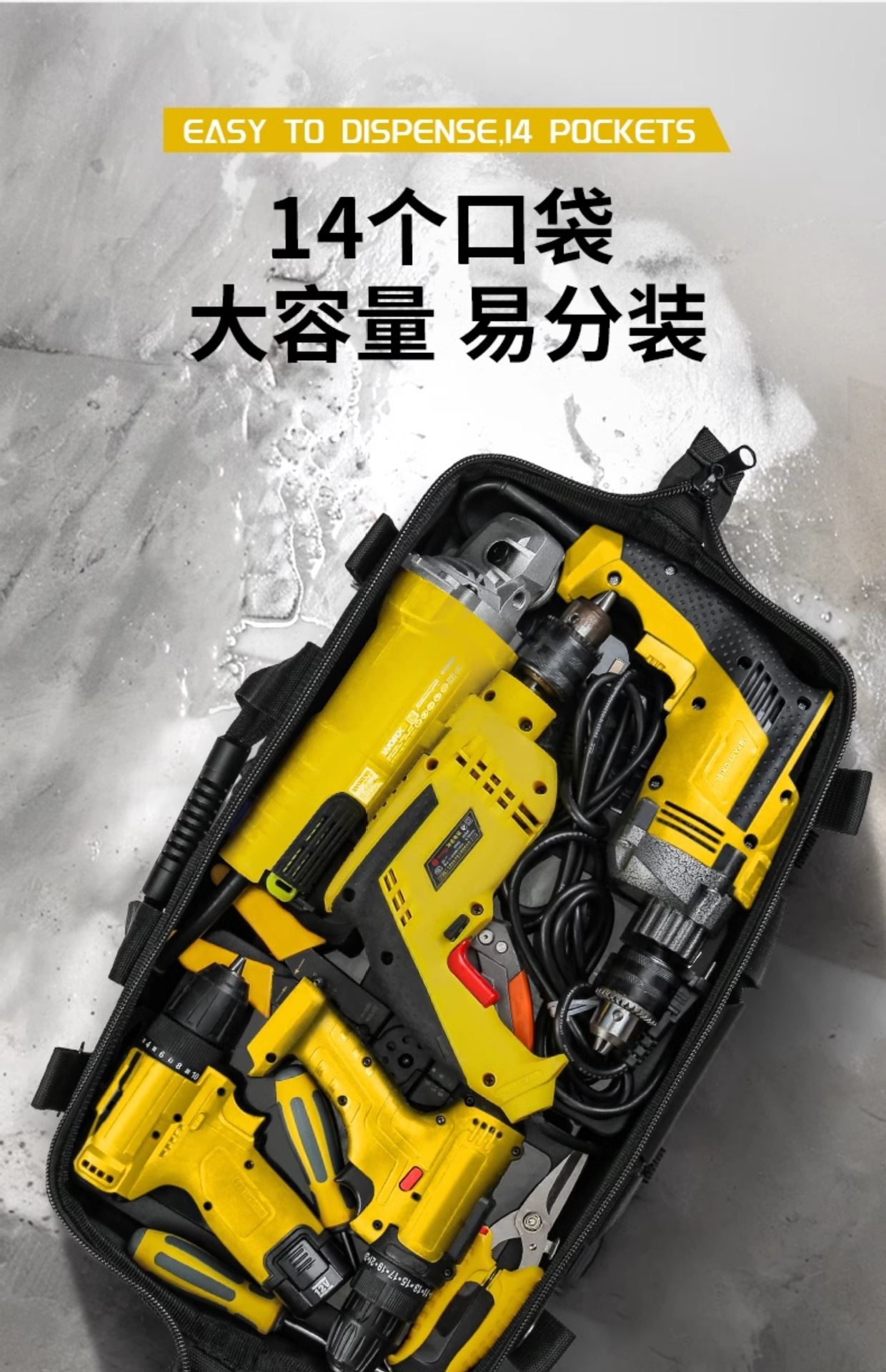 • 23inch [5겹의 천 + 강철못 보강] 손잡이가 긴 공구 + 전기 드릴 + 전기 해머 수납 가능