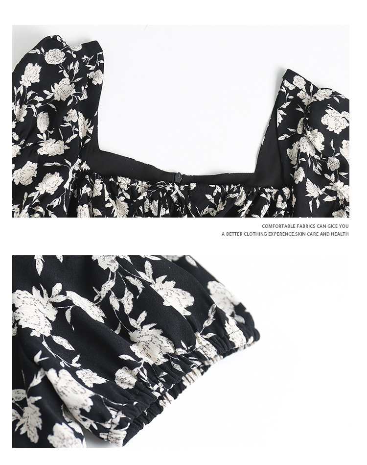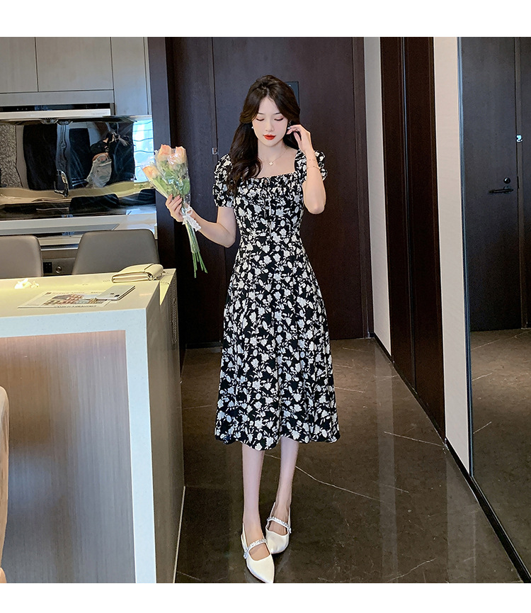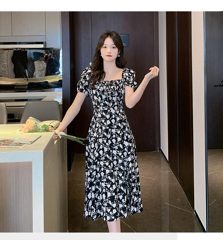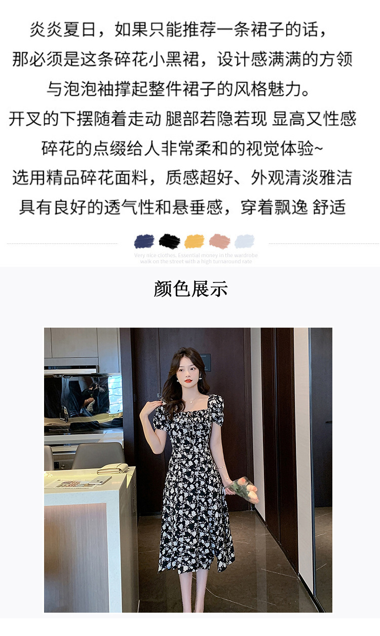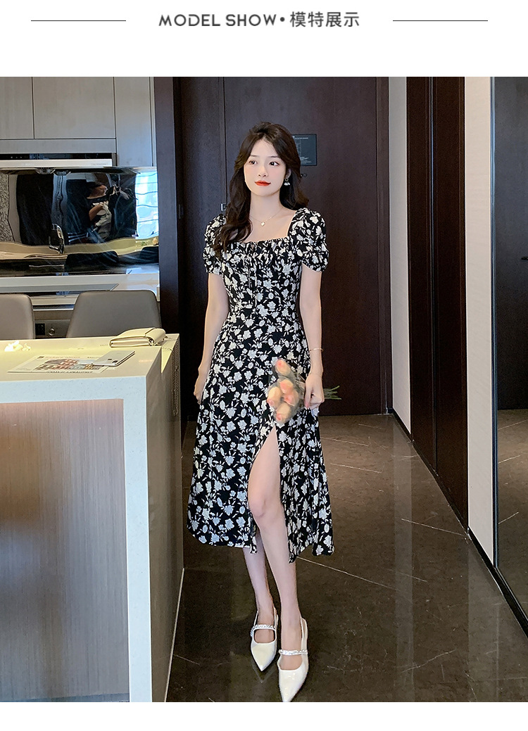 검은 꽃 원피스 여자 2025 여름 새로운 스타일 프랑스 슬리밍 스퀘어 칼라 스플릿 긴 원피스스토어 가기