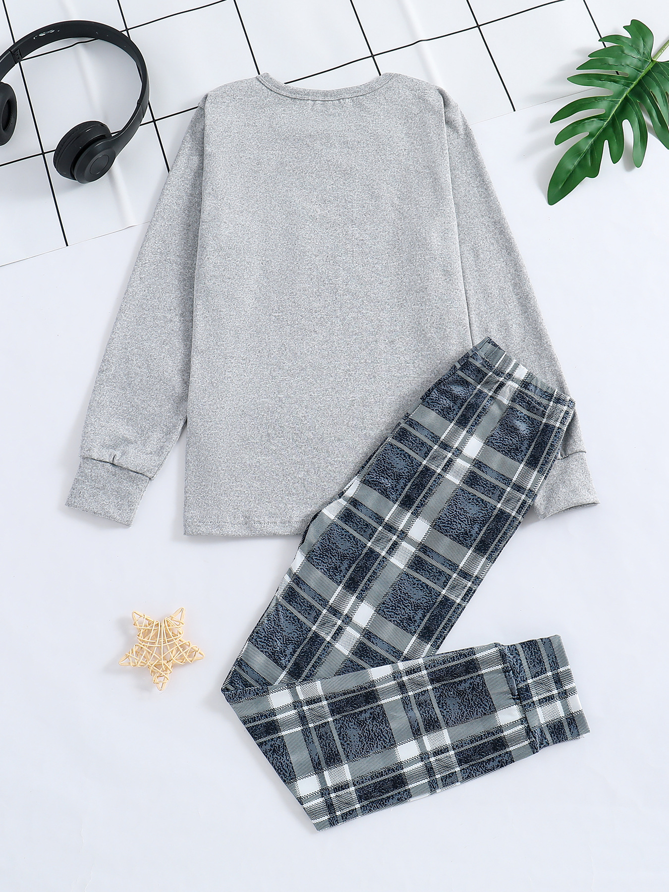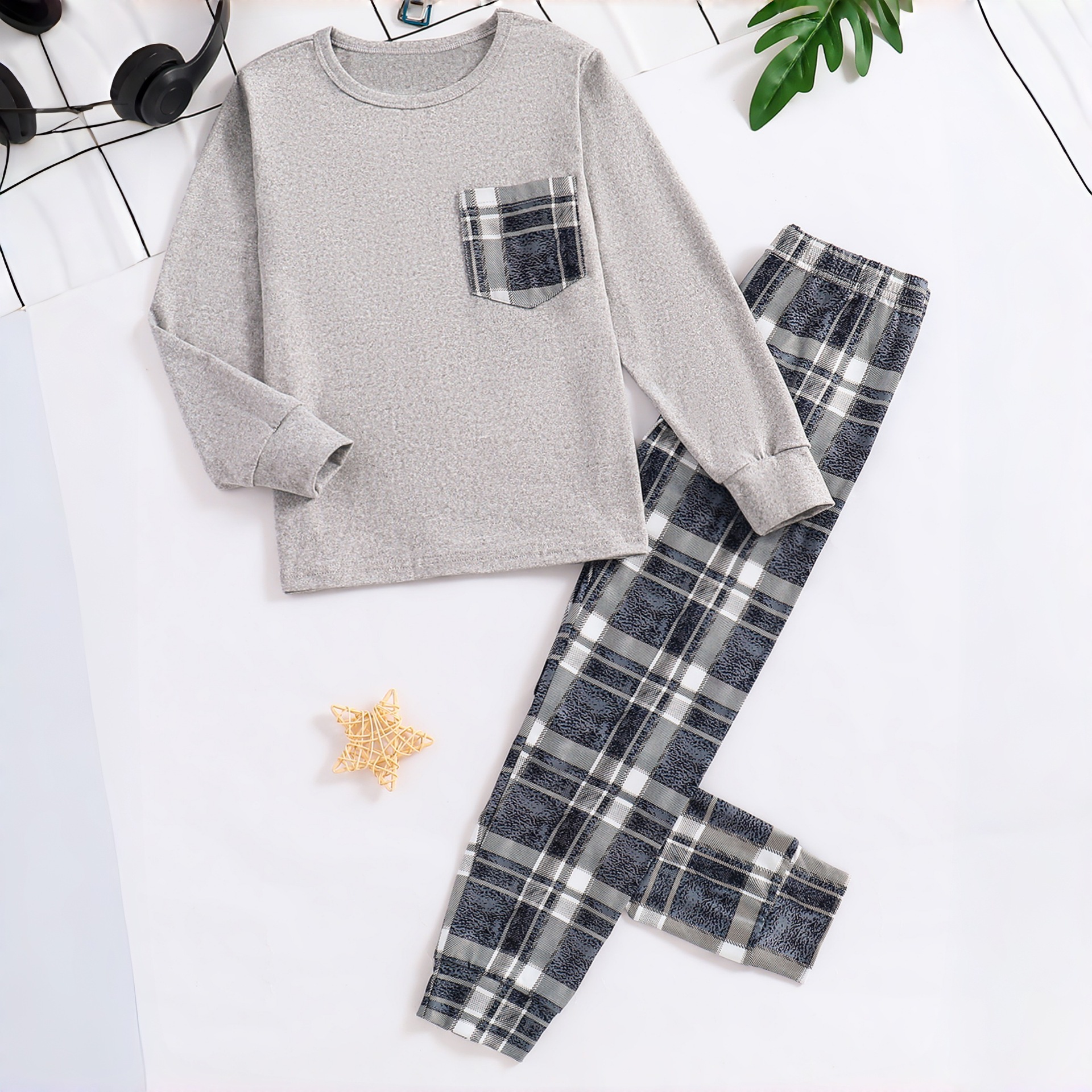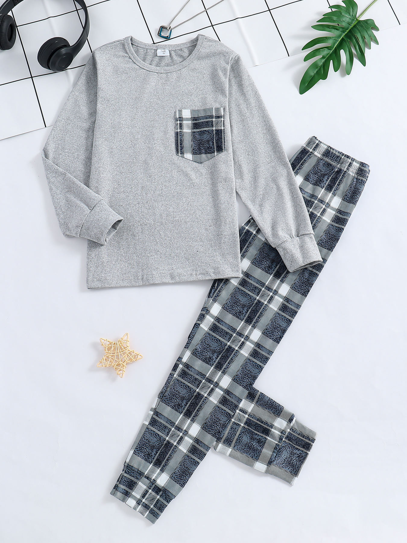 독립적 인 역 공급 업체 Zhongdai 소년 단색 긴 소매 최고 격자 무늬 다리 바지 홈 의류 파자마 세트