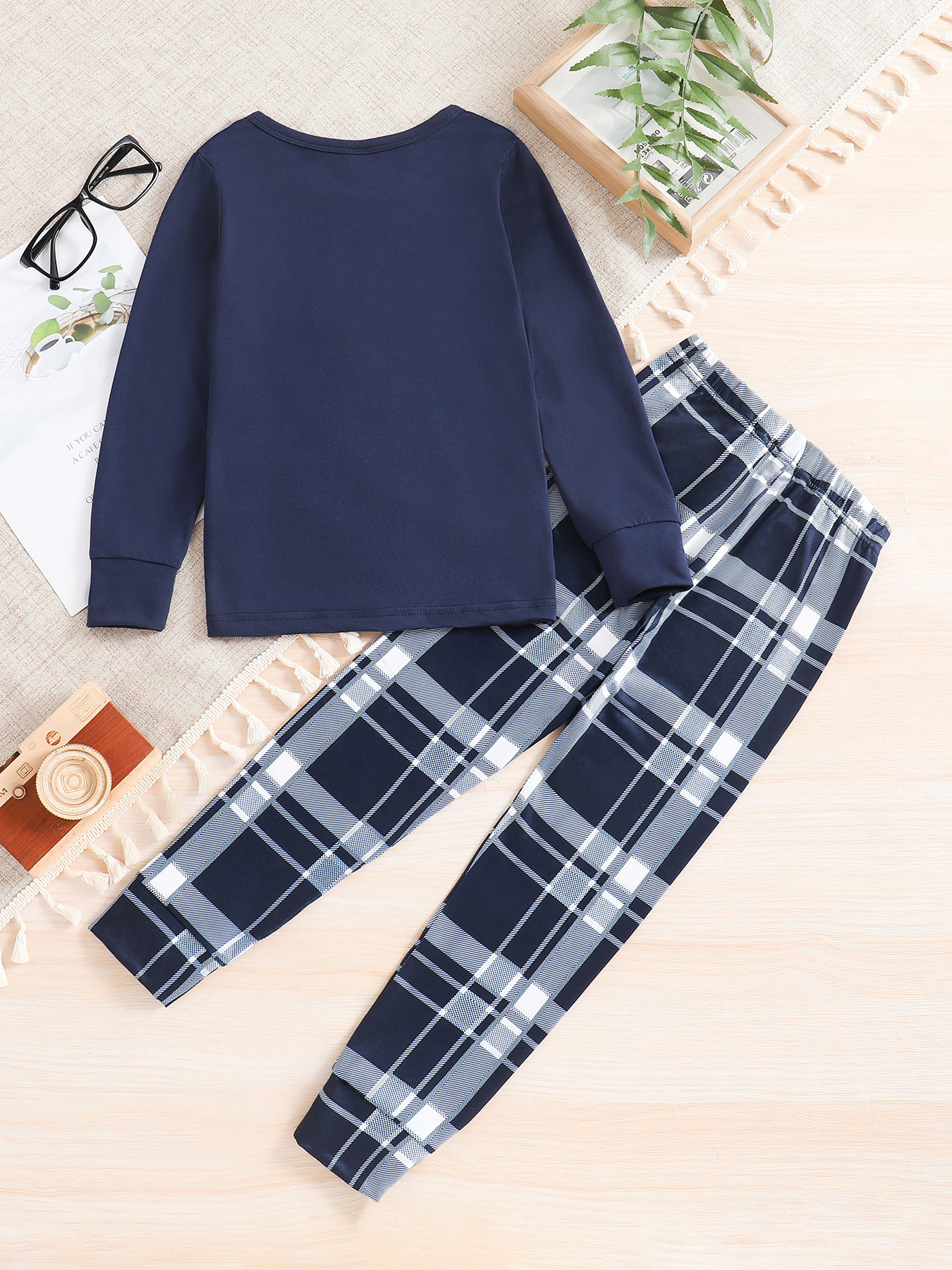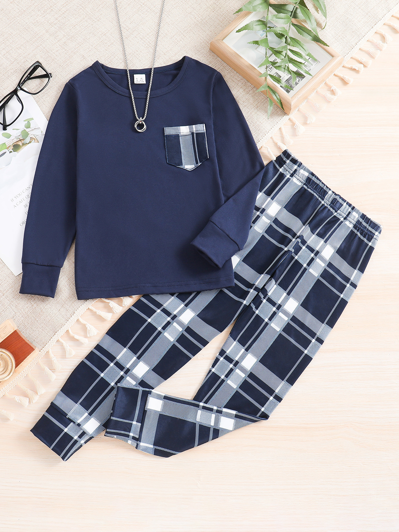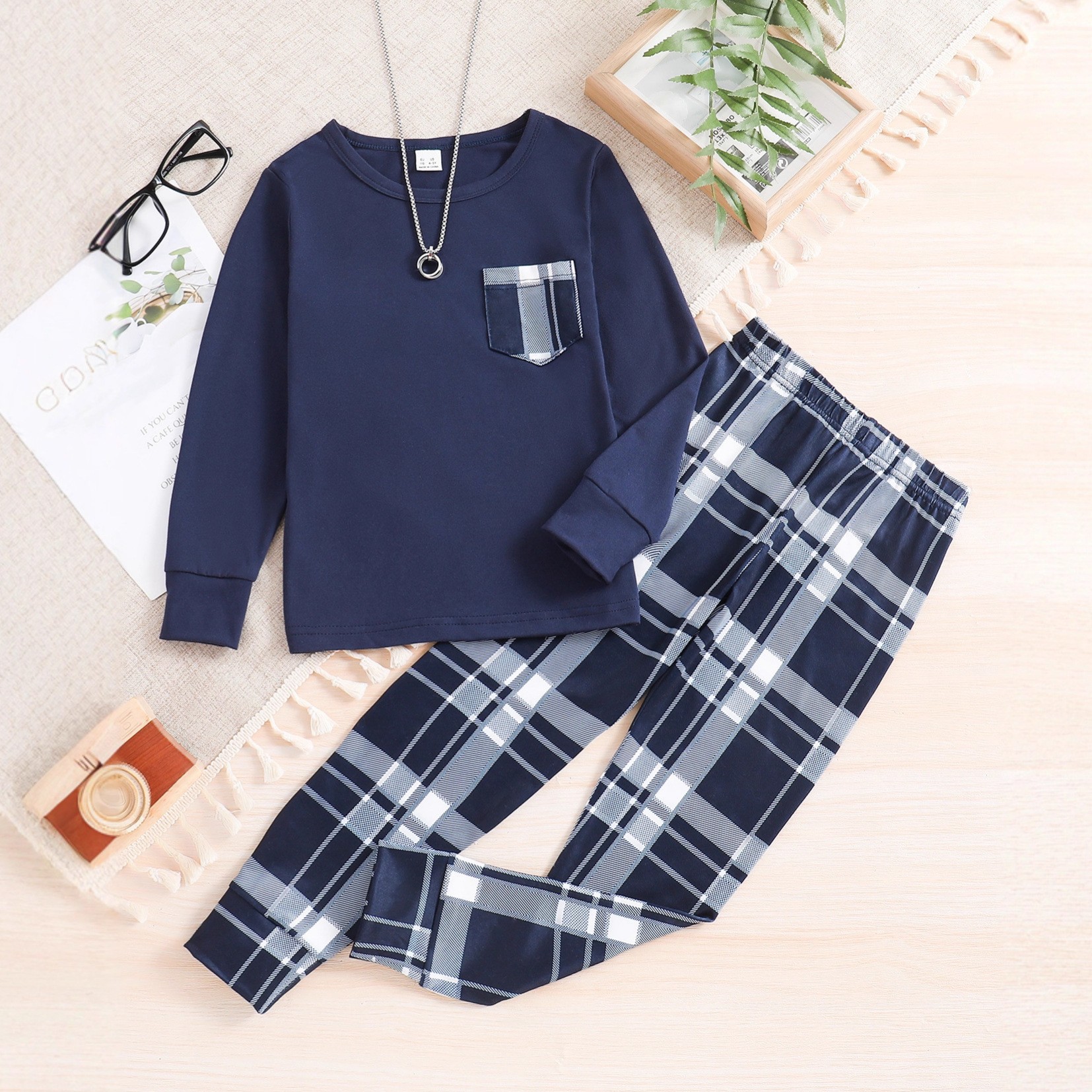 독립적 인 역 공급 업체 Zhongdai 소년 단색 긴 소매 최고 격자 무늬 다리 바지 홈 의류 파자마 세트