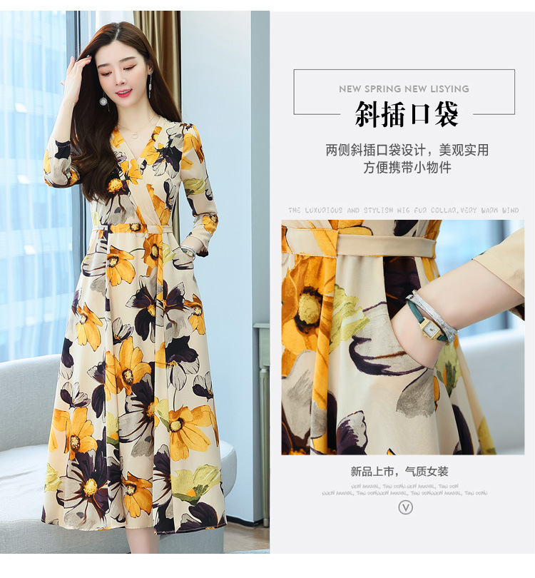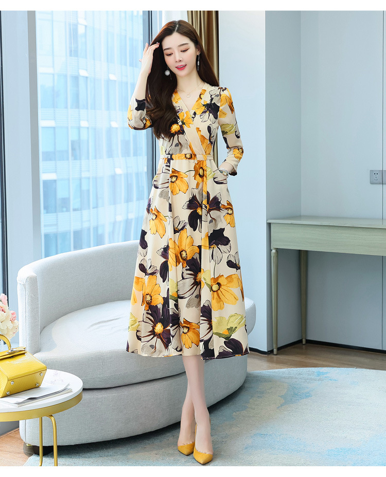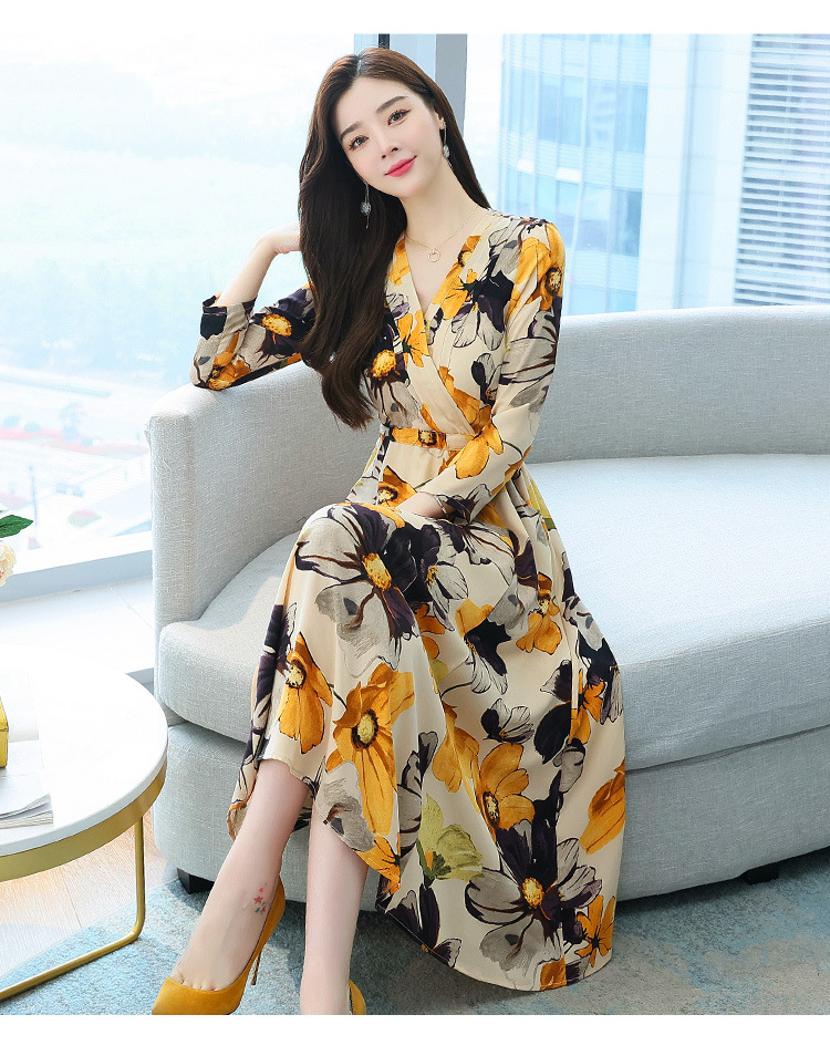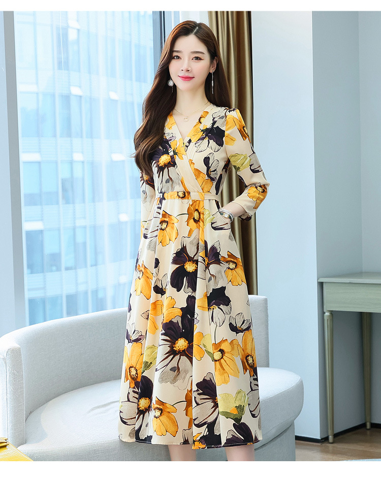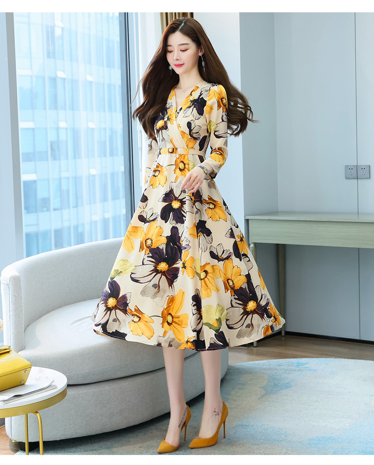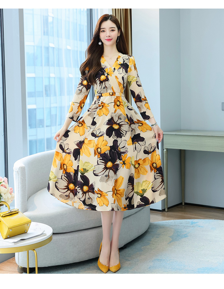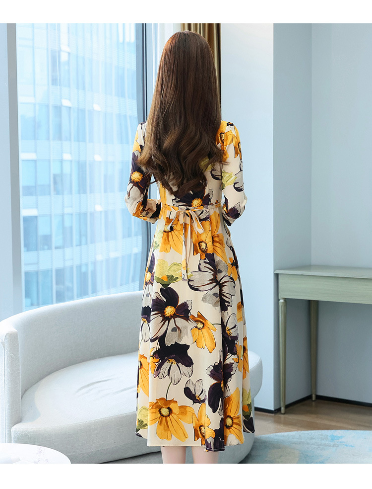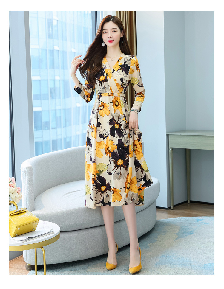 긴 무릎 긴팔 쉬폰 원피스 이른 봄 새 여성복 슬리밍 우아한 가을 롱 스커트