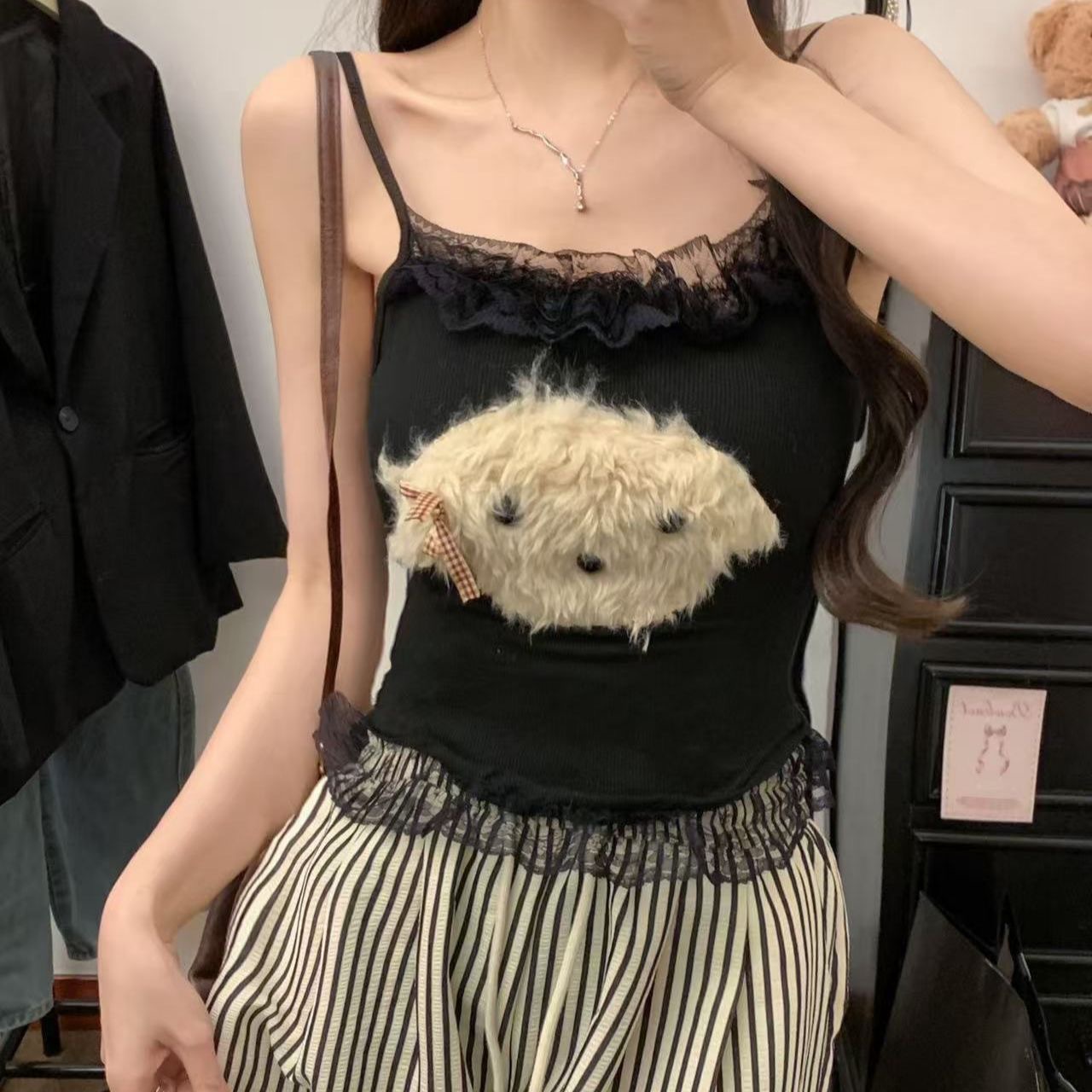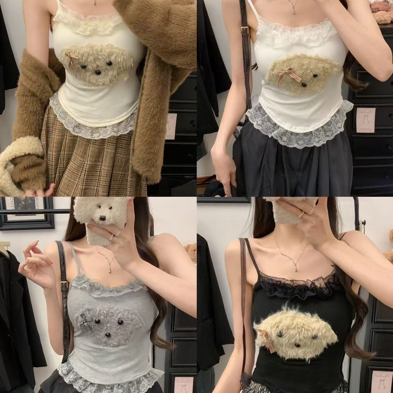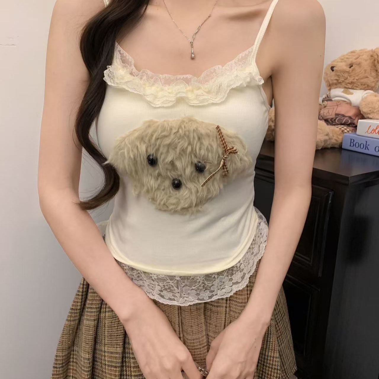 달콤한 나이를 줄이는 봉제 강아지 레이스 카미솔 순수한 욕망 스파이스 소녀 슬림 핏 내복 외부 착용 아름다운 뒷베이스스토어 가기