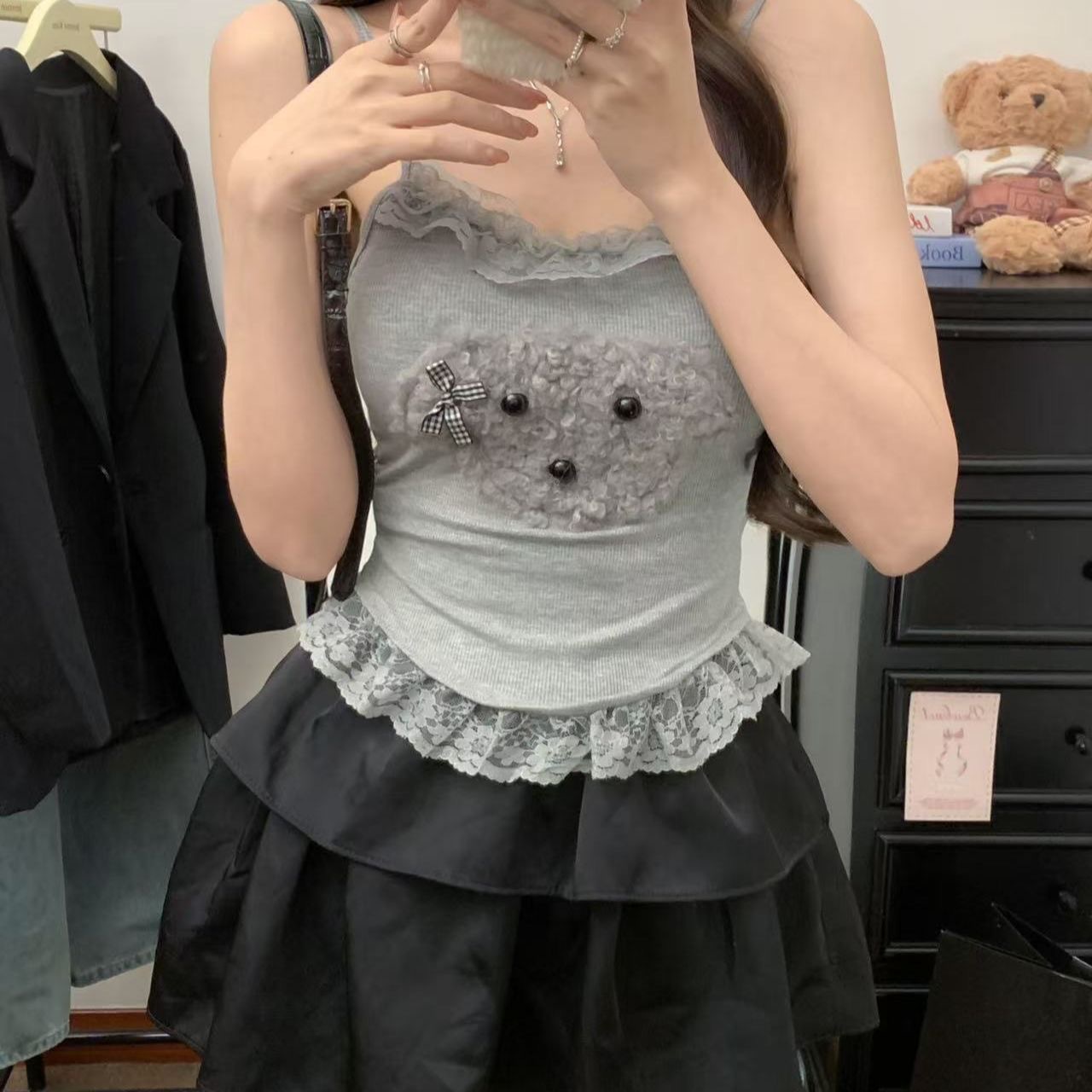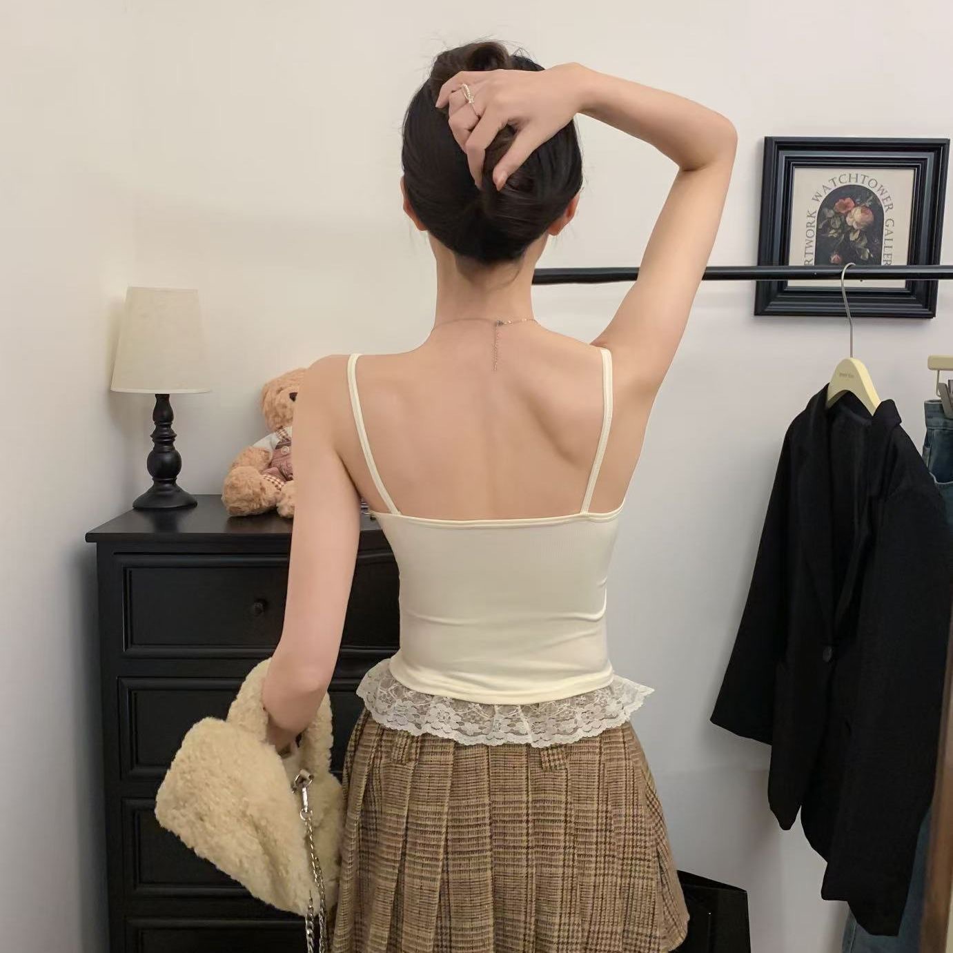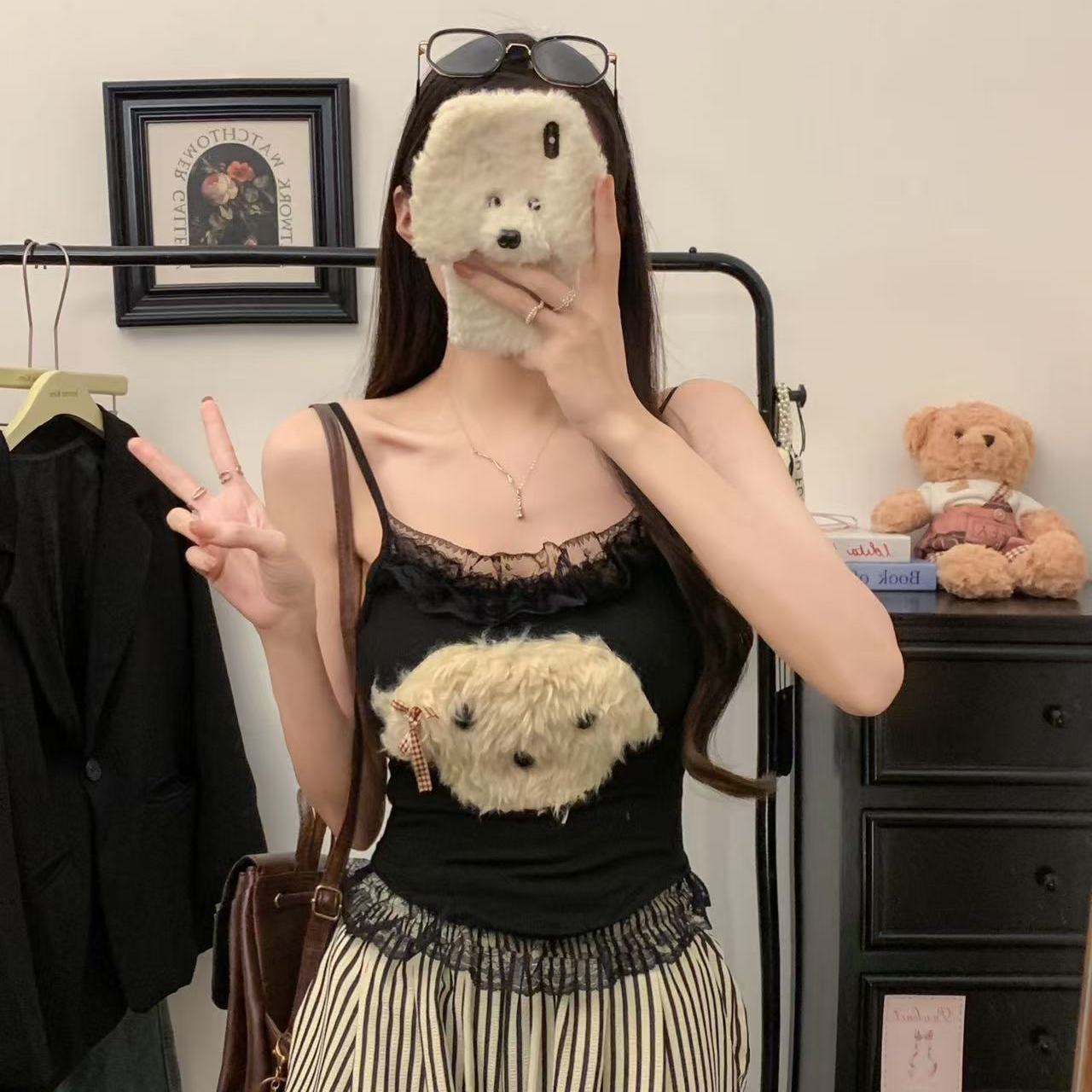 달콤한 나이를 줄이는 봉제 강아지 레이스 카미솔 순수한 욕망 스파이스 소녀 슬림 핏 내복 외부 착용 아름다운 뒷베이스스토어 가기