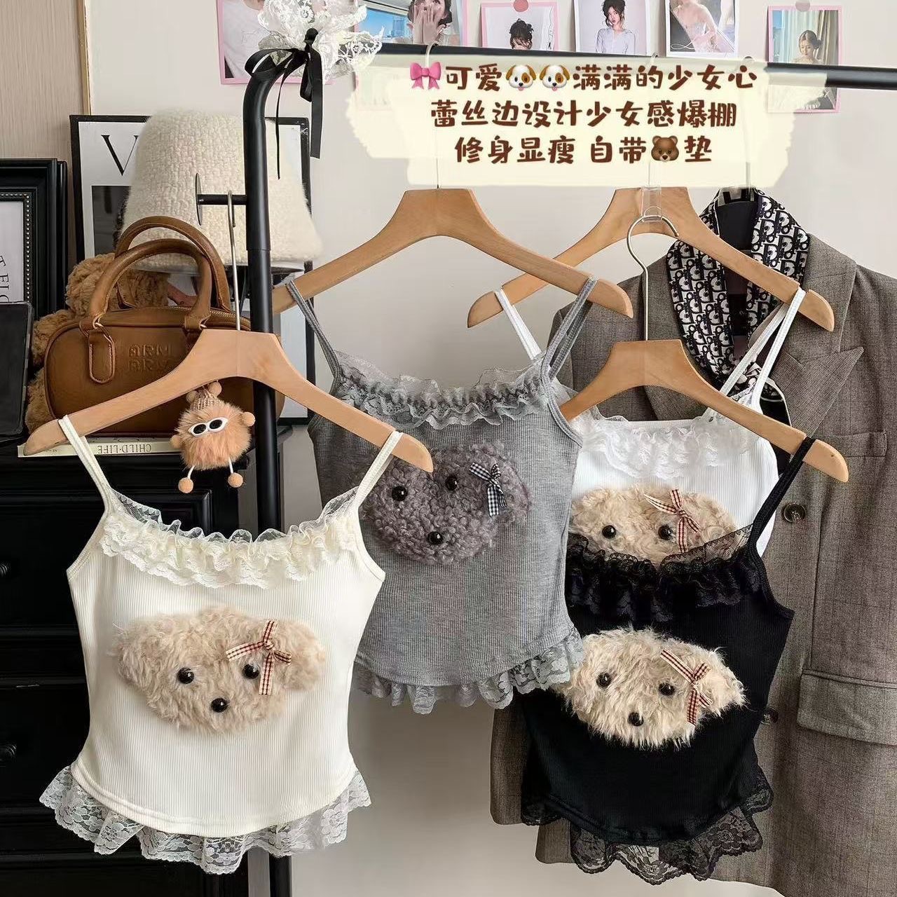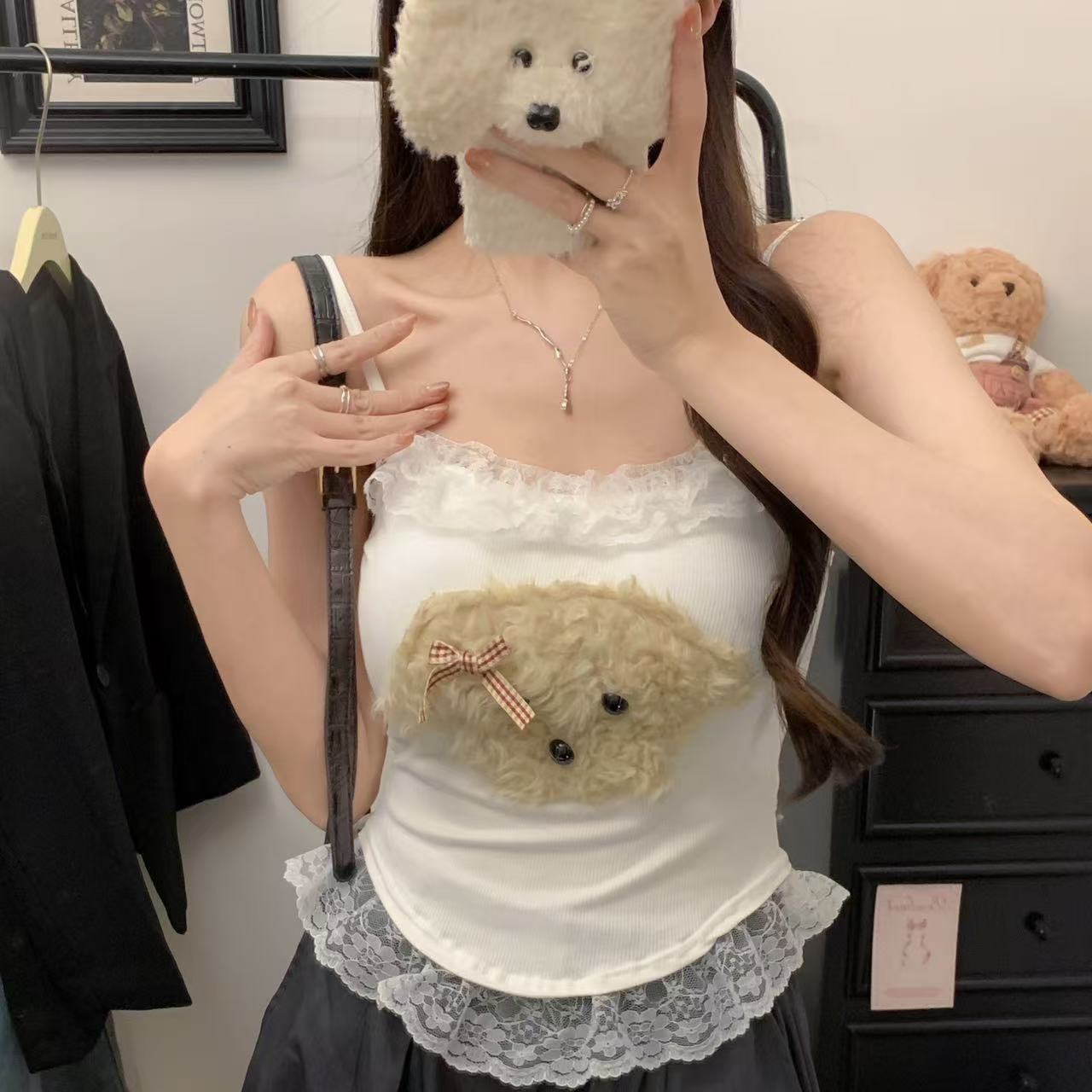 달콤한 나이를 줄이는 봉제 강아지 레이스 카미솔 순수한 욕망 스파이스 소녀 슬림 핏 내복 외부 착용 아름다운 뒷베이스