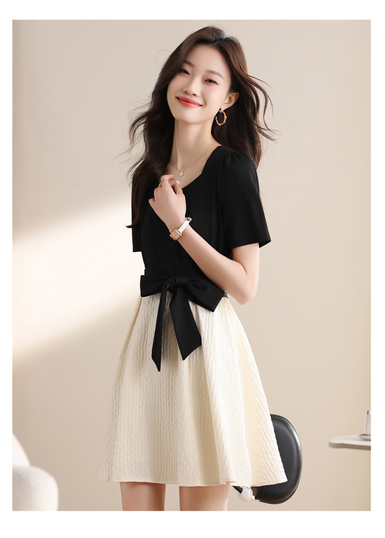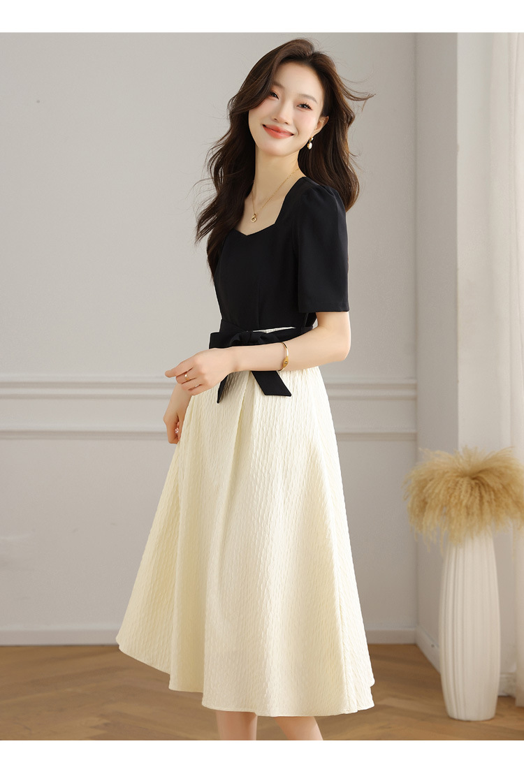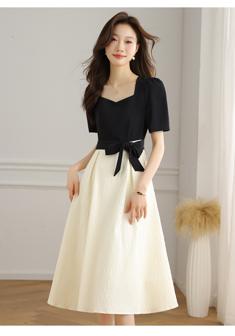 스퀘어 칼라 스티칭 원피스 여성 여름 원피스 새로운 우아한 슬리밍 디자인 센스 스커트 퍼프 소매 긴 스커트