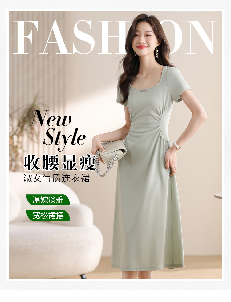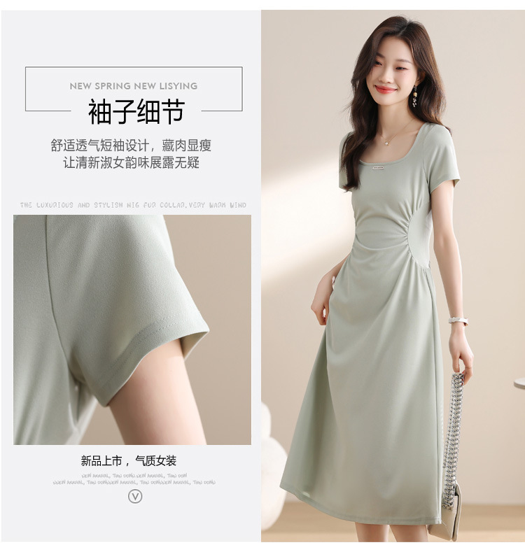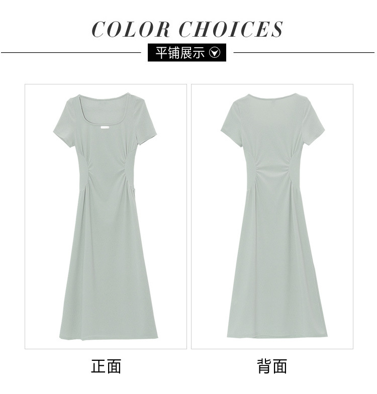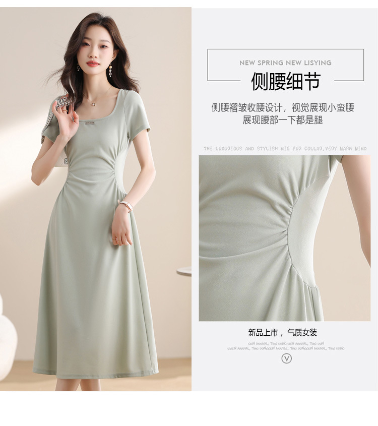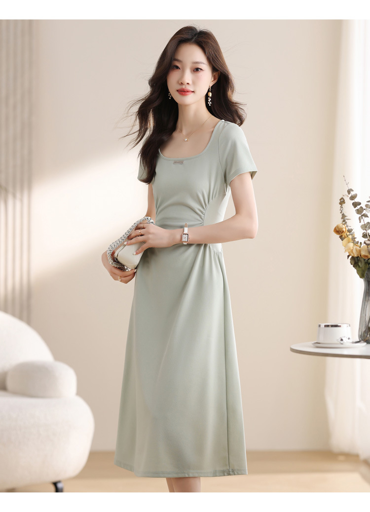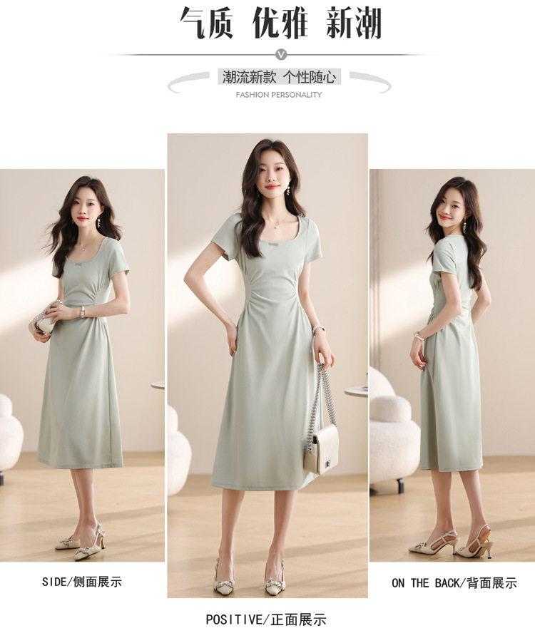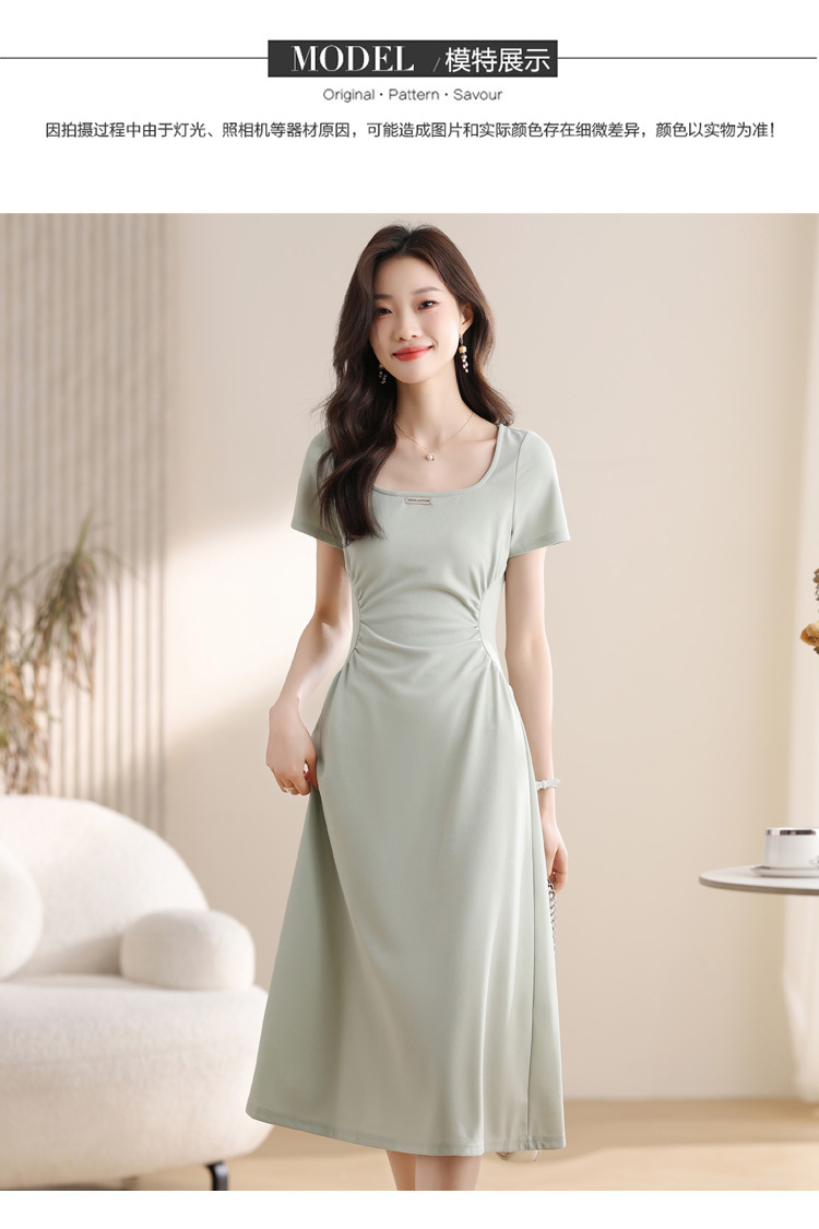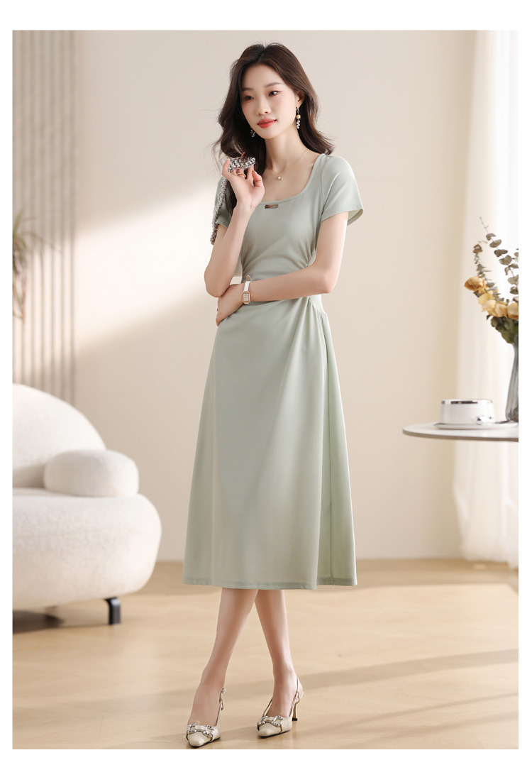 그린 스퀘어 칼라 티 브레이크 프랑스 반팔 원피스 여성 여름 새로운 허리 스타일 긴 원피스스토어 가기