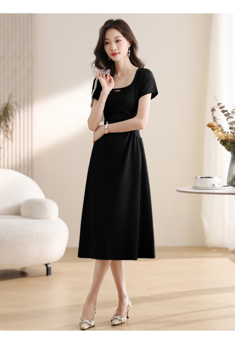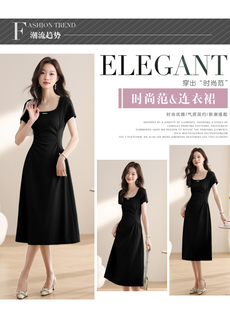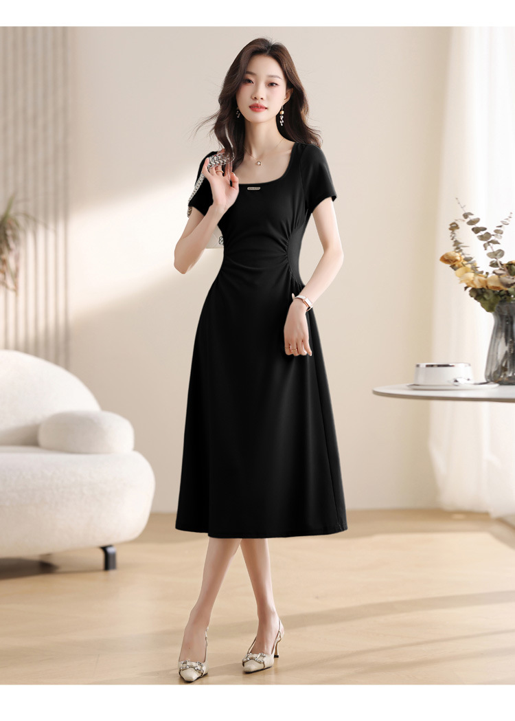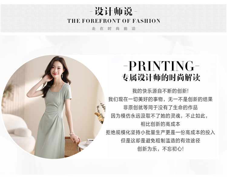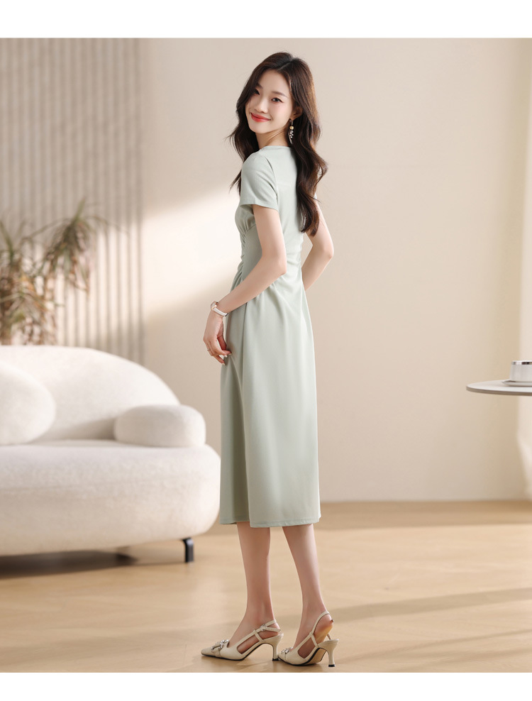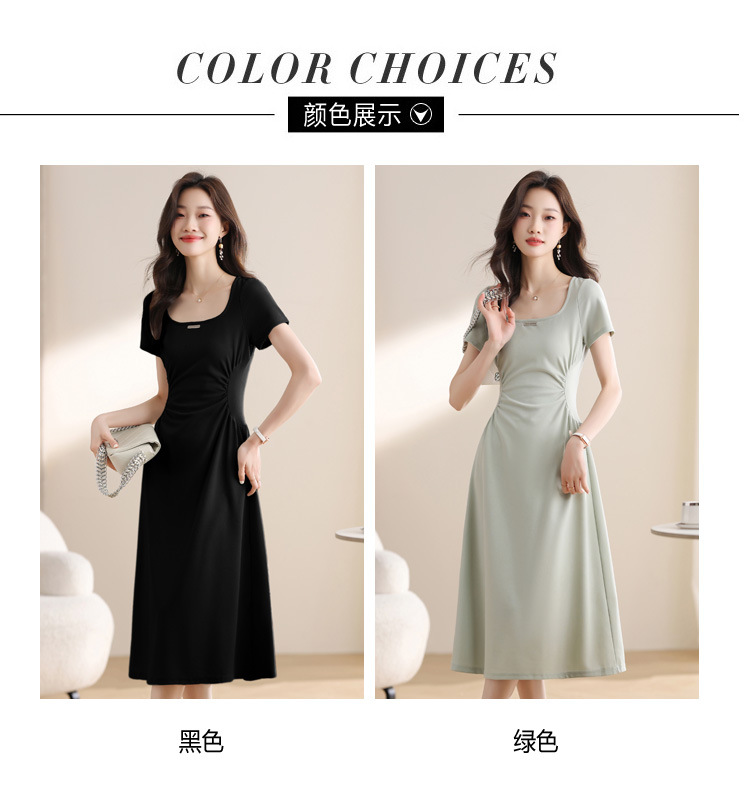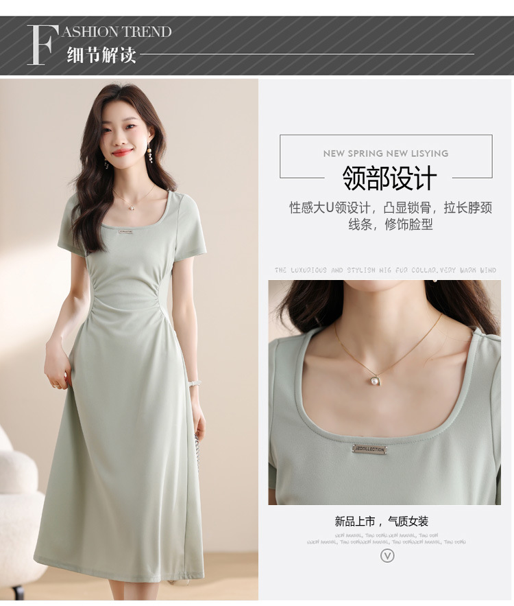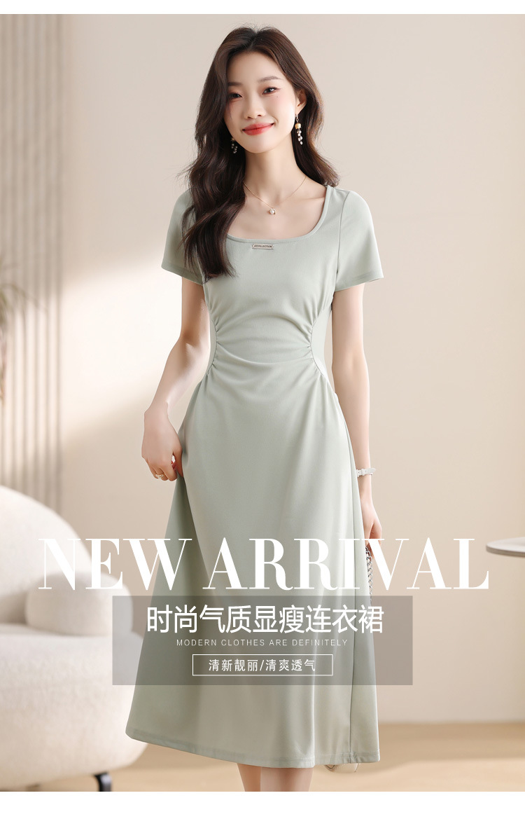 그린 스퀘어 칼라 티 브레이크 프랑스 반팔 원피스 여성 여름 새로운 허리 스타일 긴 원피스스토어 가기