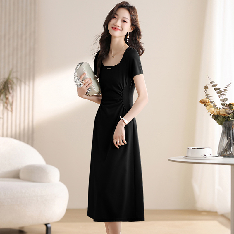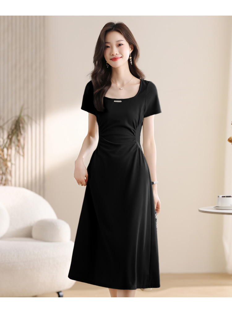 그린 스퀘어 칼라 티 브레이크 프랑스 반팔 원피스 여성 여름 새로운 허리 스타일 긴 원피스