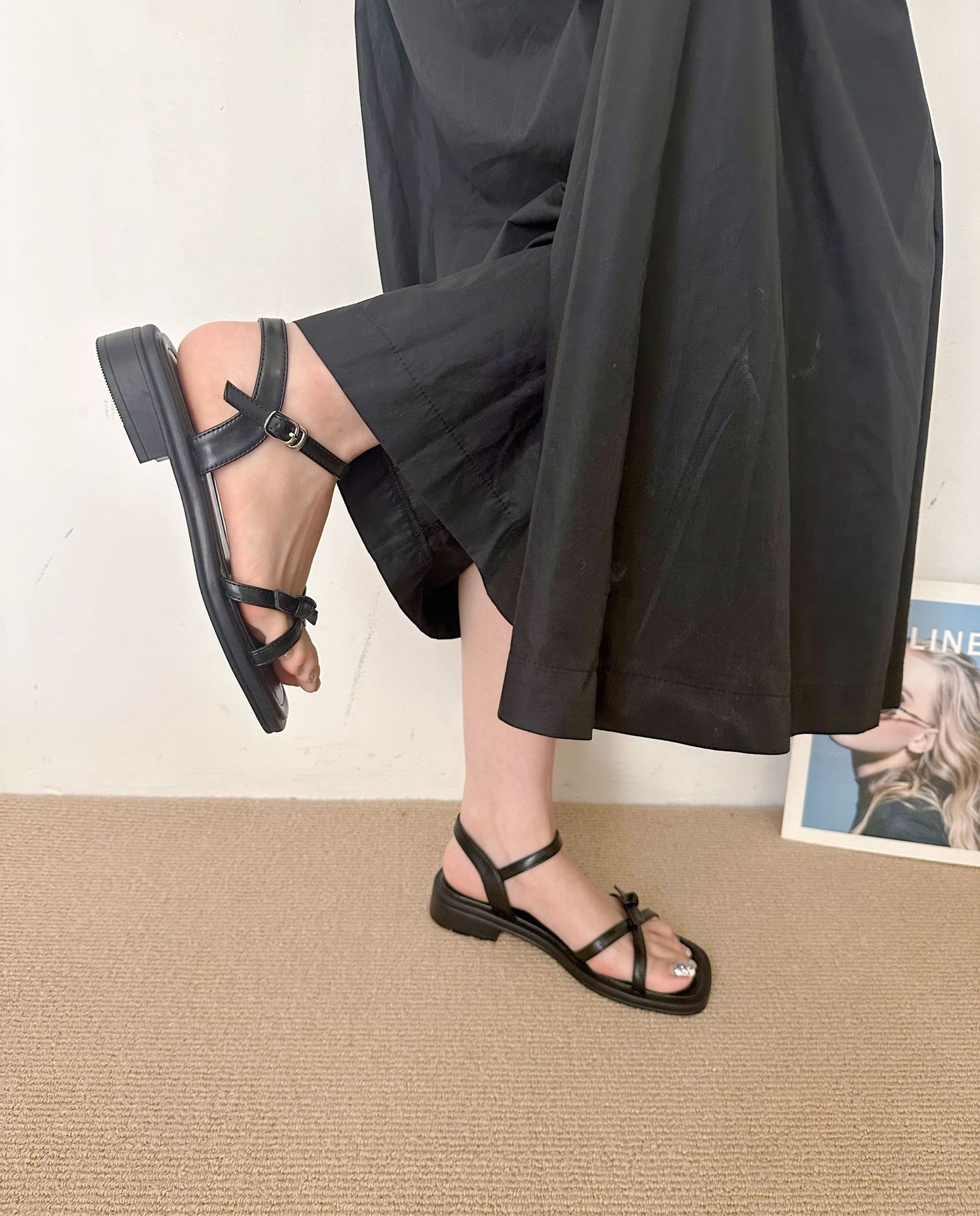 2025 여성 여름 프랑스 간단한 스퀘어 힐 신발 스커트 활 로마 스퀘어 발가락 샌들