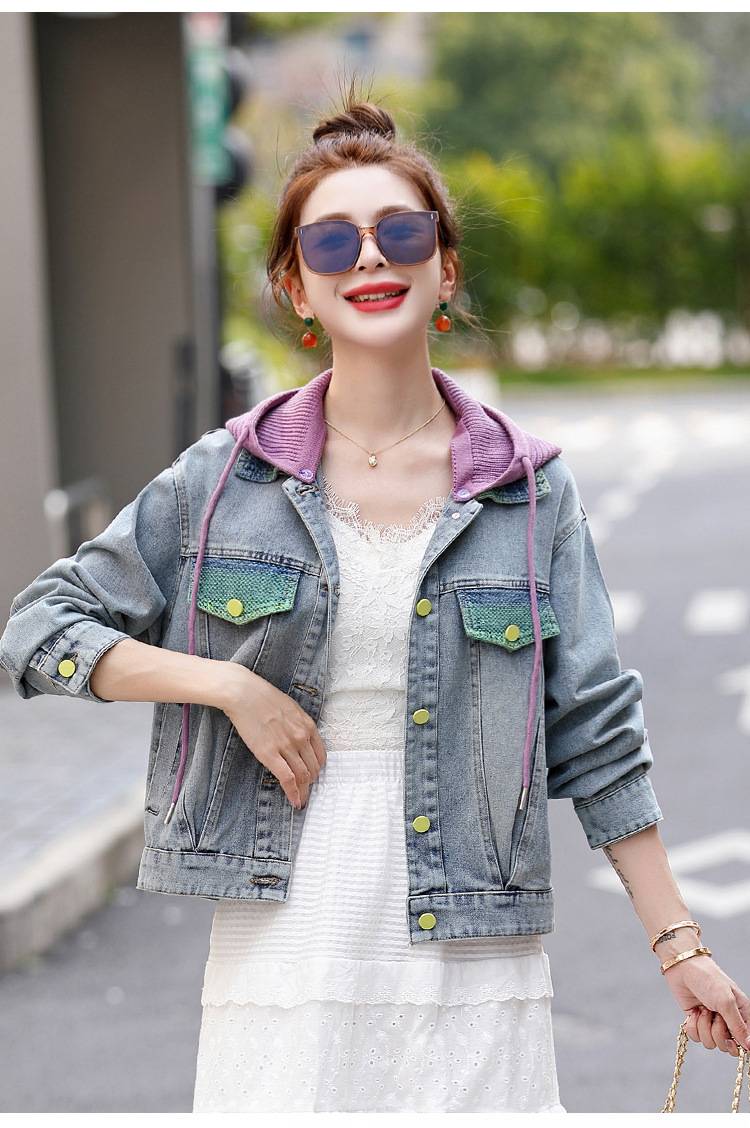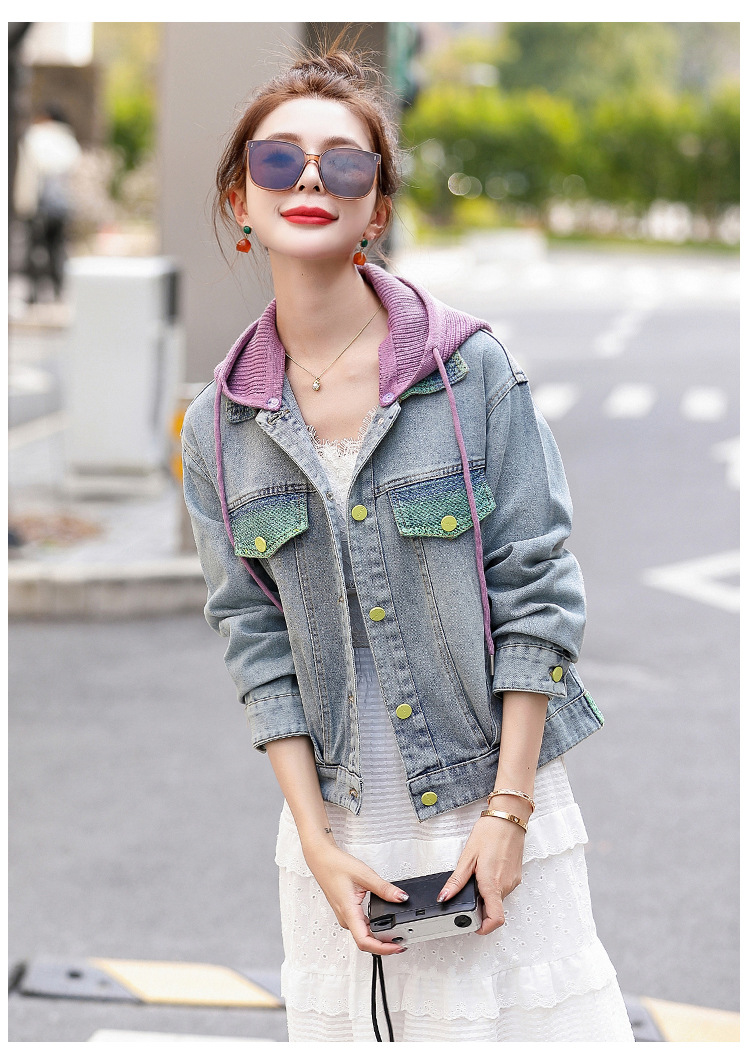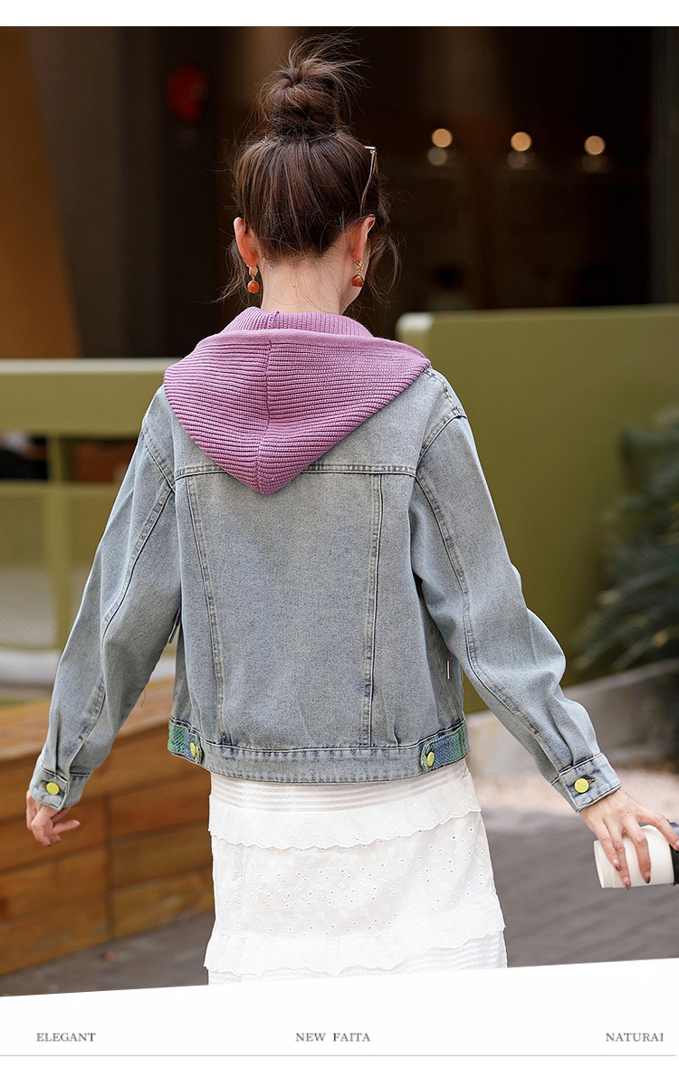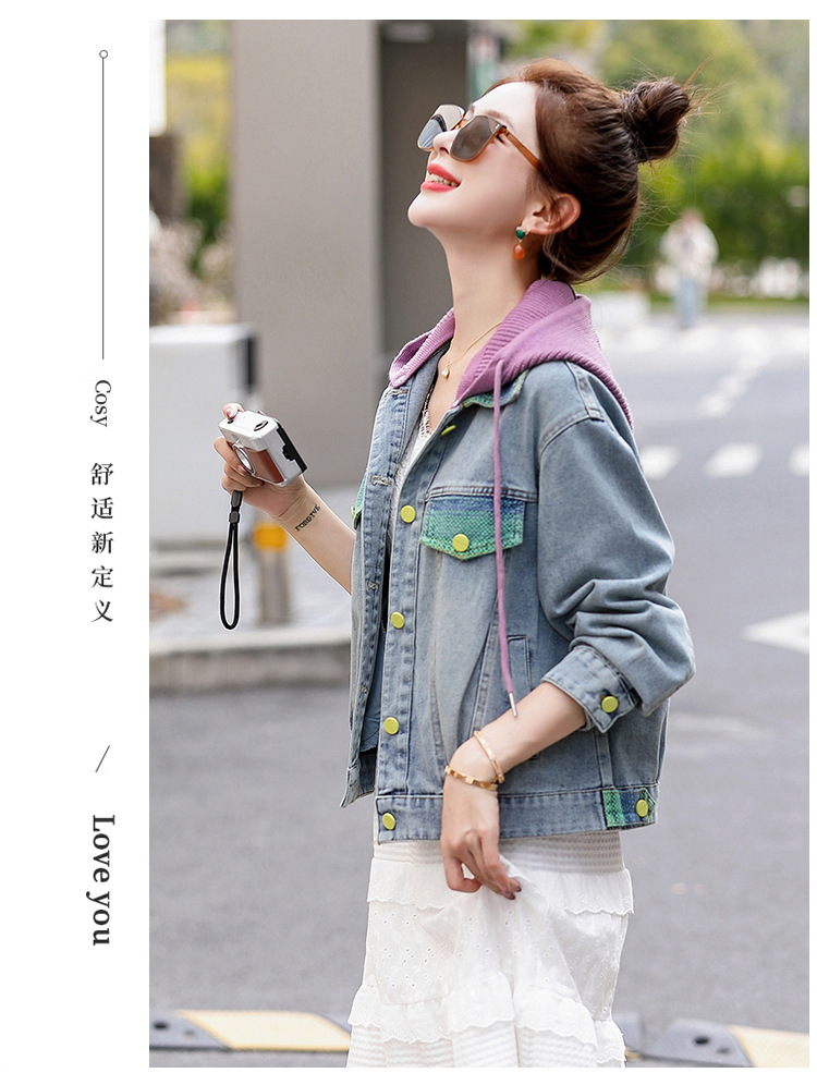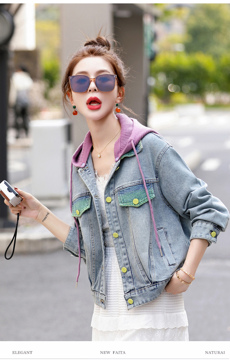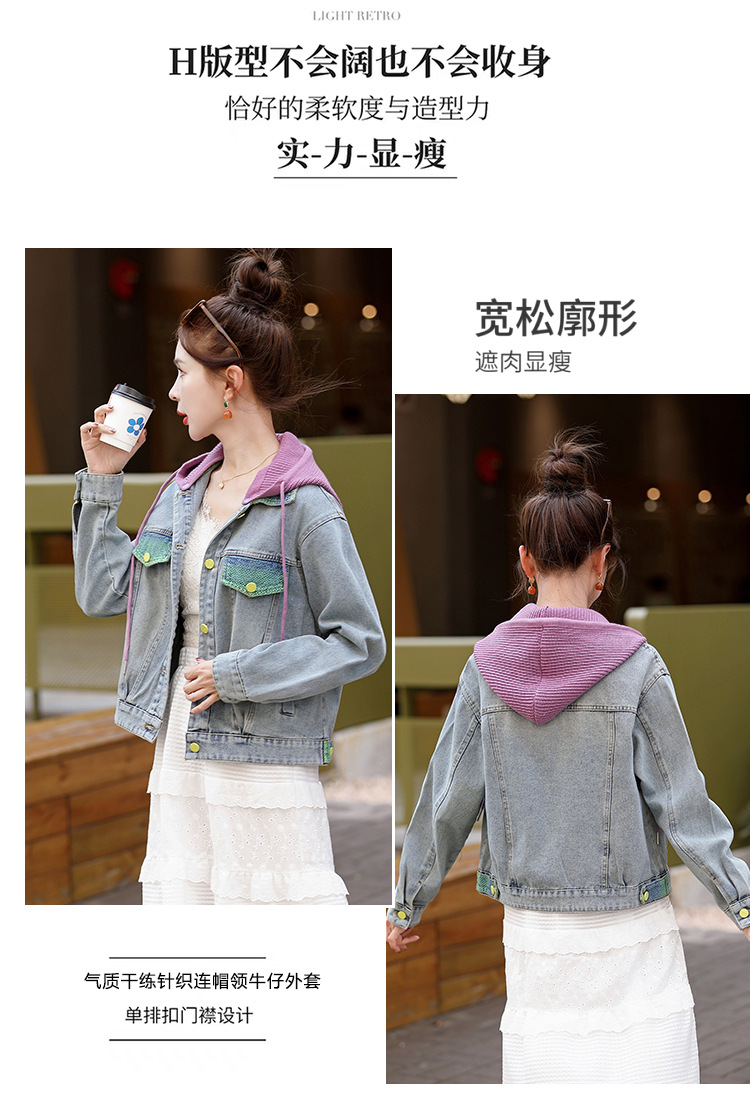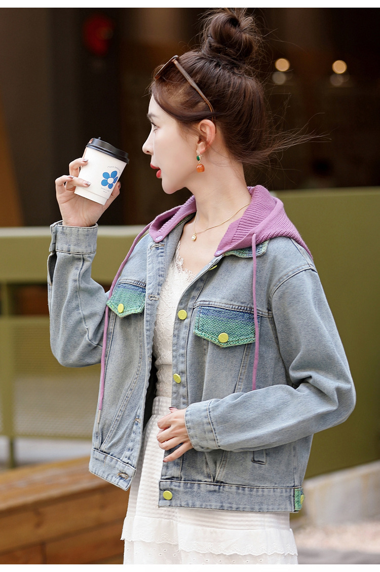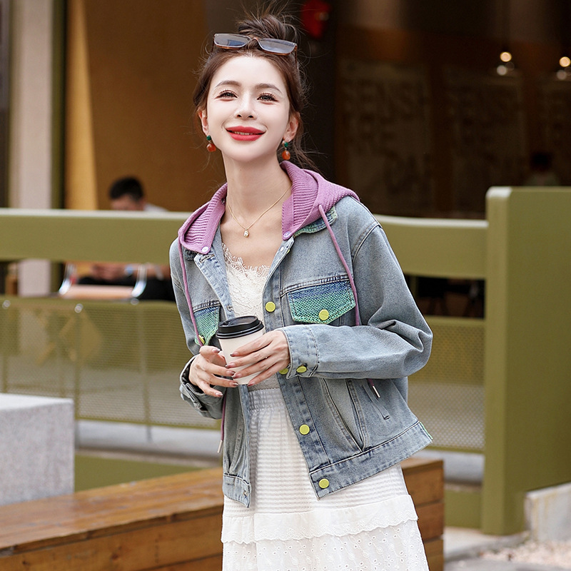 여자 유럽역 2025 초봄 신형 한국식 올매치 슬림 재킷 대조 니트 후드 데님 재킷