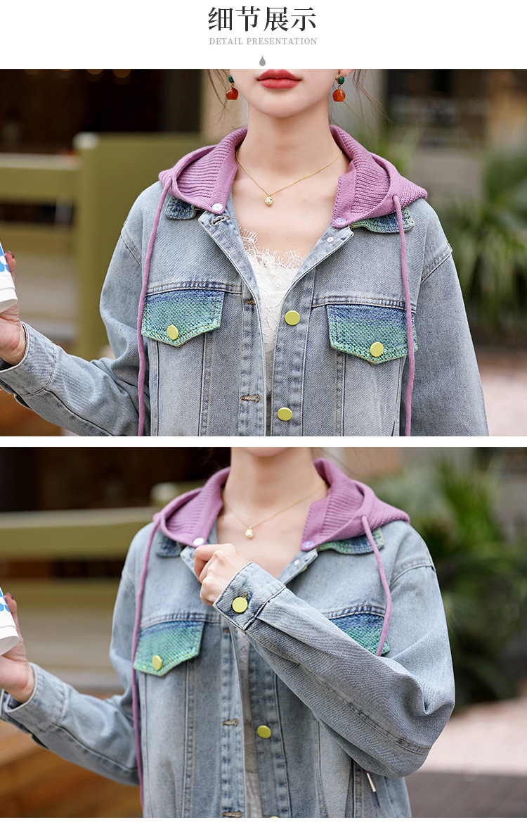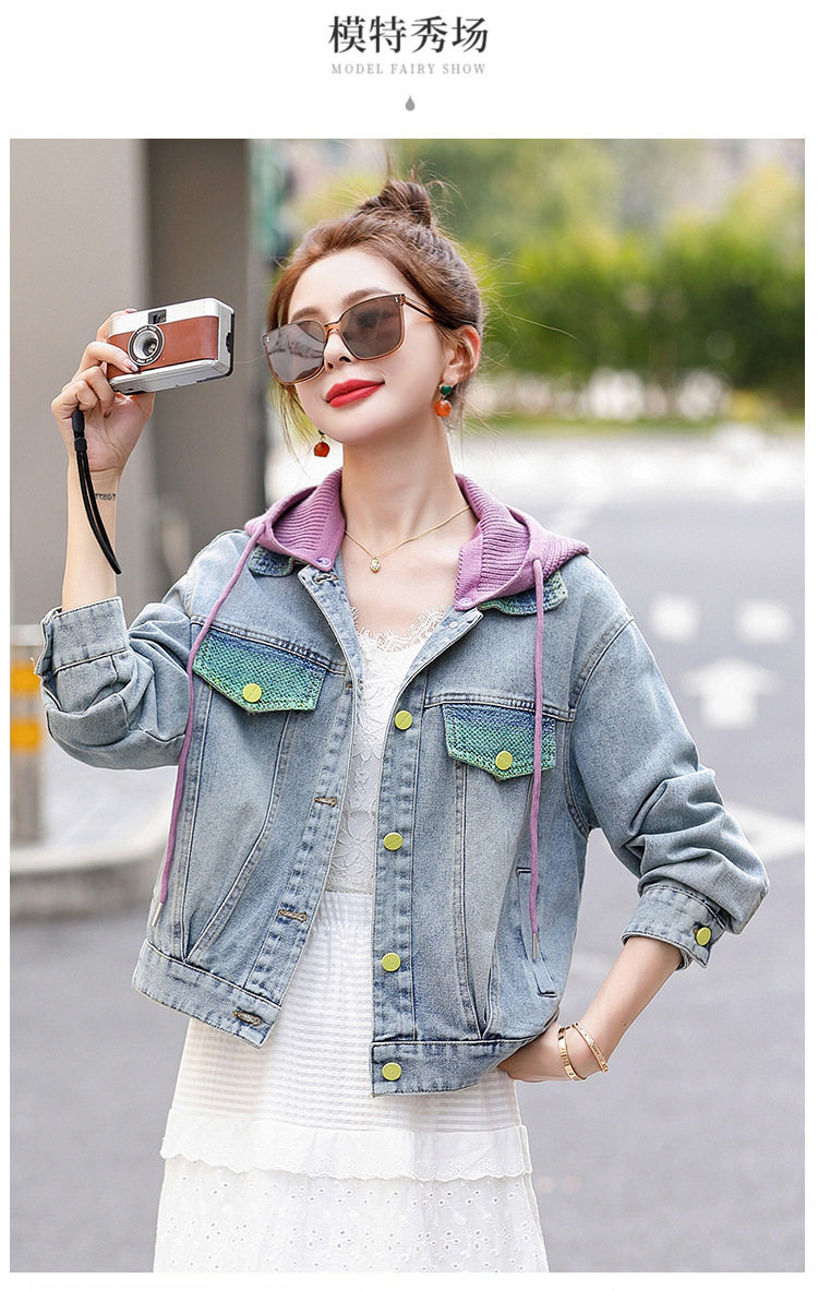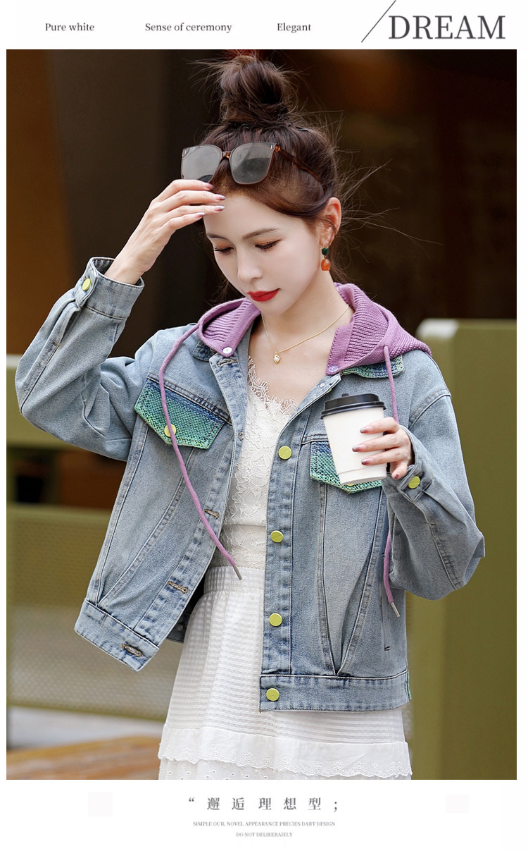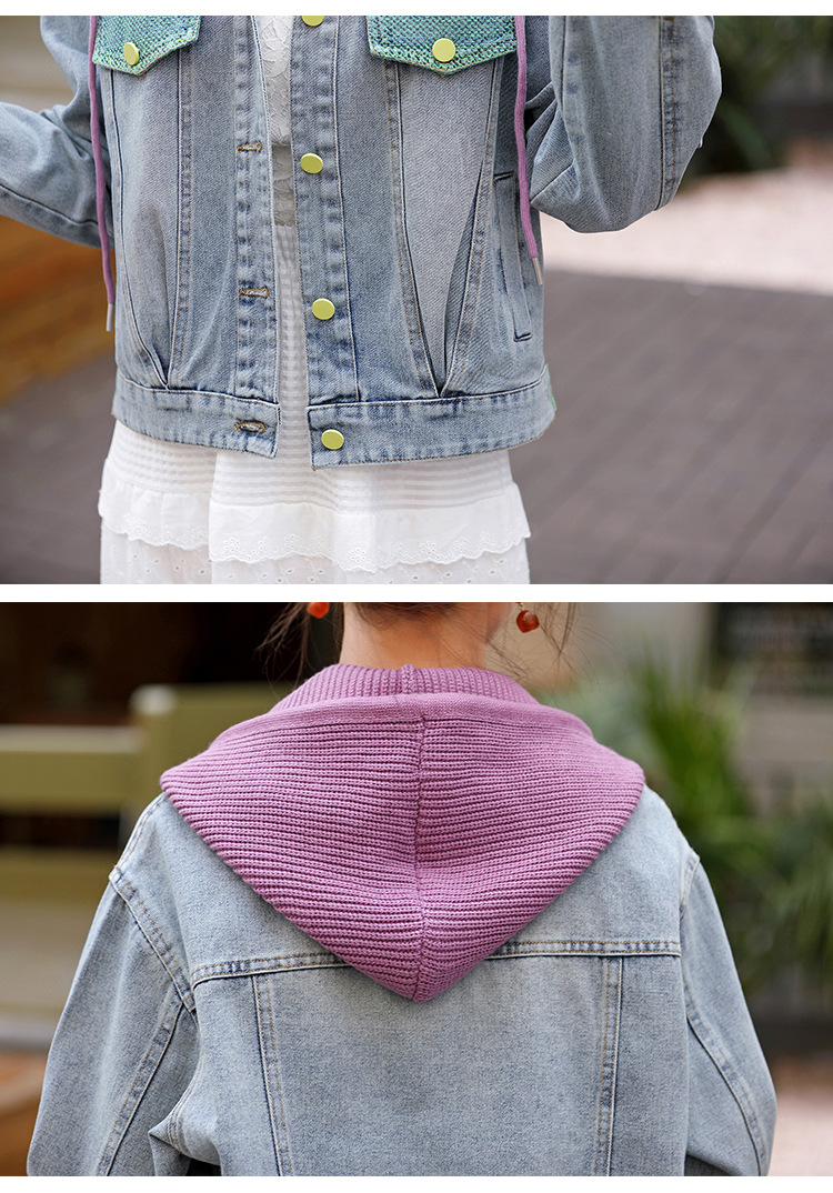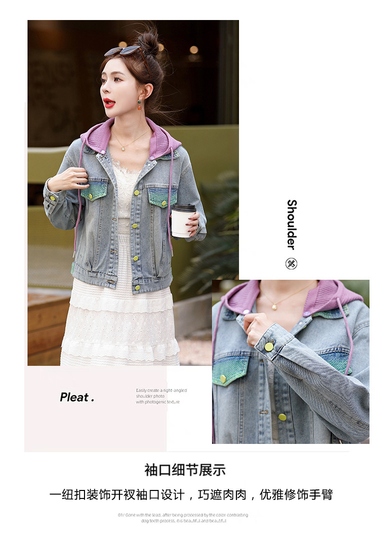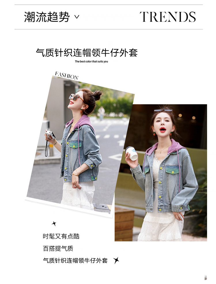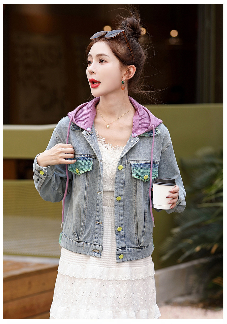 여자 유럽역 2025 초봄 신형 한국식 올매치 슬림 재킷 대조 니트 후드 데님 재킷