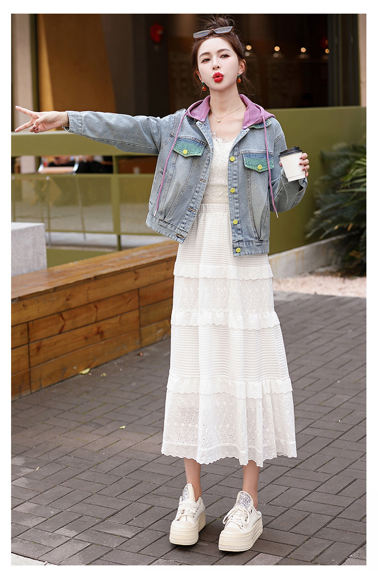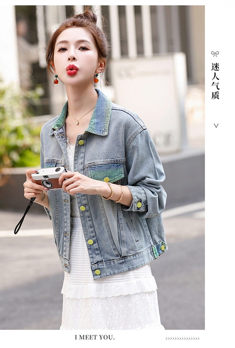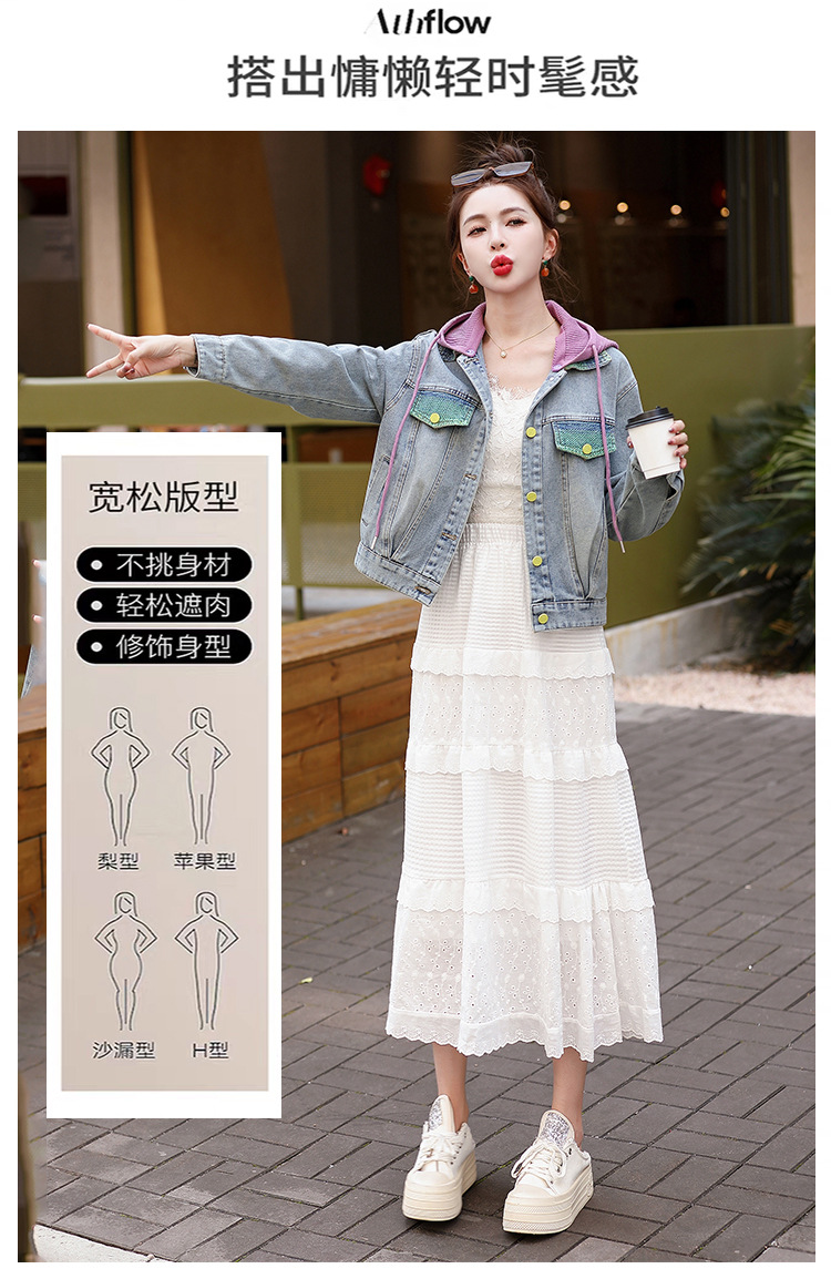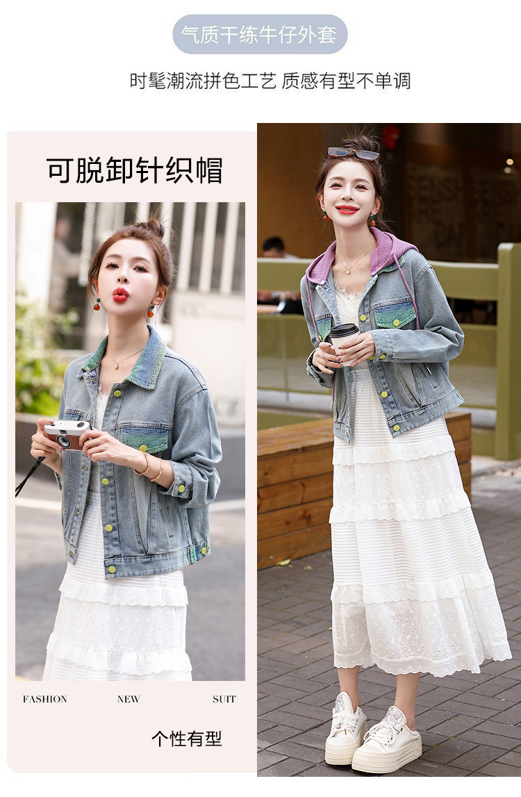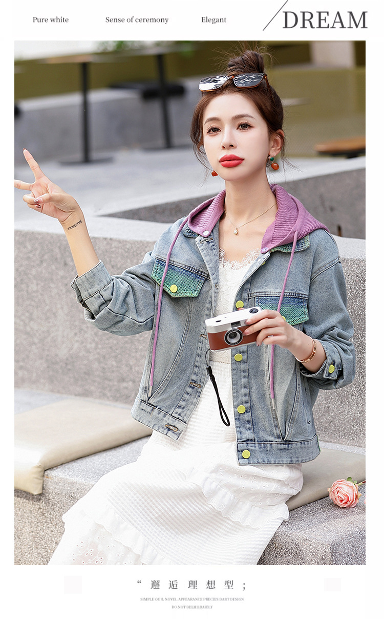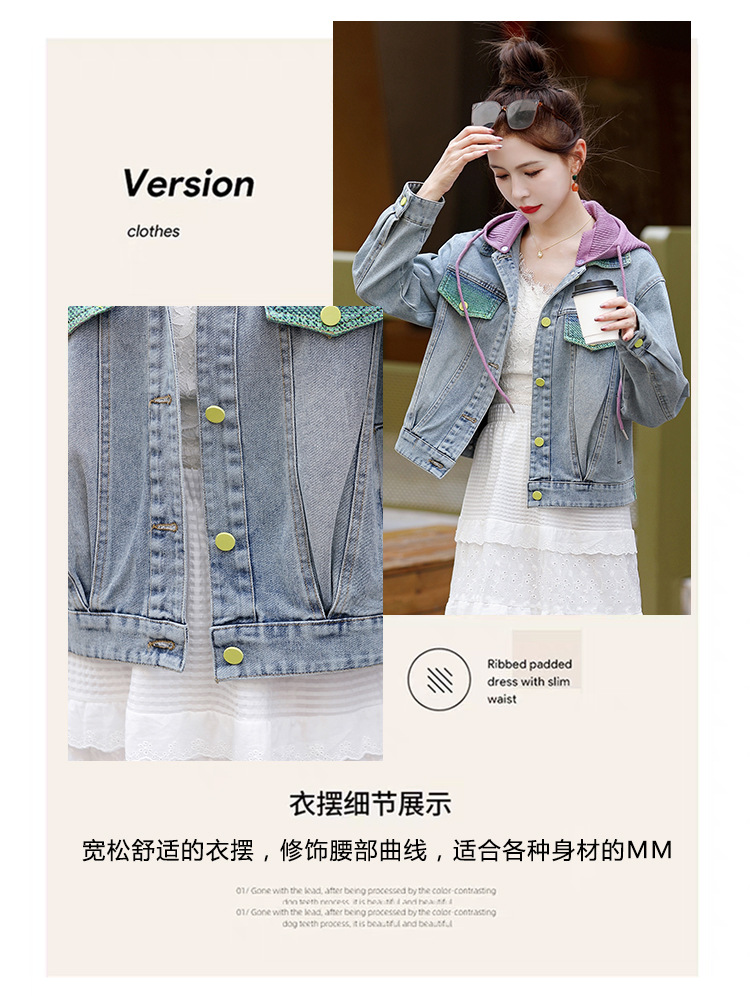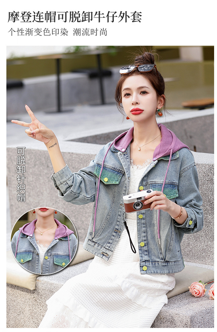 여자 유럽역 2025 초봄 신형 한국식 올매치 슬림 재킷 대조 니트 후드 데님 재킷