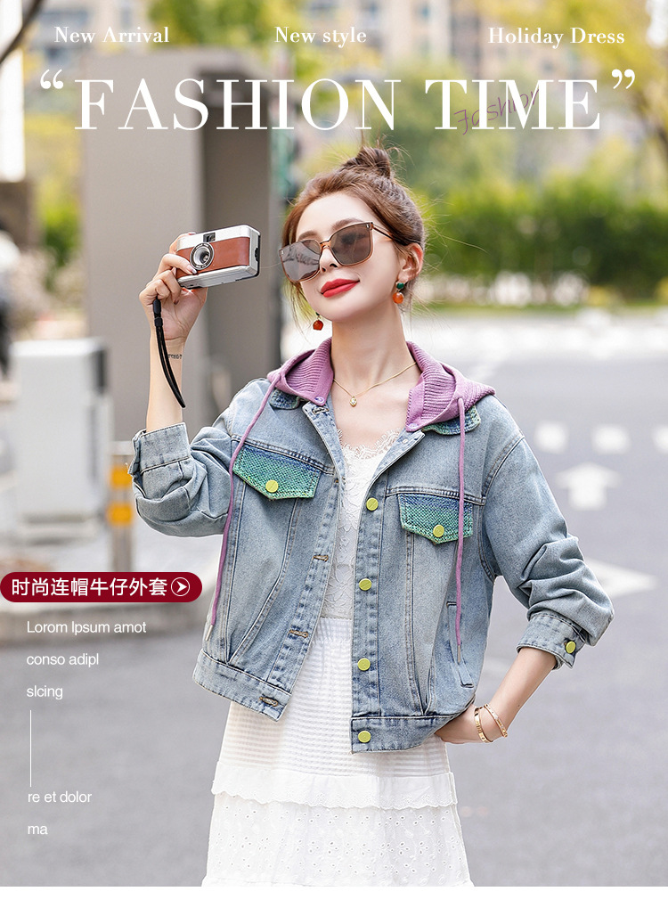 여자 유럽역 2025 초봄 신형 한국식 올매치 슬림 재킷 대조 니트 후드 데님 재킷스토어 가기