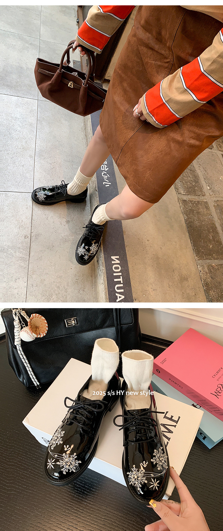 둥근 발가락 브로그 신발 여성의 2025 봄 새로운 깊은 입 신발 자수 꽃 두꺼운 밑창 작은 가죽 신발 레이스 업 신발스토어 가기