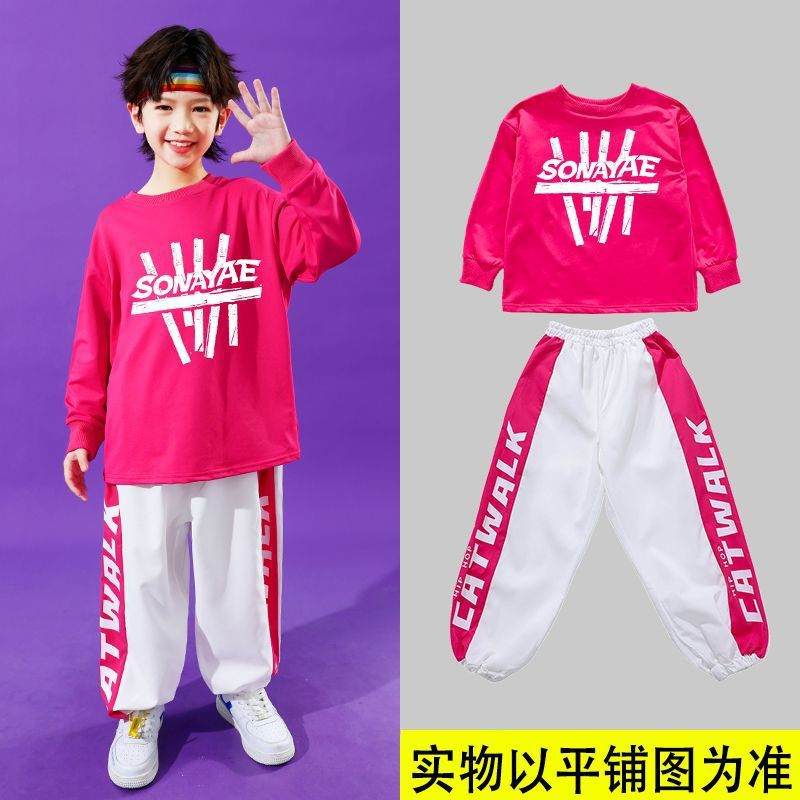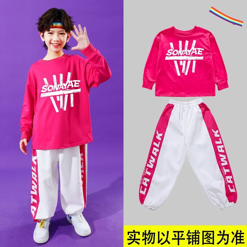 • 소년의 로즈 레드 스웨트셔츠 + 로즈 레드 스트라이프 화이트 바지