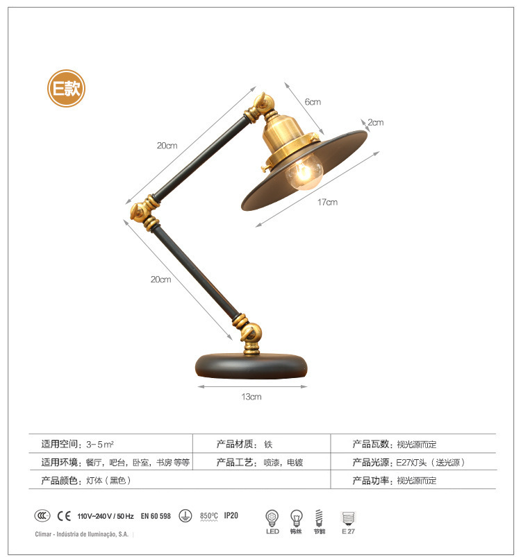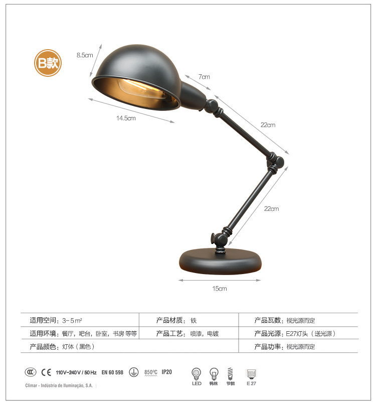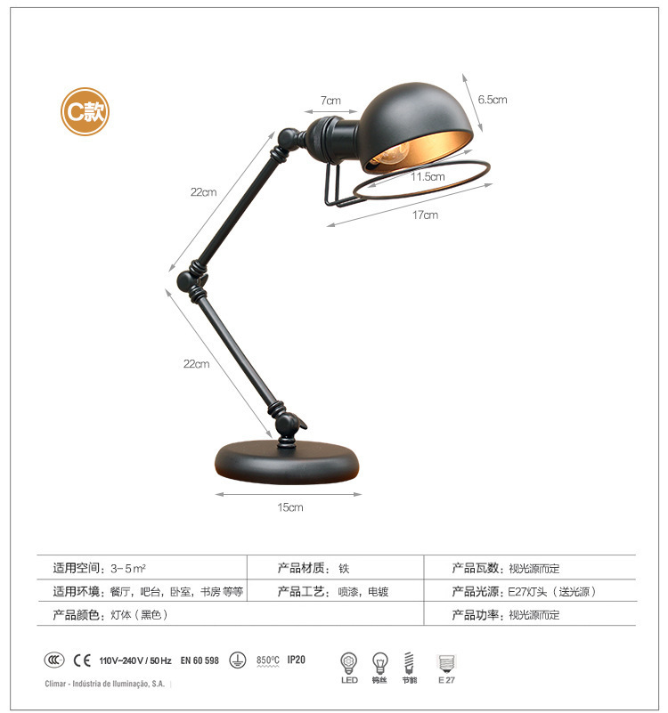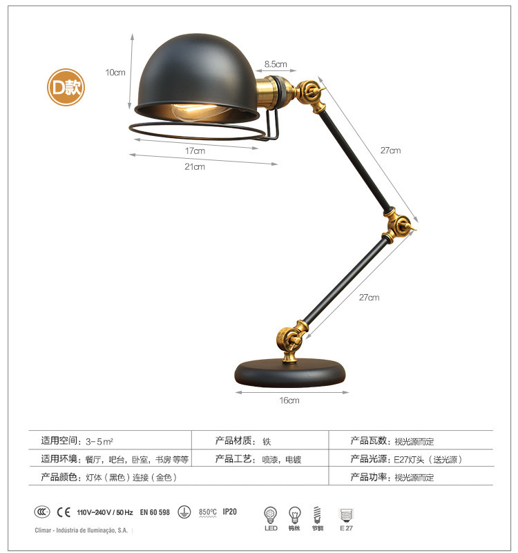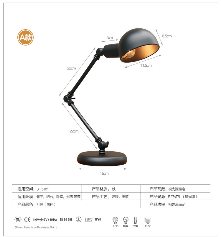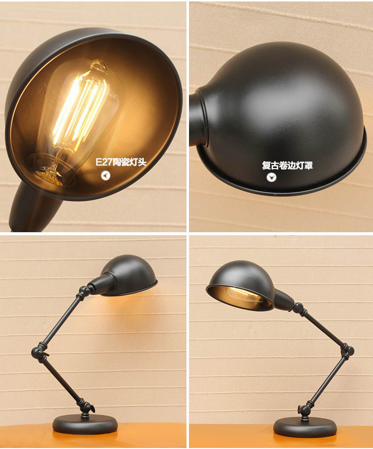 북유럽 로커 긴 팔 테이블 램프 산업 스타일 레트로 창조적 인 로프트 침실 침대 바 학생 눈 보호 테이블 leb