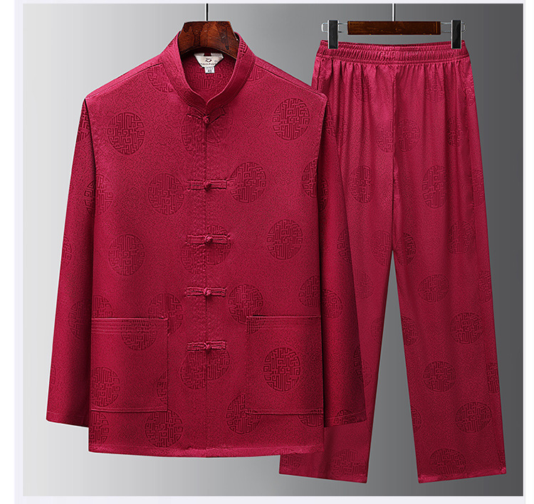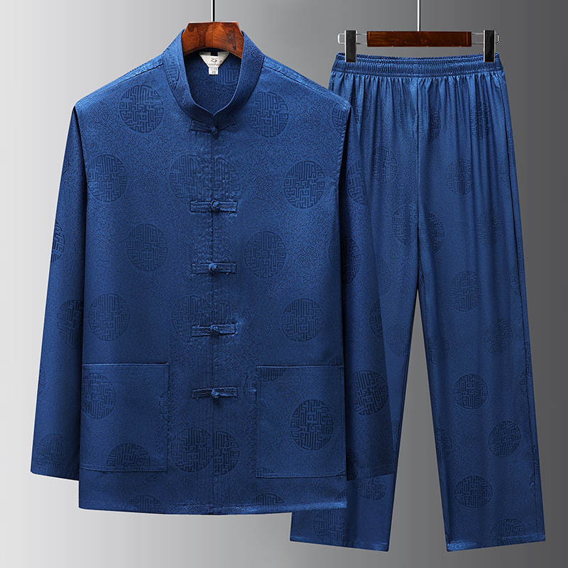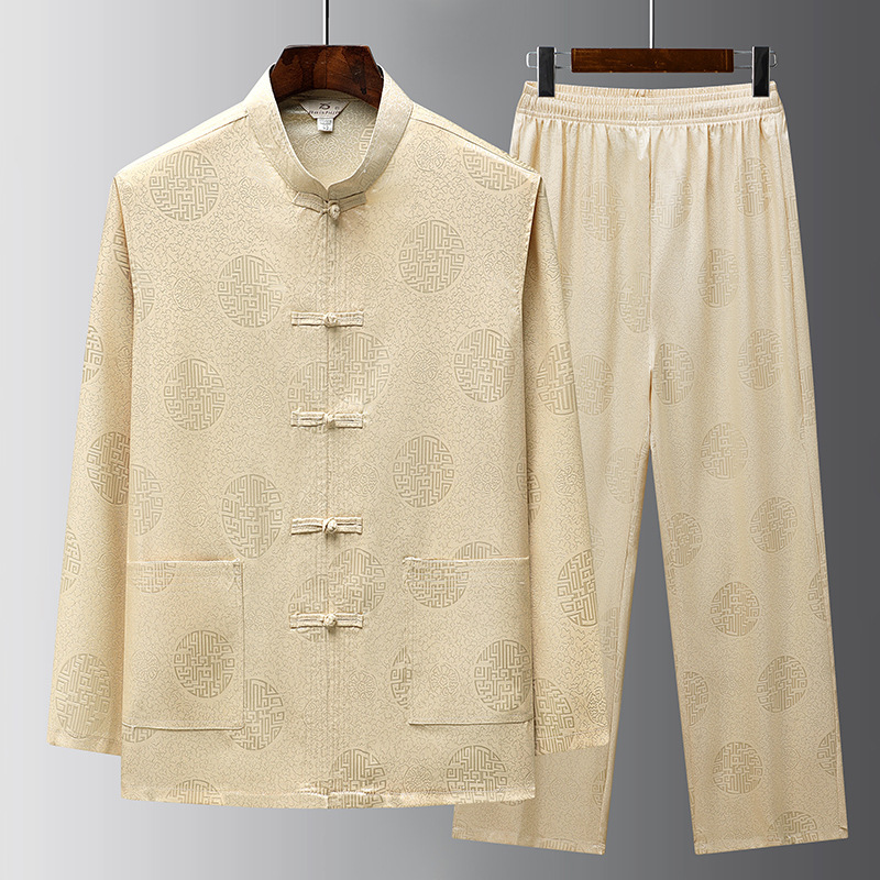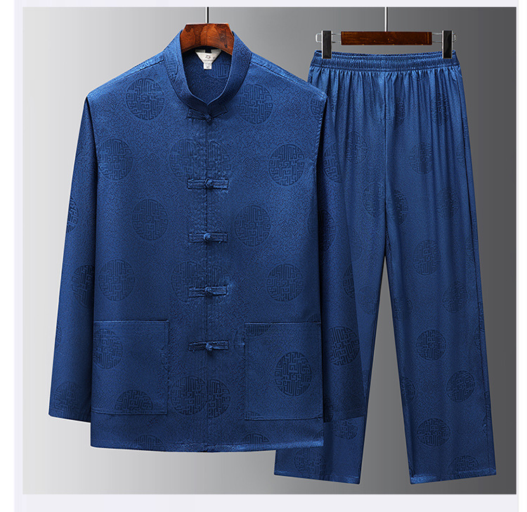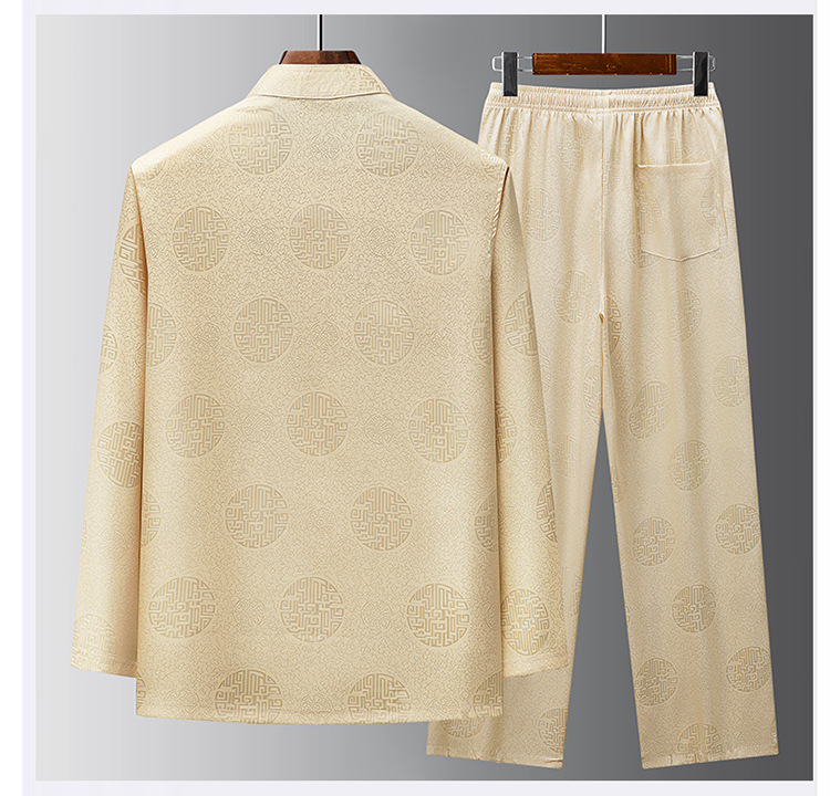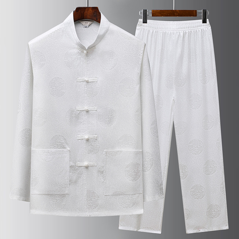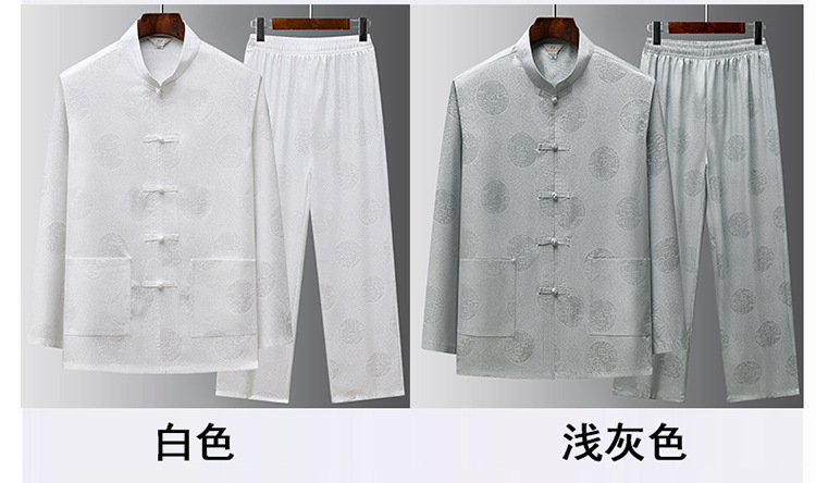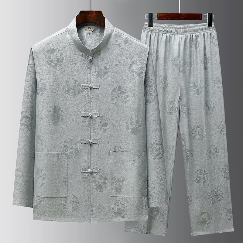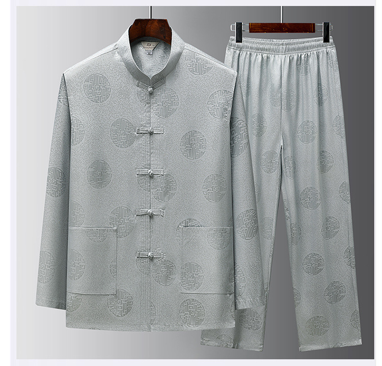 Tang 세트 남성 아이스 실크 자카드 qianxi 긴팔 탑 얇은 세트 세트 의류 노인 중국식 할아버지 여름 옷