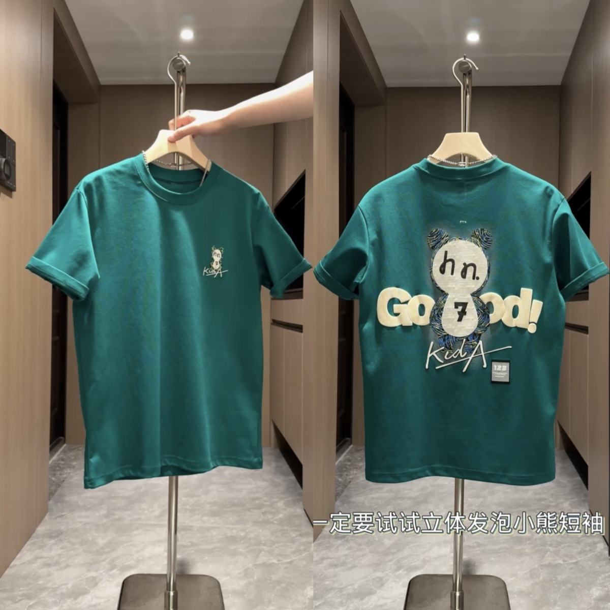 봄과 여름 새로운 유행 올 매치 남자 거품 자수 인쇄 반팔 티셔츠 느슨한 둥근 목베이스 탑스토어 가기