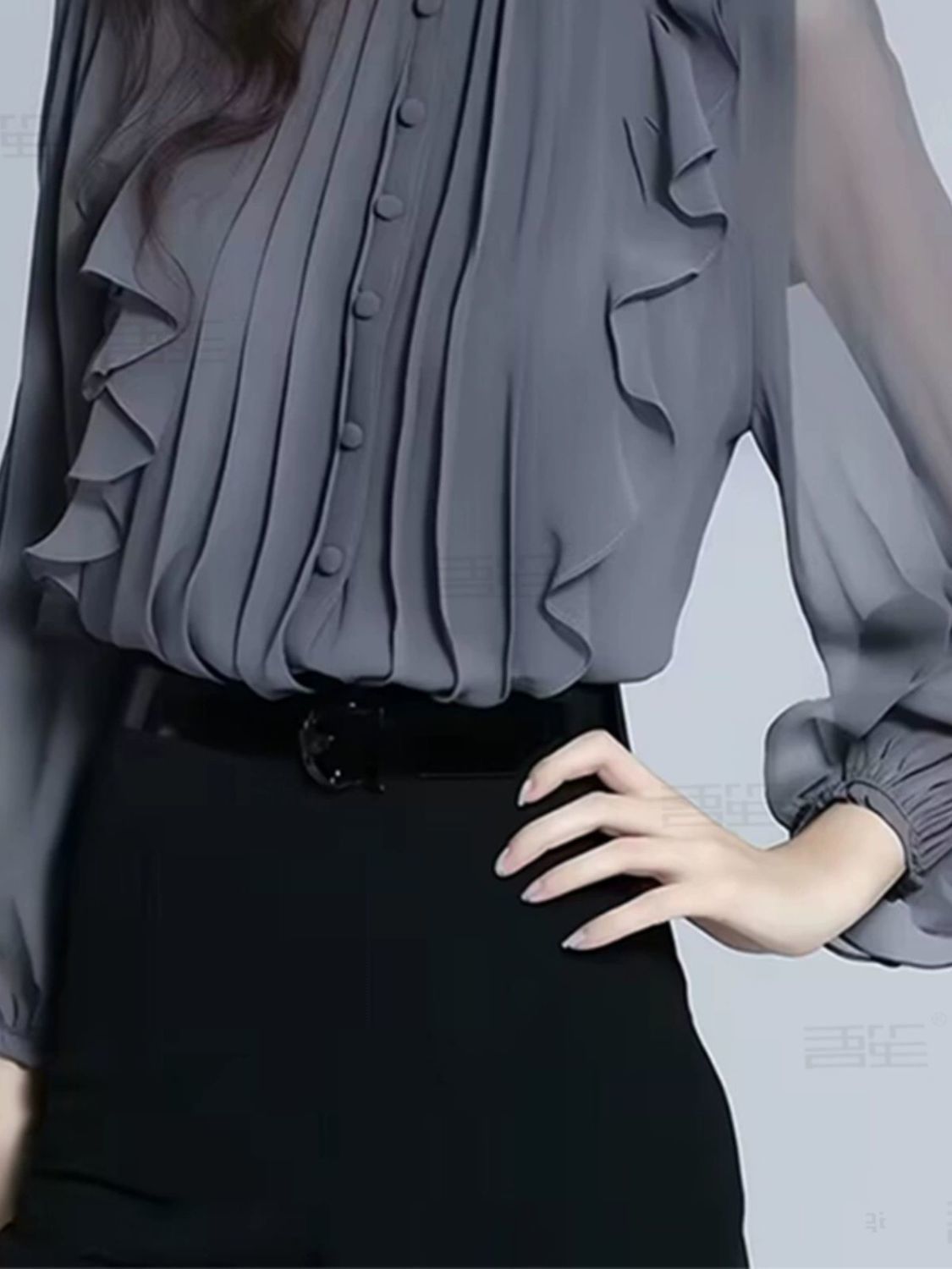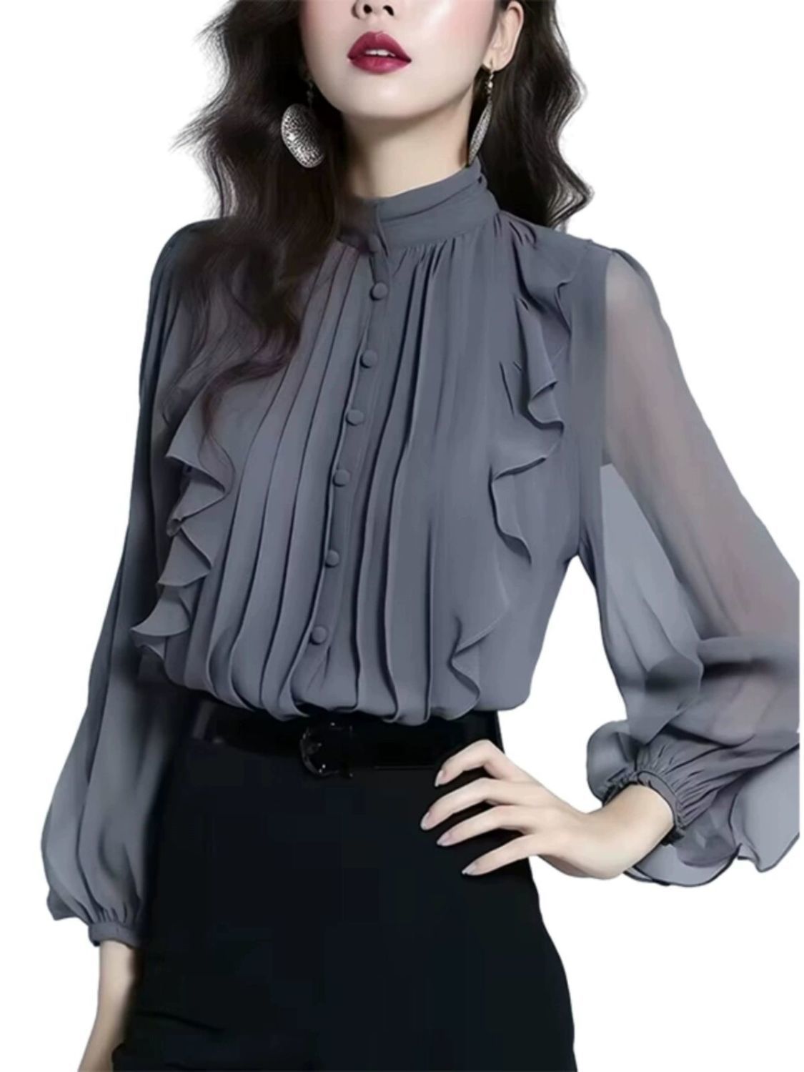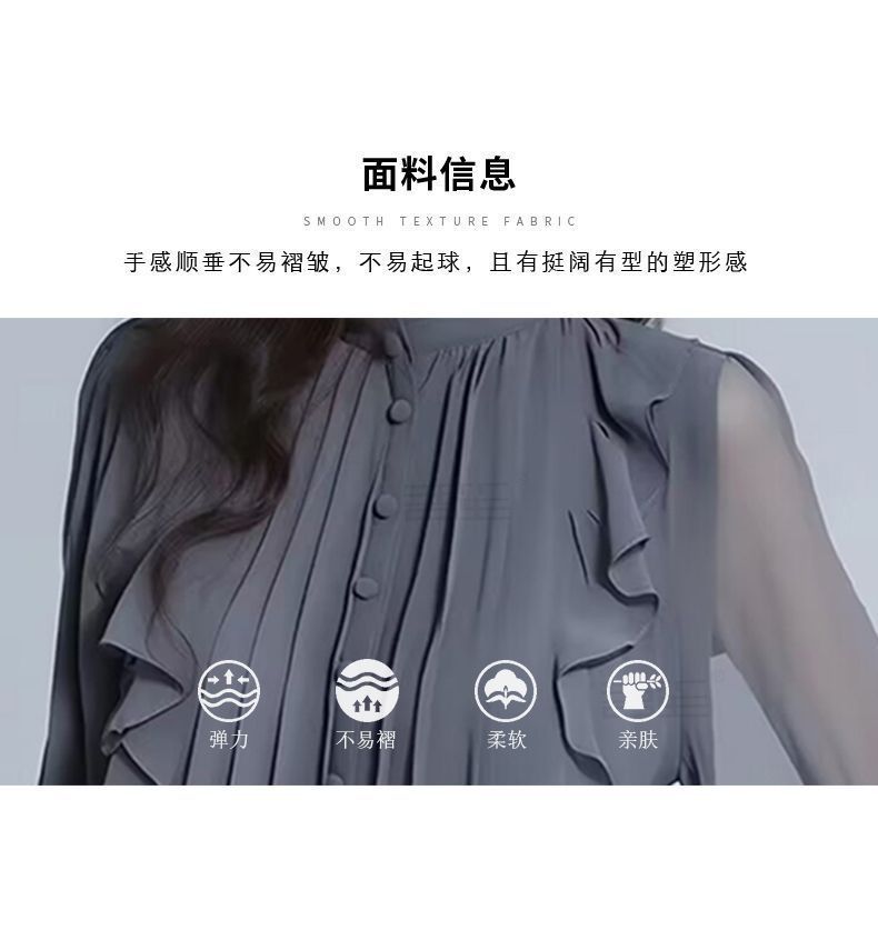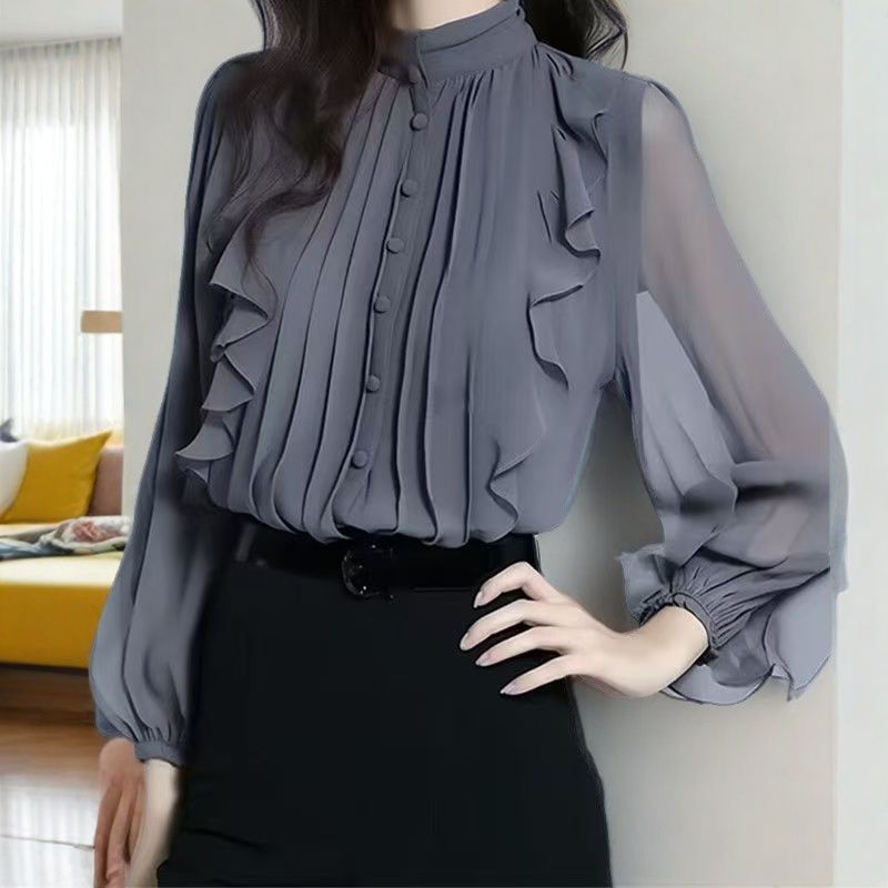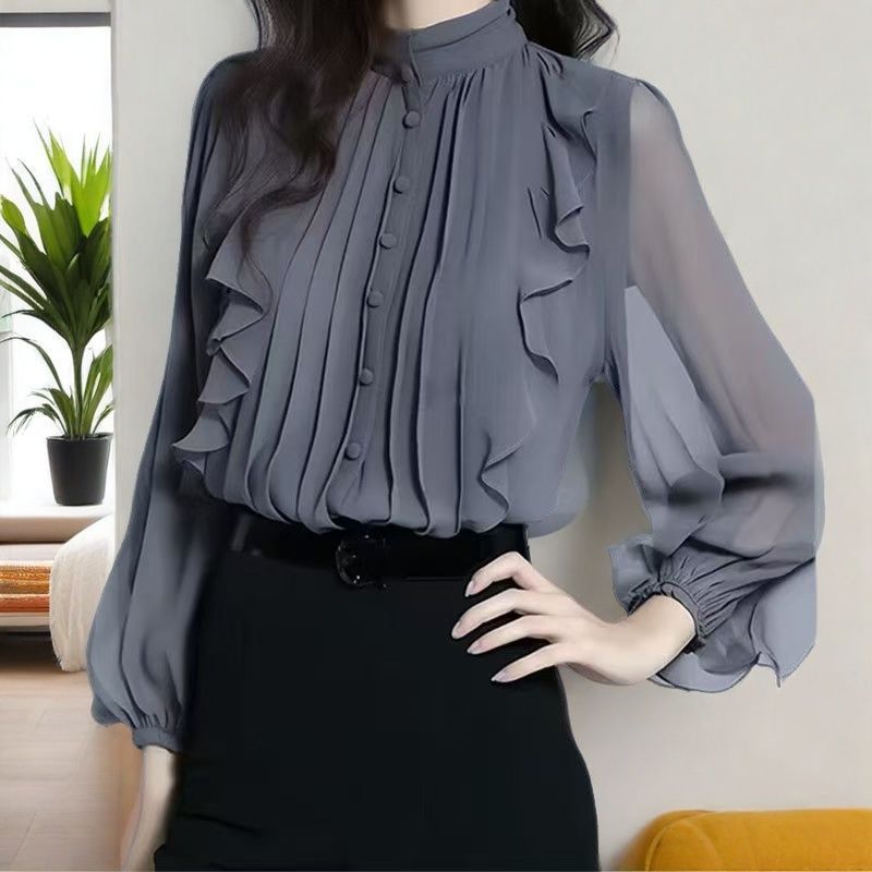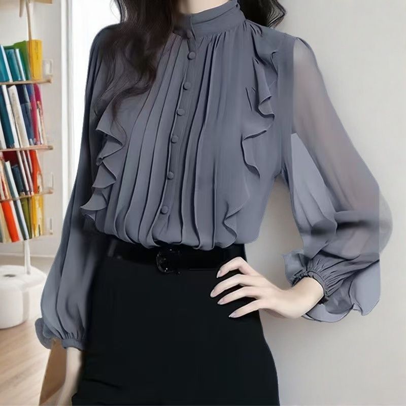 패션 하이 엔드 봄과 가을 하이 엔드 쉬폰 스탠드 칼라 프릴 셔츠 여성용 프랑스 긴 소매 작은 셔츠 최고 신제품