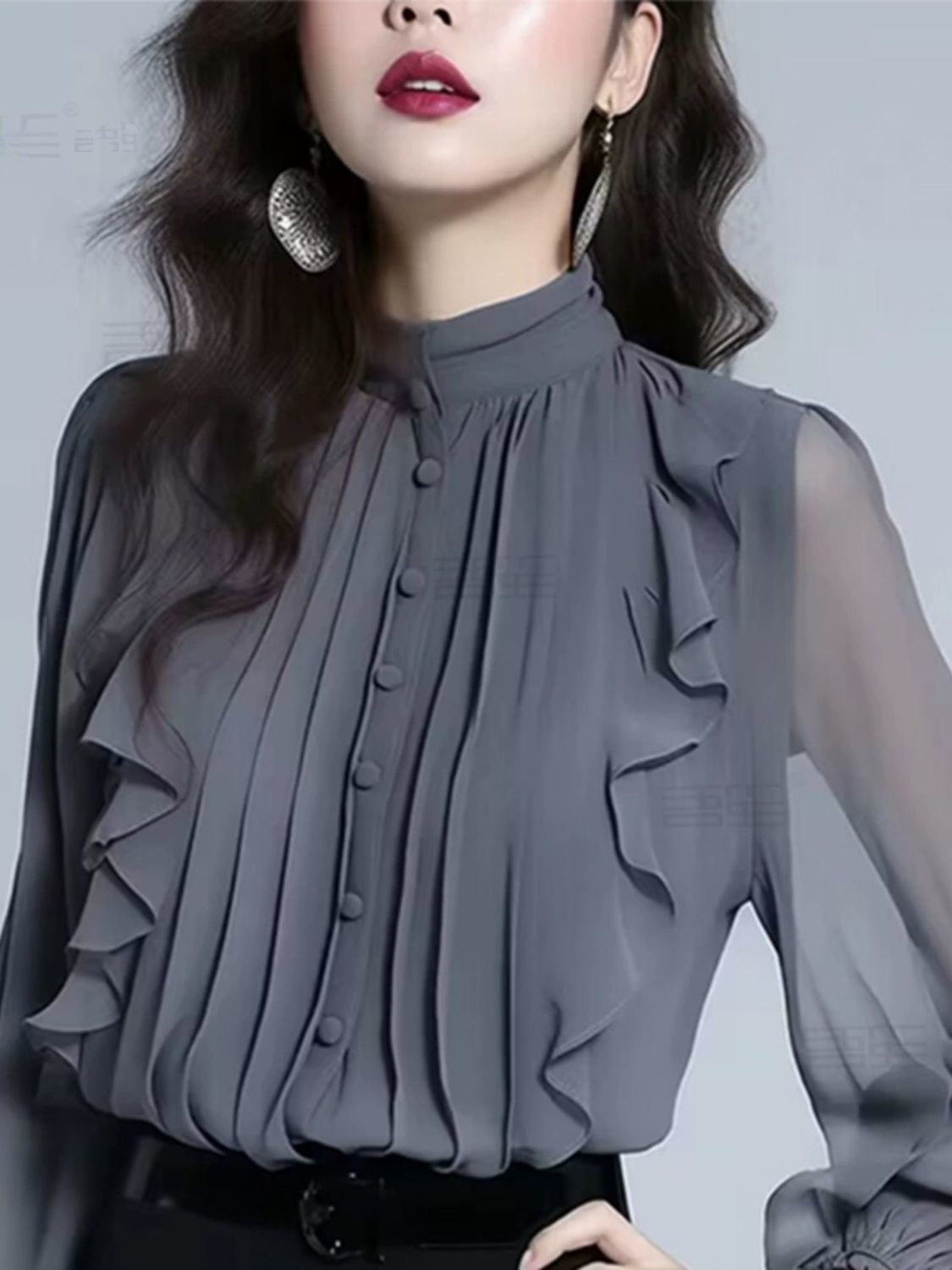 패션 하이 엔드 봄과 가을 하이 엔드 쉬폰 스탠드 칼라 프릴 셔츠 여성용 프랑스 긴 소매 작은 셔츠 최고 신제품스토어 가기
