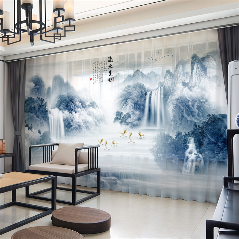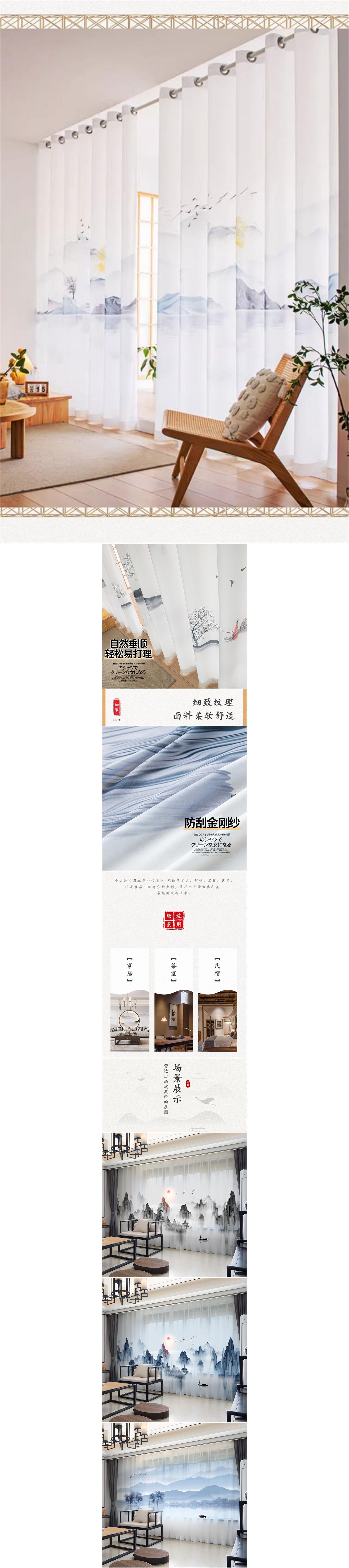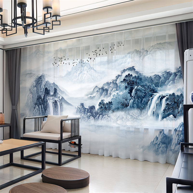 2025 새로운 중국 스타일 커튼 젠 티 룸 거실 중국 스타일 클래식 잉크 풍경 페인팅 투명 불투명 거즈 커튼