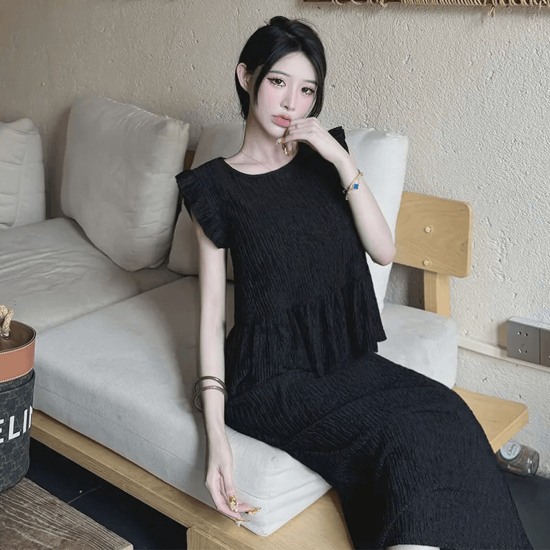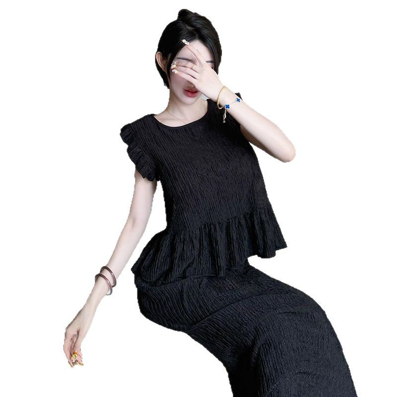 2025 서양식 봄과 여름 프랑스 검은 느슨한 바느질 새로운 우아한 투피스 여성의 여름 캐주얼 세트 탑