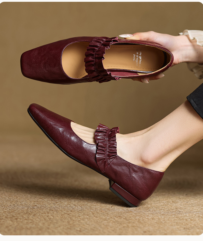 스퀘어 헤드 메리 제인 신발 여성 2025 봄 새로운 낮은 입 저발 두꺼운 힐 신발 레이스 다크 브라운 양가죽 신발
