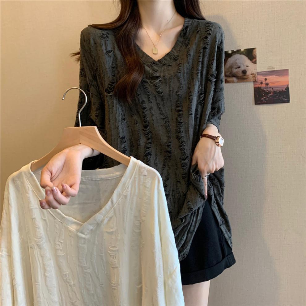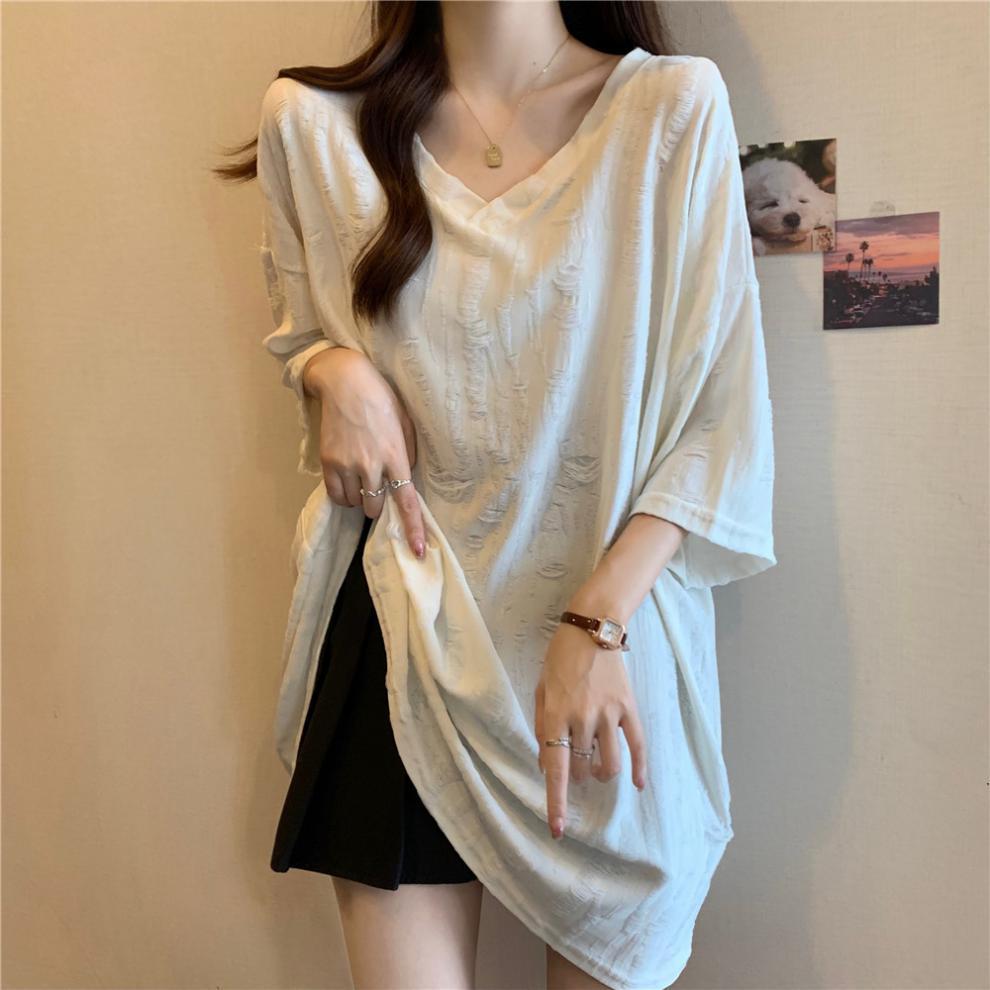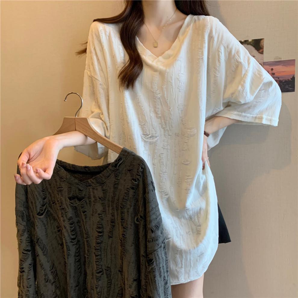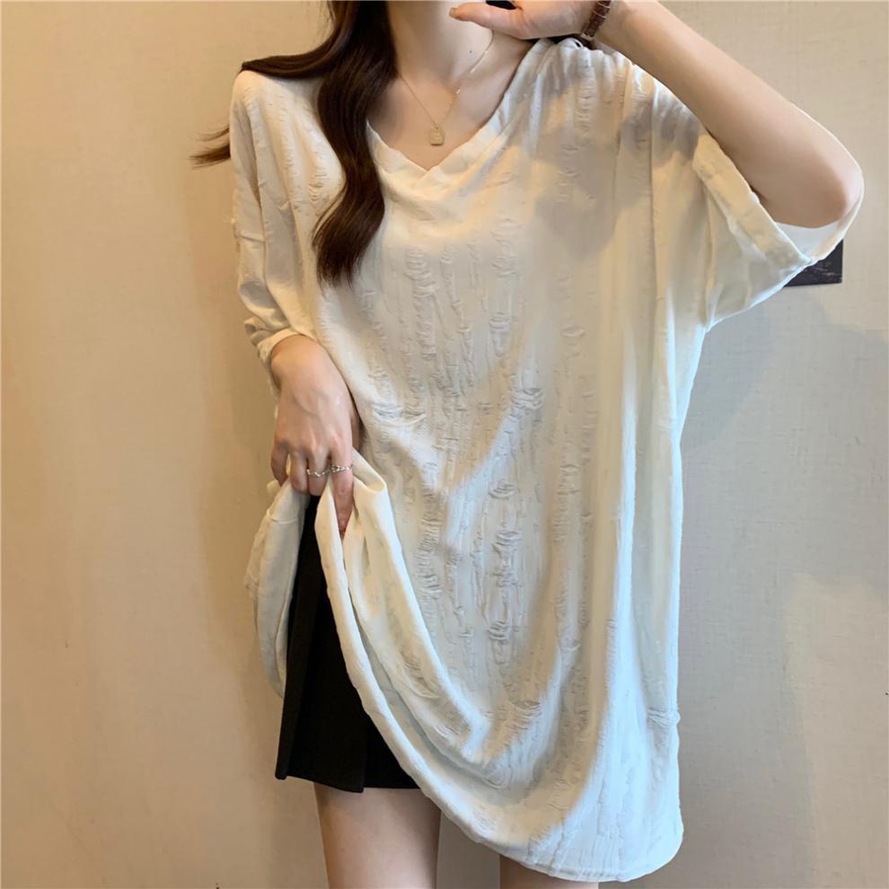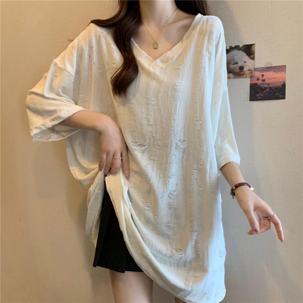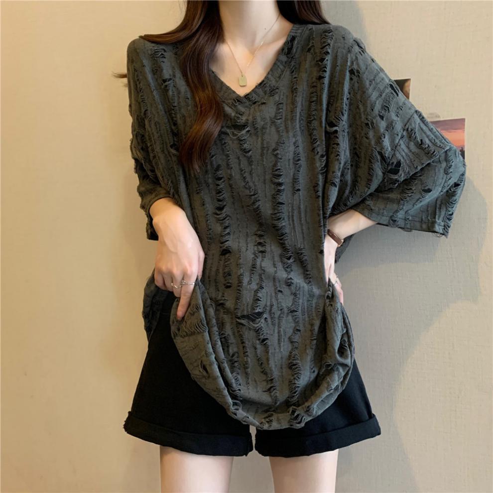 여성용 반소매 중장 탑 반소매 세련된 패션 플러스 사이즈 통통녀 여름용 루즈 벨리 커버 V 넥 반팔 티셔츠