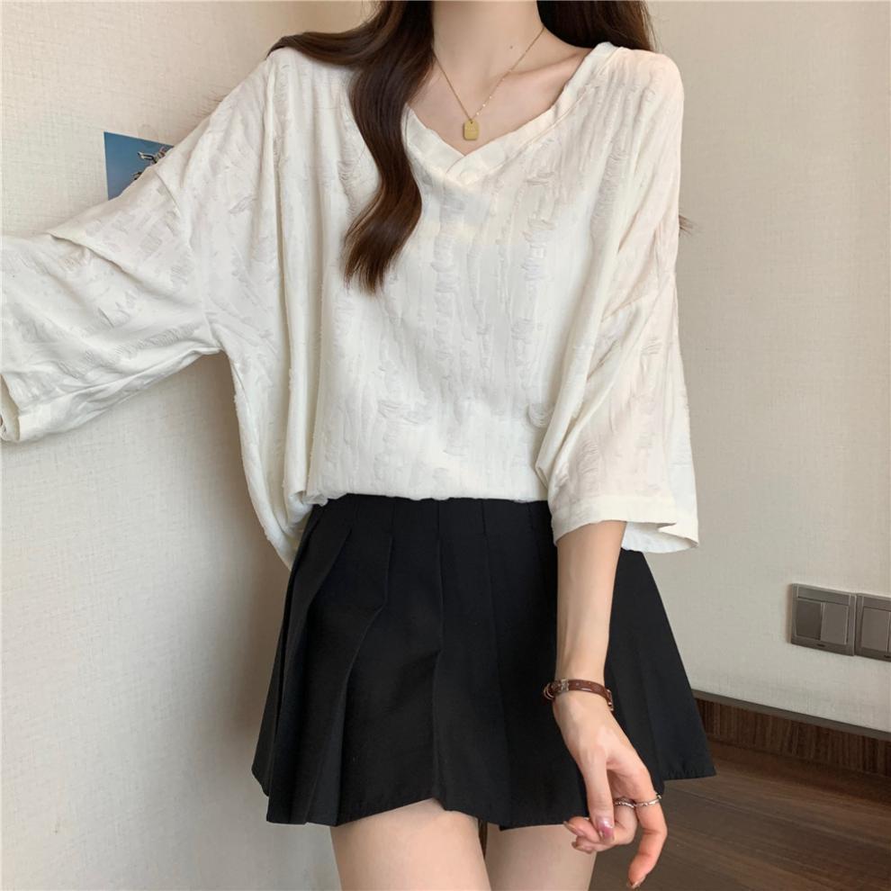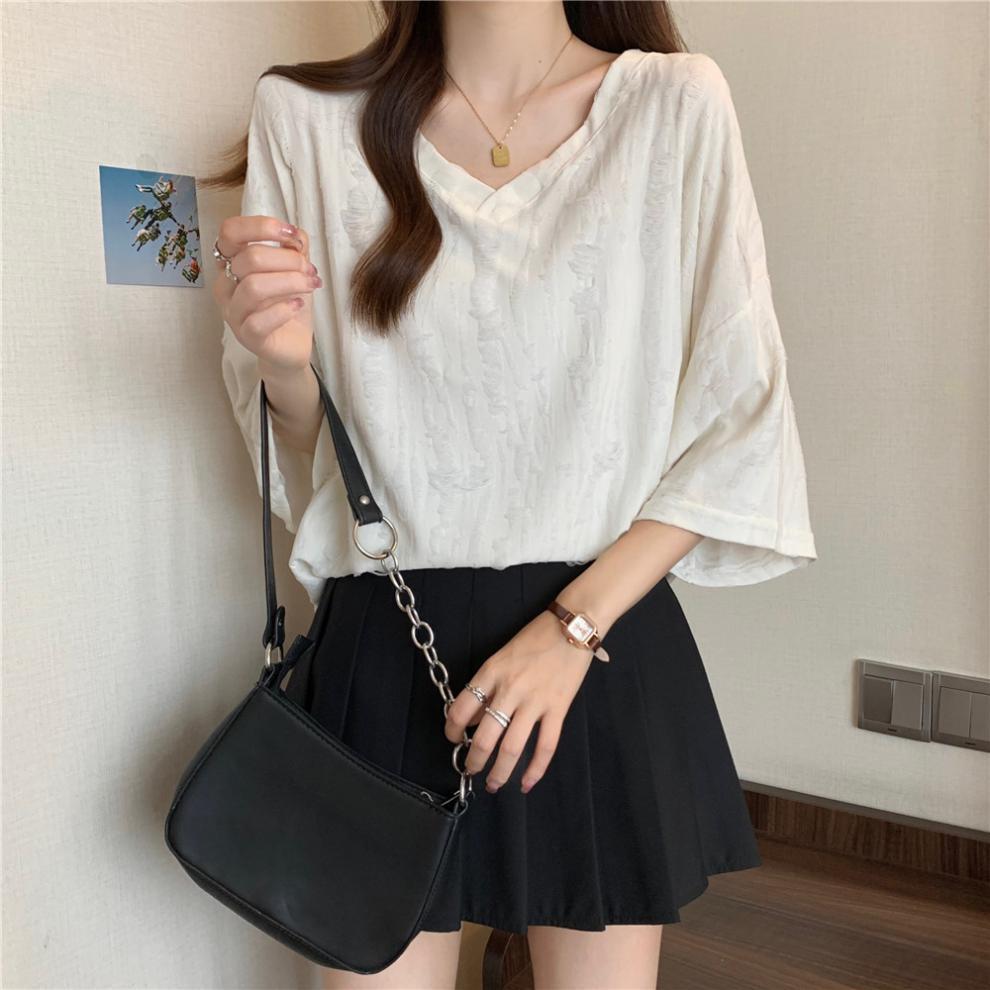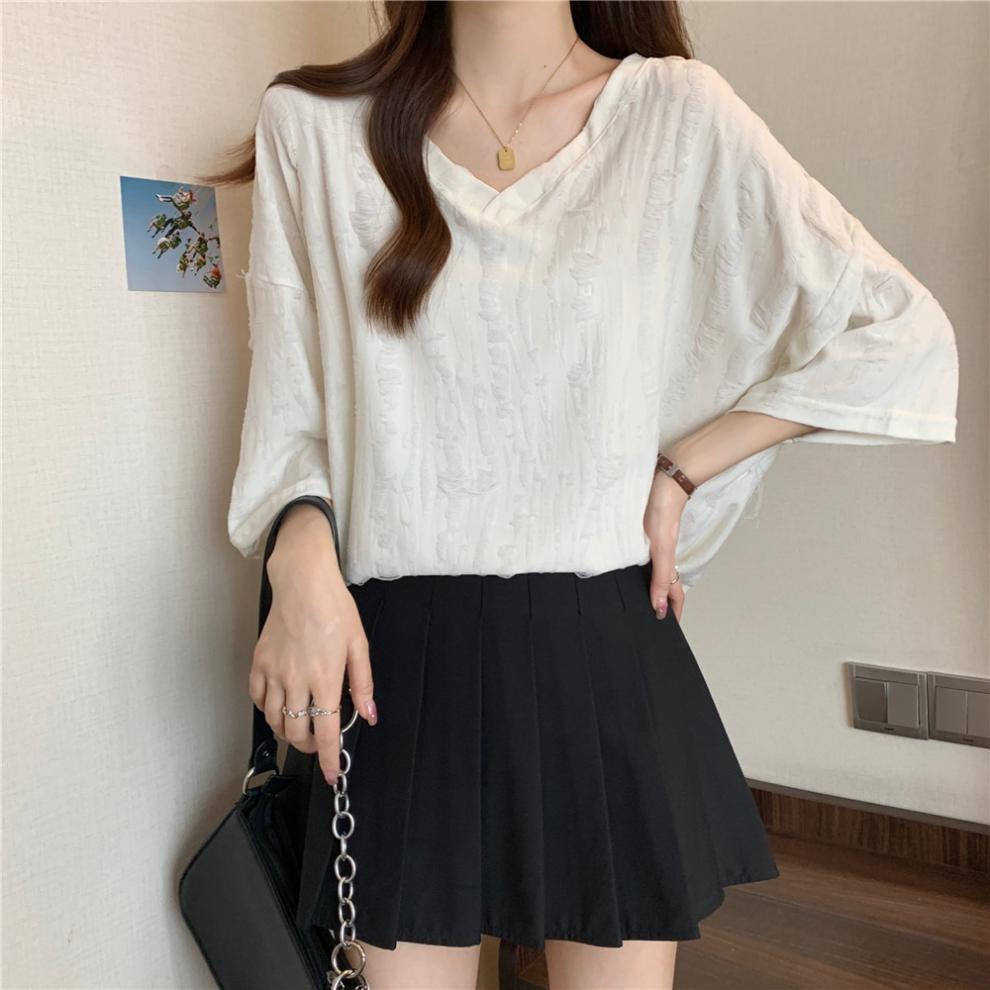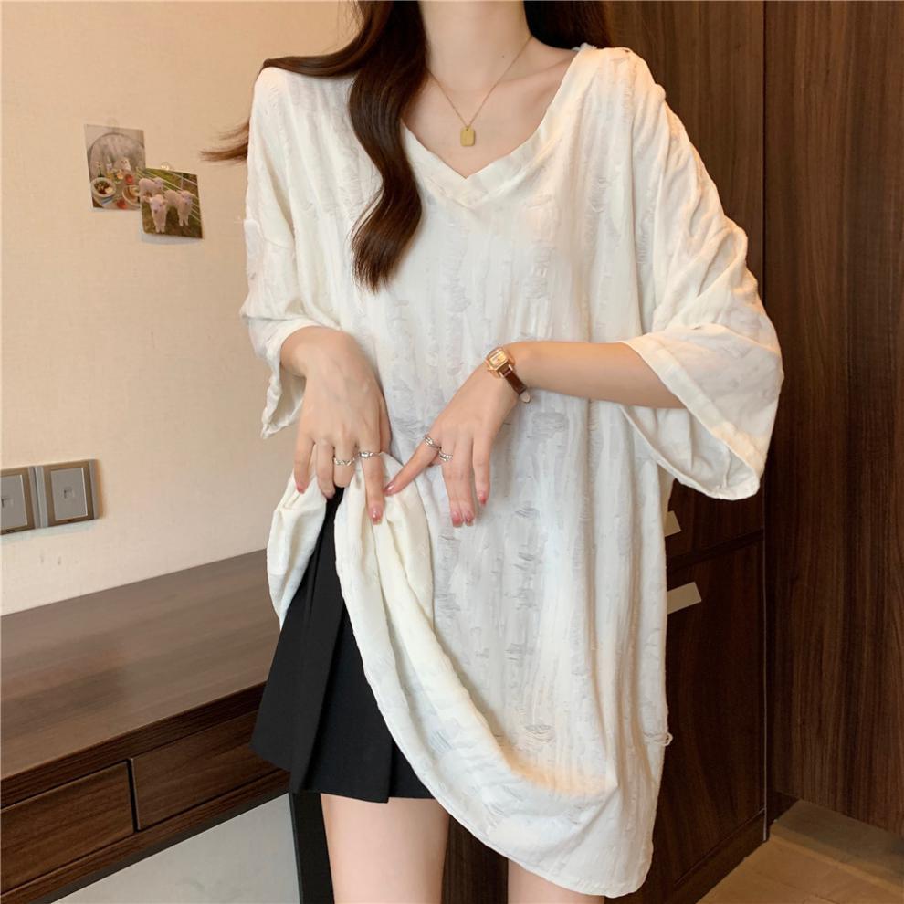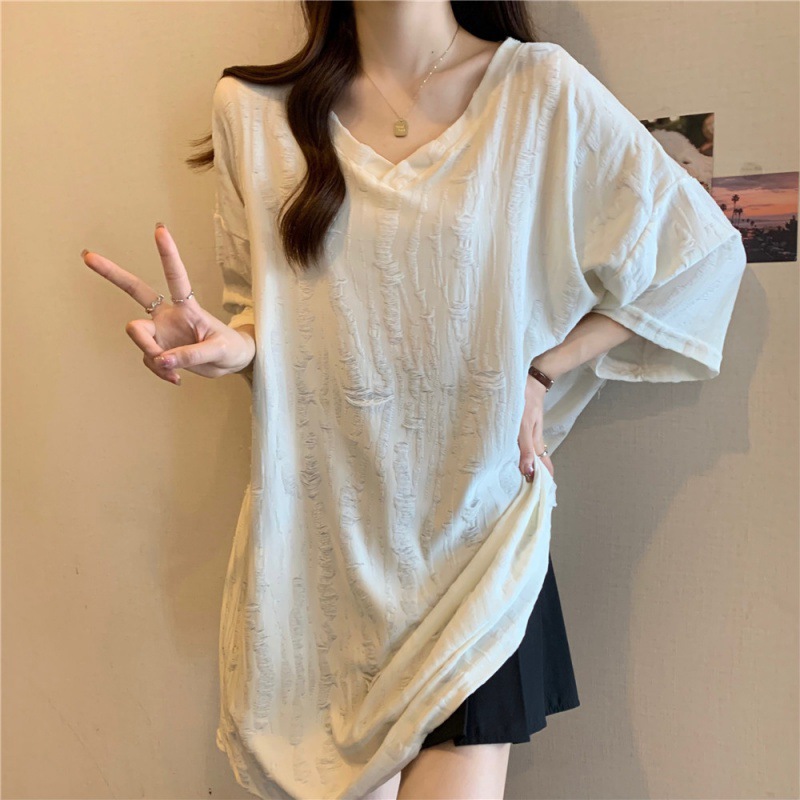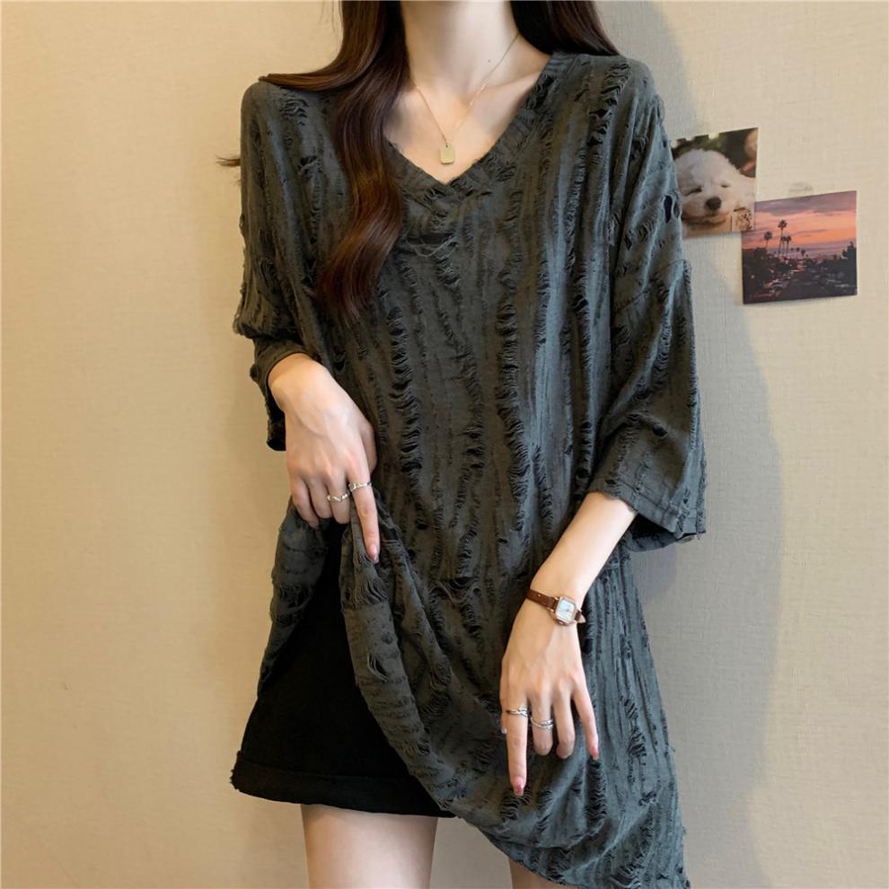 여성용 반소매 중장 탑 반소매 세련된 패션 플러스 사이즈 통통녀 여름용 루즈 벨리 커버 V 넥 반팔 티셔츠