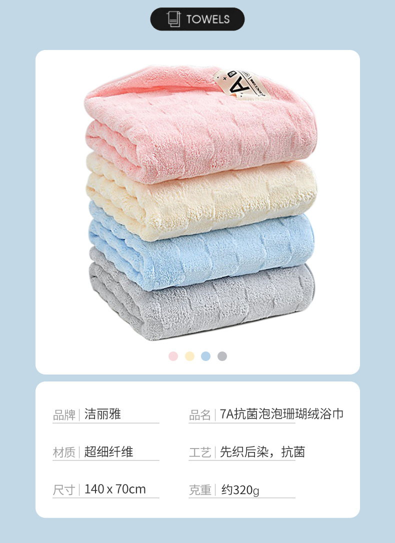 Jielia 7A 세균성 산호 양털 목욕 타월 부드러운 흡수성 가정용 해변 포장 목욕 타월 Jielia 240357스토어 가기