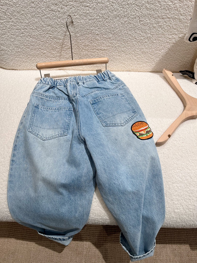 Mshnedid 한국 스타일 햄버거 자수 아동용 청바지 봄 바지 남녀 공용 클래식 캐주얼 바지 긴바지스토어 가기