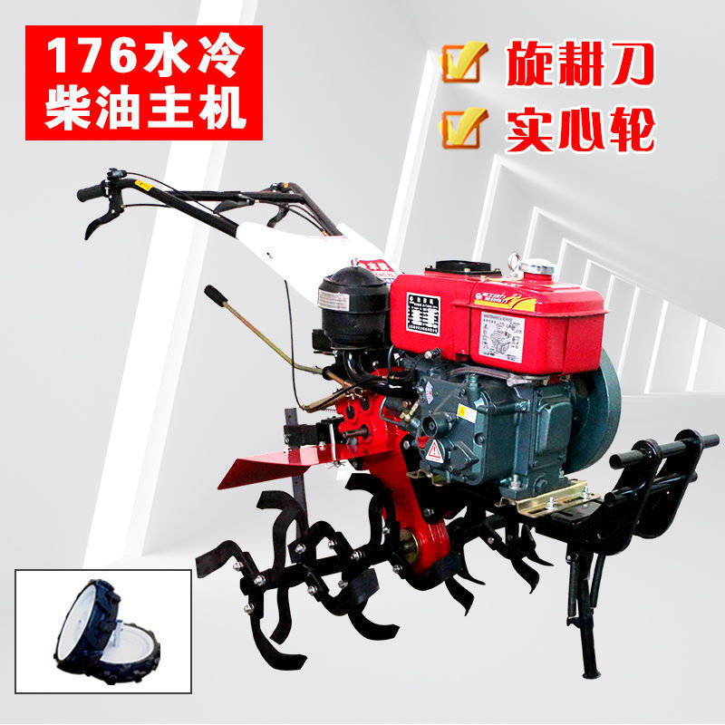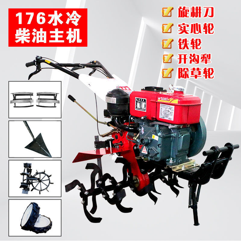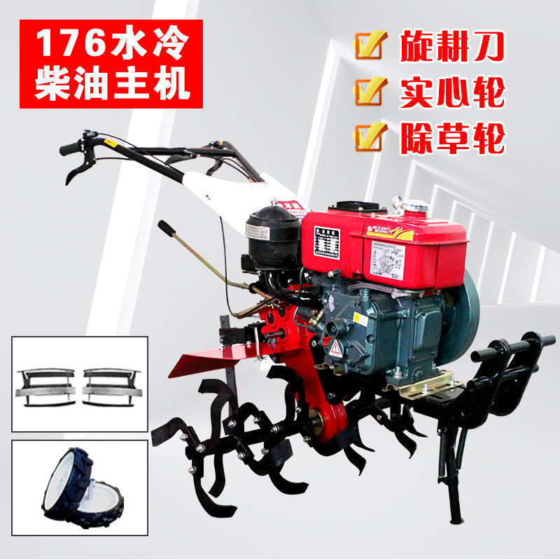 • 176 수냉식 디젤 + 회전 경운기 + 솔리드 휠 + 제초 휠 - [한정 기간 동안 무료 엔진 오일, 8열 회전 경운기, 고급 모델]
