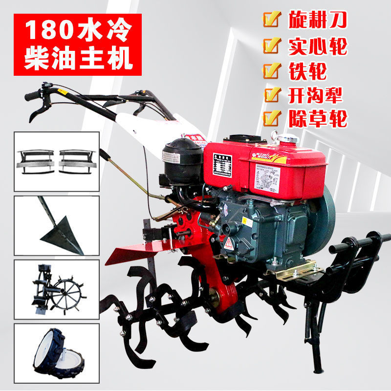 • 180 수냉식 디젤 + 회전 경운기 + 고무 및 철제 쟁기 제초 - [한정 기간 동안 무료 엔진 오일, 8열 회전 경운기, 고급 모델]