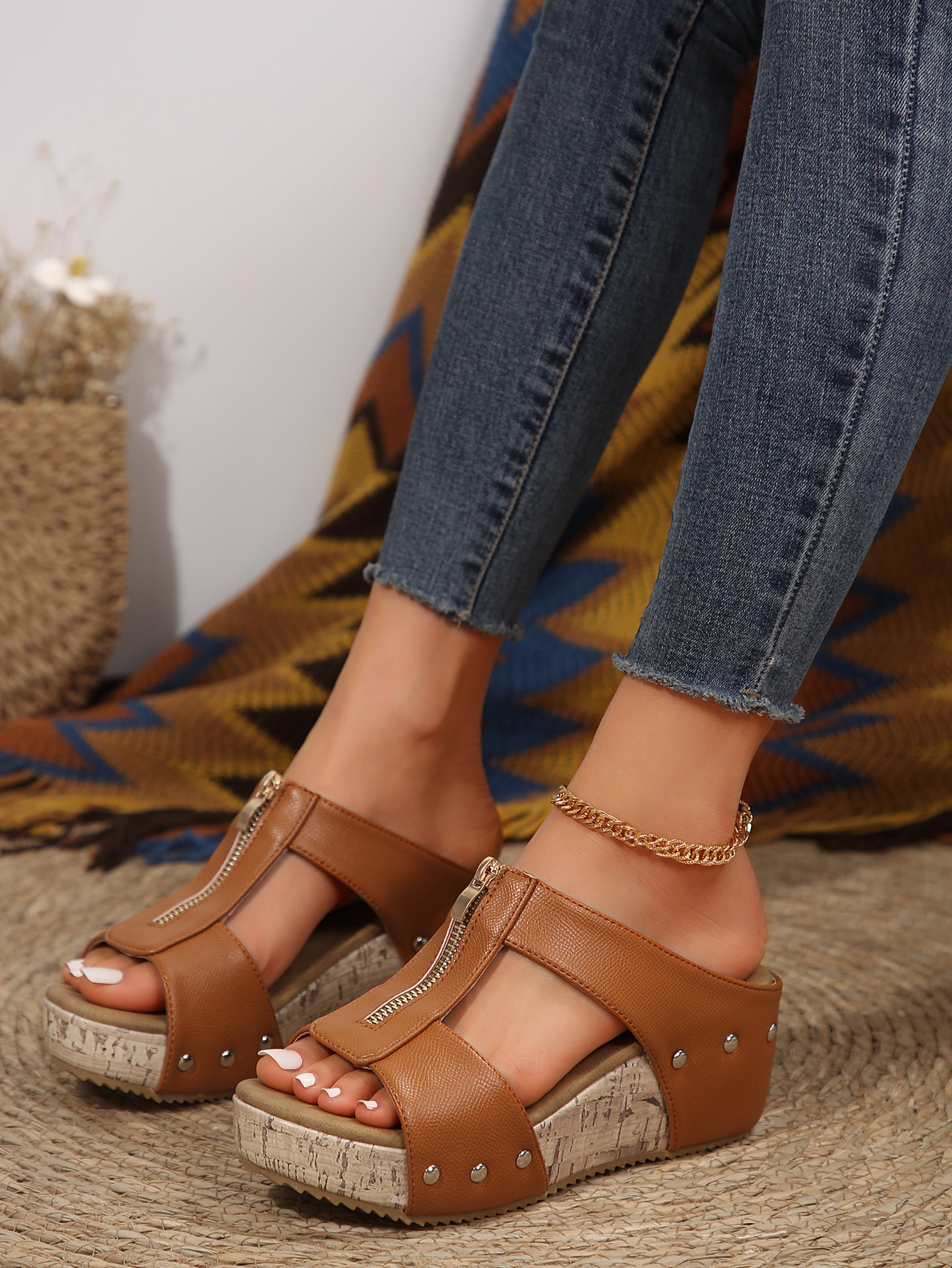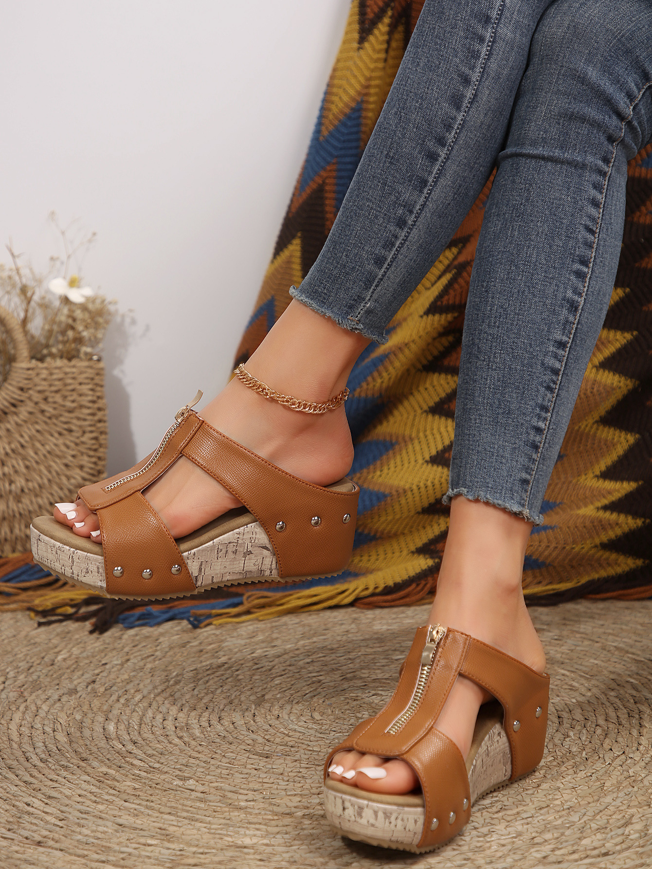 유럽과 미국의 해외 무역 직접 공급 43 플러스 사이즈 새로운 여성들이 생선 입 두꺼운 바닥 리벳 샌들 도매로 쐐기를 바랍니다.스토어 가기