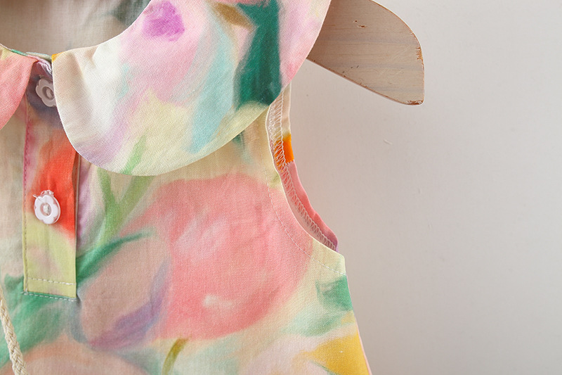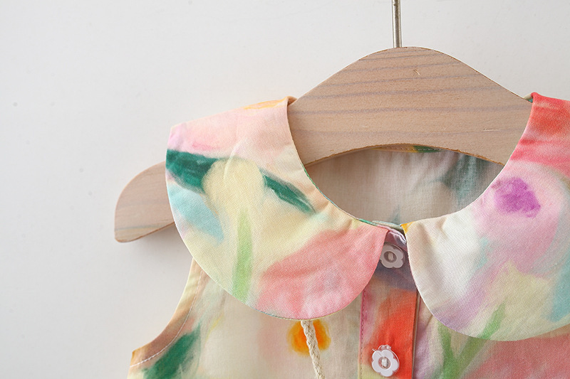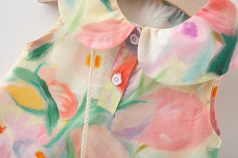 여름 새로운 아동복 도매 큰 꽃 인형 칼라 민소매 소녀 원피스 꽃 짚 짠 가방 하나