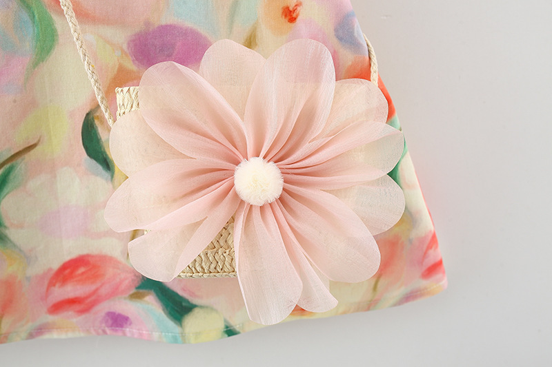 여름 새로운 아동복 도매 큰 꽃 인형 칼라 민소매 소녀 원피스 꽃 짚 짠 가방 하나스토어 가기