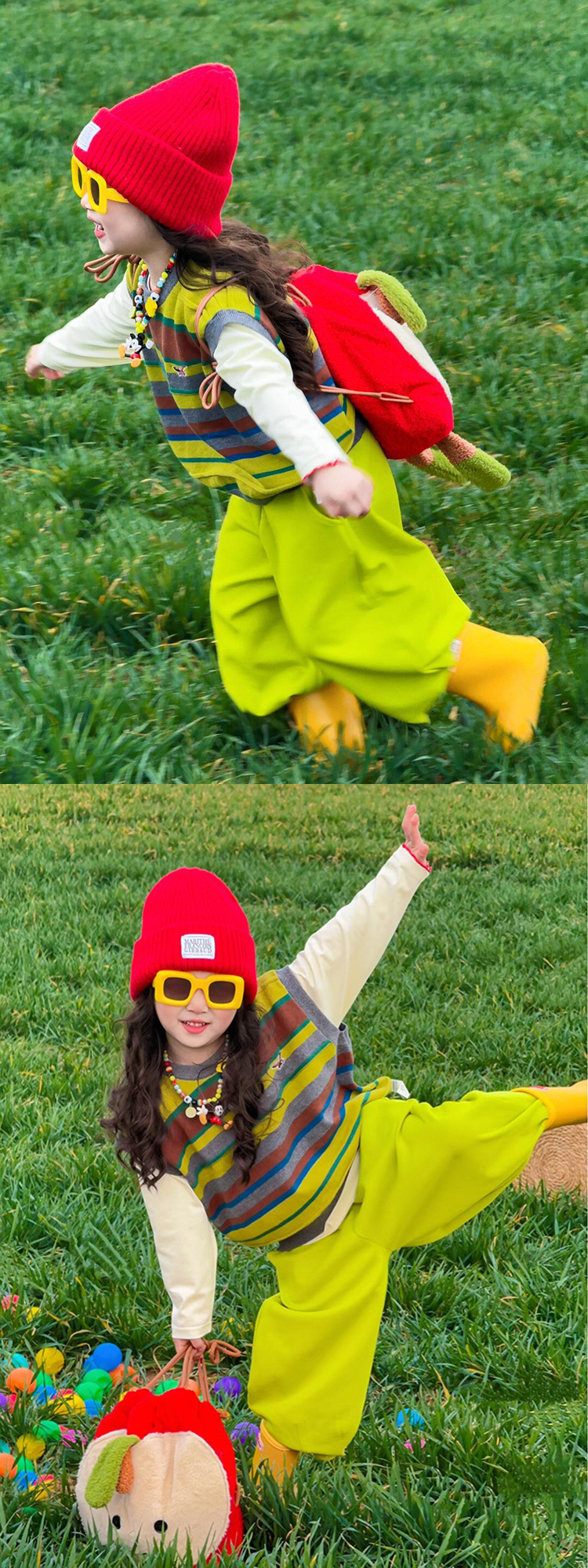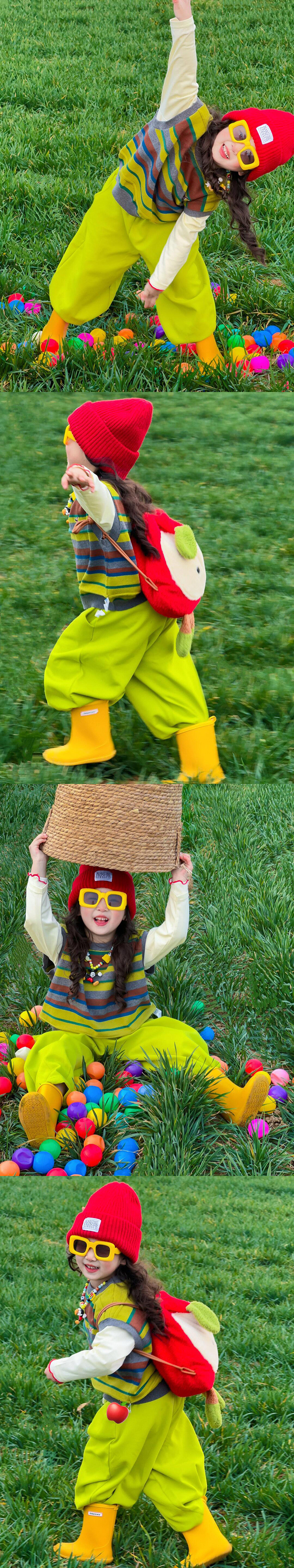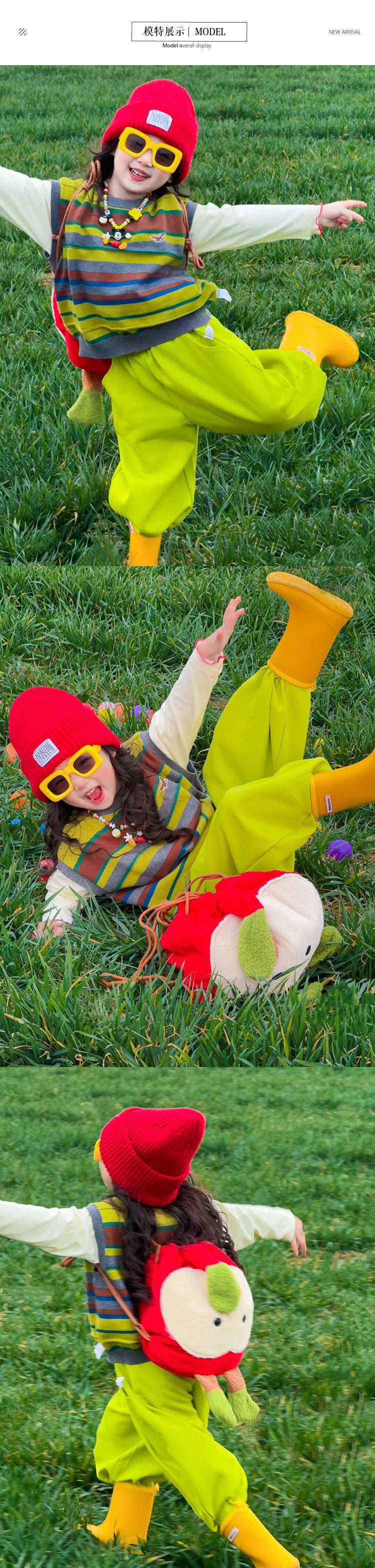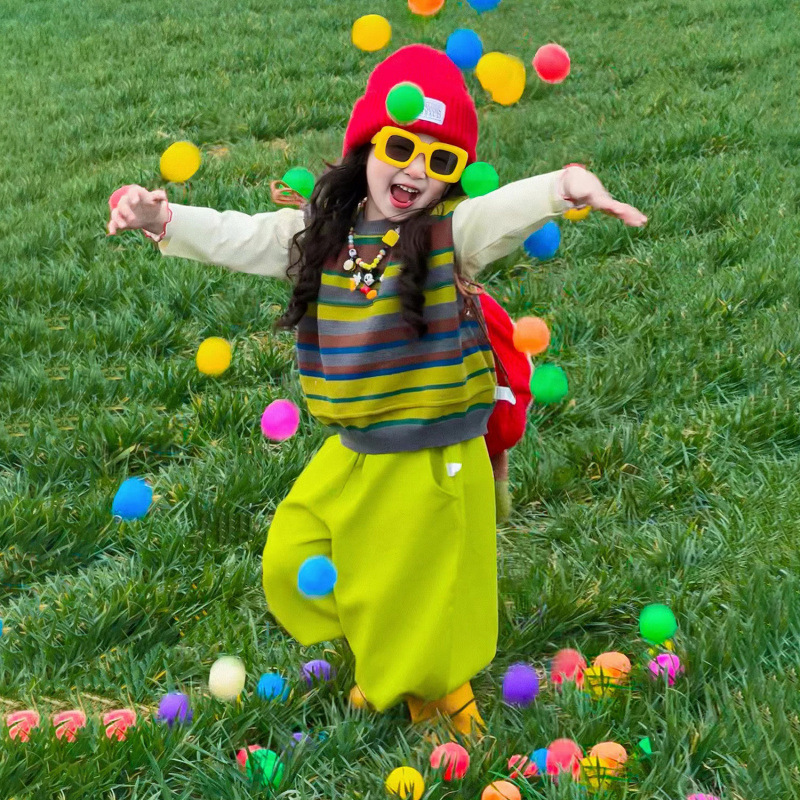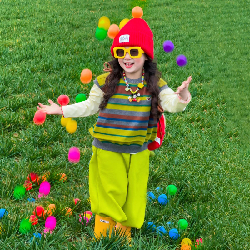 한국 아동복 2025 봄 새로운 빈티지 스트라이프 자수 조끼 소년 소녀 도파민 조끼 녹색 바지스토어 가기