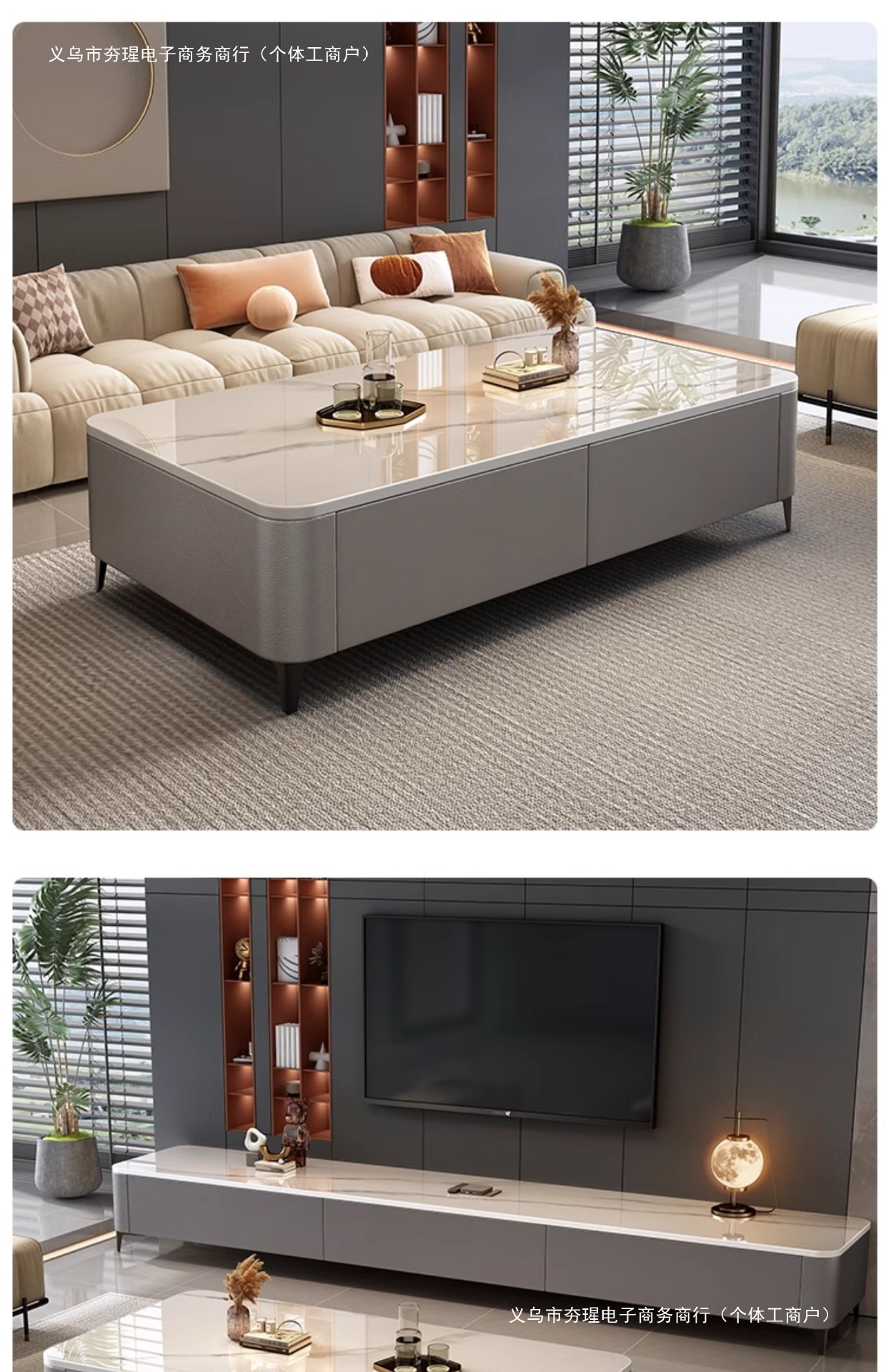 • [설치 불필요] 1.4m 더블 커피 테이블 + 2.0m TV 캐비닛 (유광 빅 그레이 + 그레이 캐비닛 소프트 패키지)