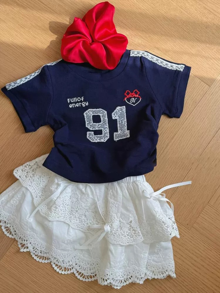[재고 있음] 2025 여름 새 스타일 소녀 레이스 디지털 반팔 티셔츠 아동용 다목적 서양식 탑 대외 무역