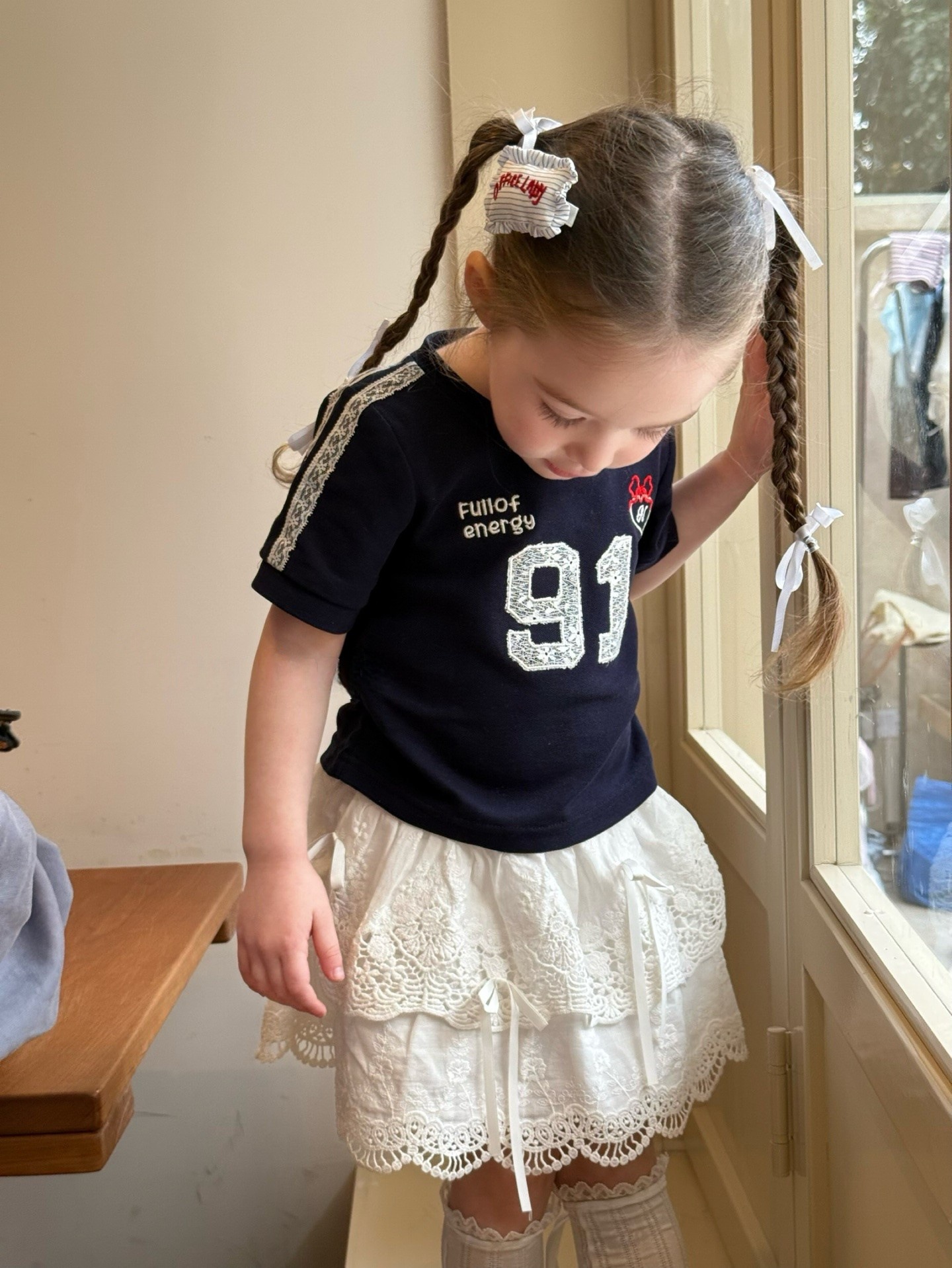 [재고 있음] 2025 여름 새 스타일 소녀 레이스 디지털 반팔 티셔츠 아동용 다목적 서양식 탑 대외 무역스토어 가기