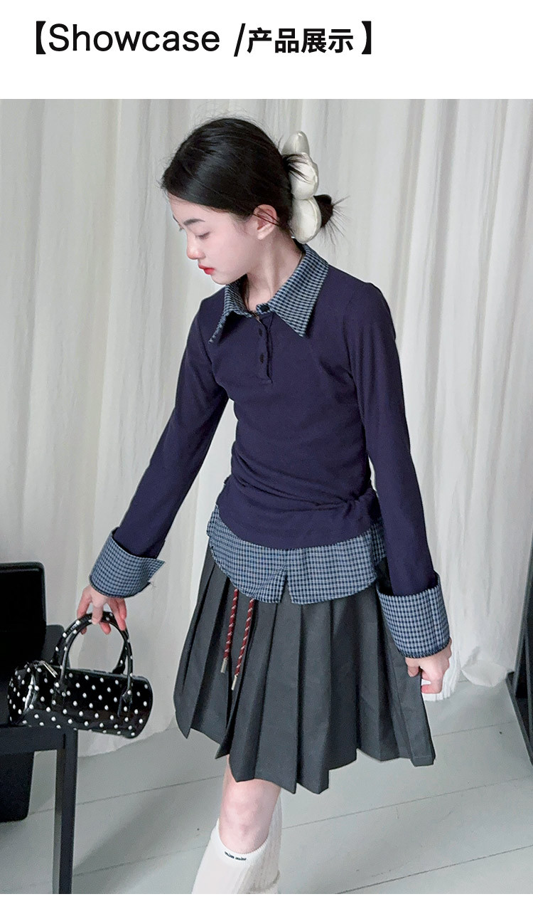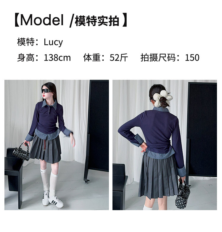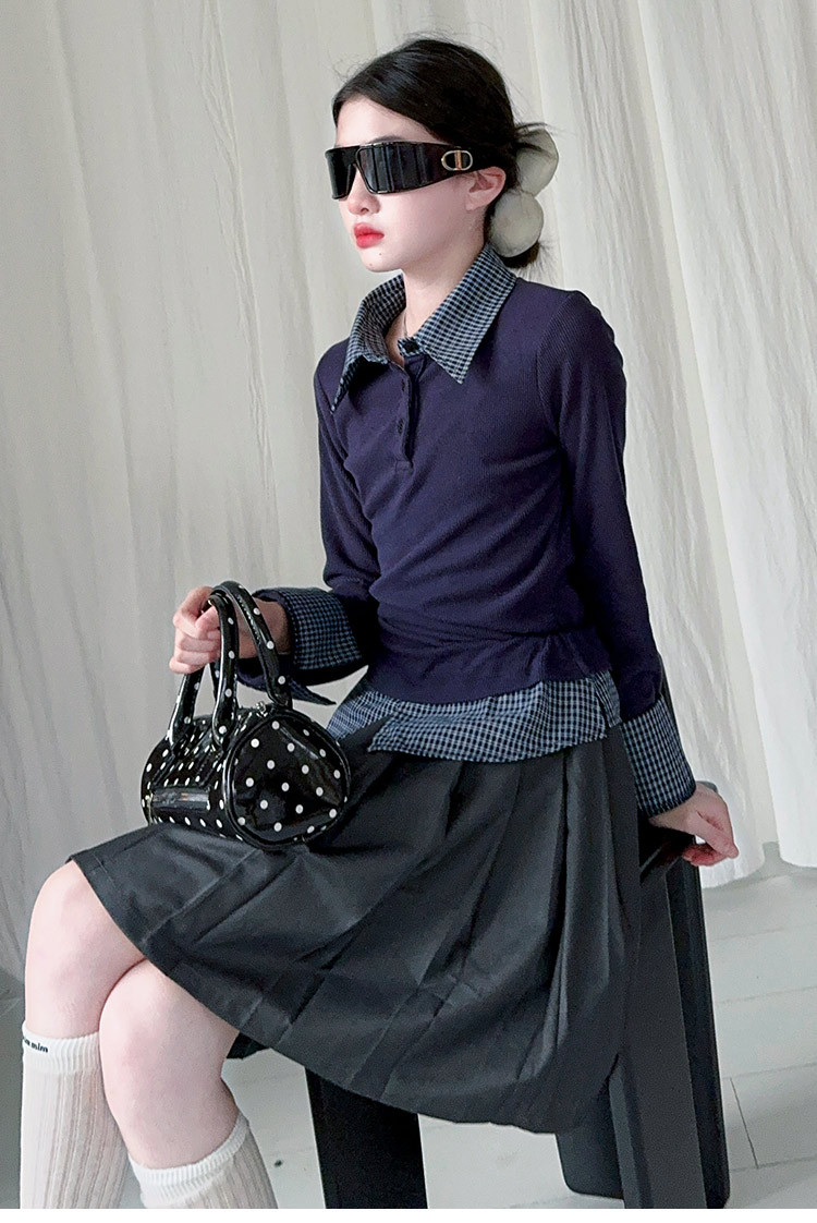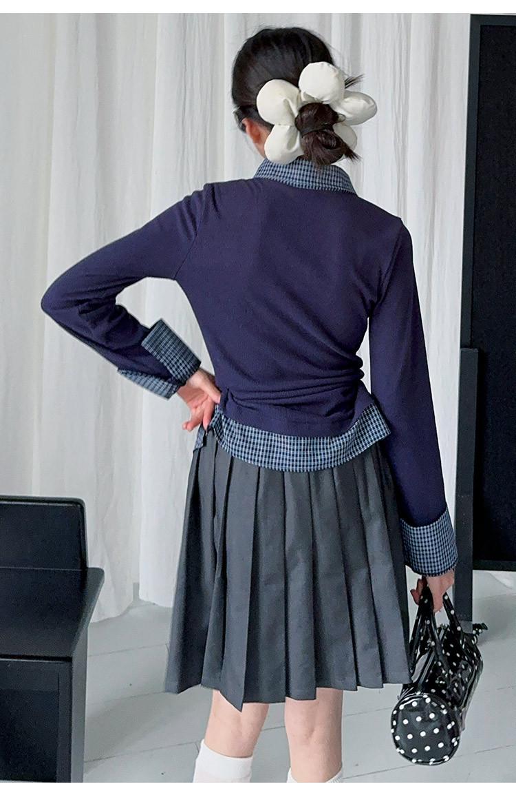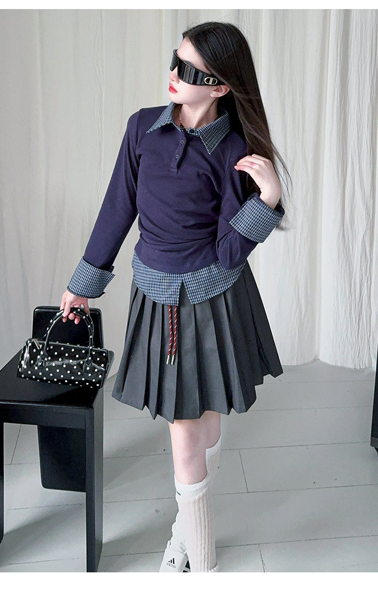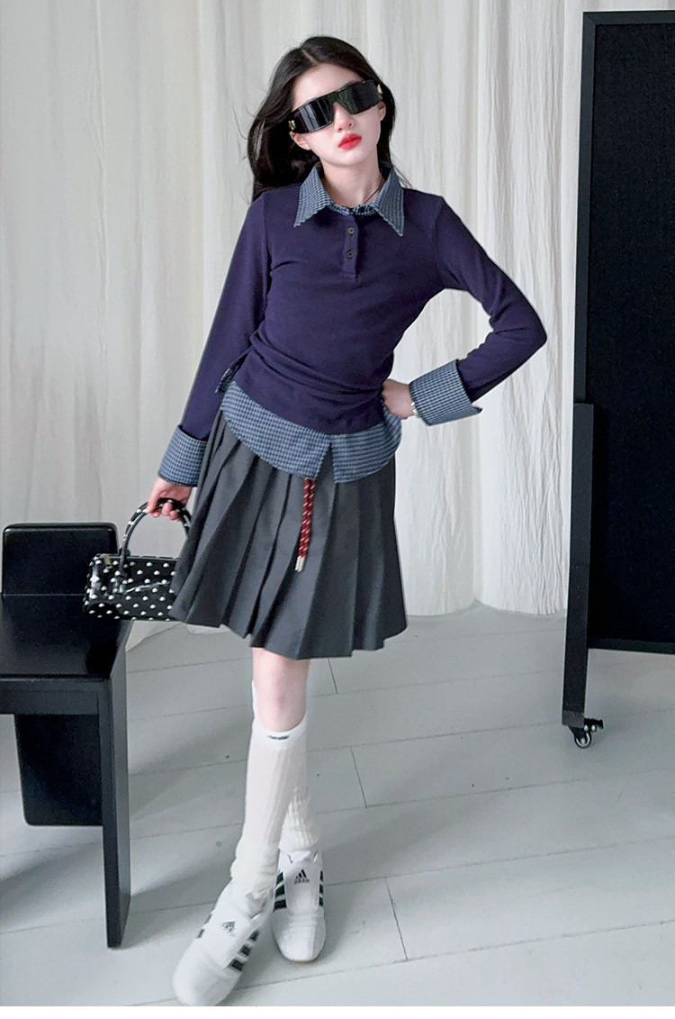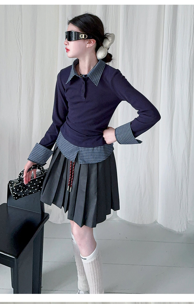 여자 봄 세트 도매 2025 새로운 미국 스타일의 대학 스타일 가짜 두 조각 스티칭 셔츠 긴 소매 주름 치마 조수스토어 가기